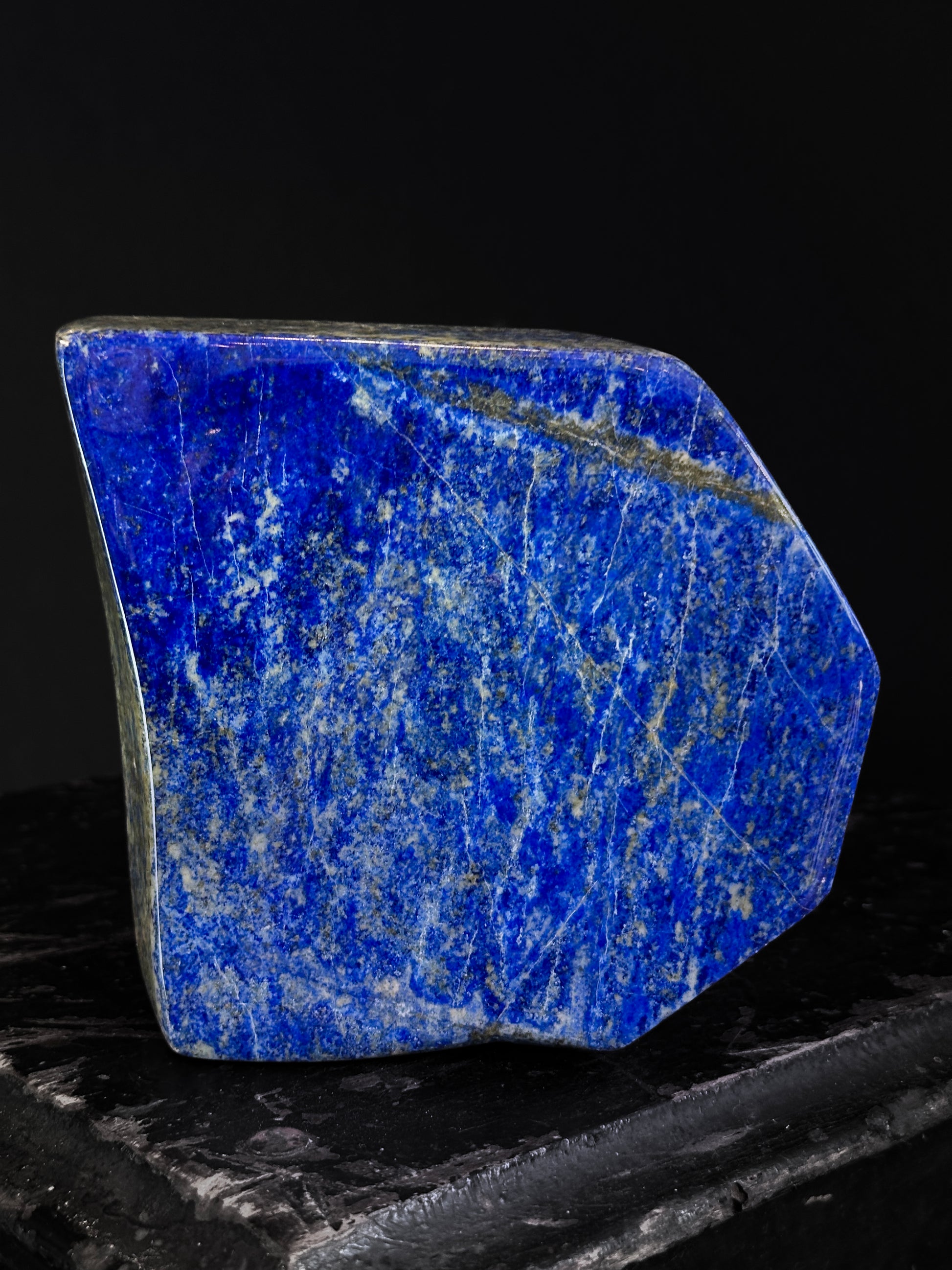 This polished block reveals all the mineral richness of lapis lazuli, between intense azure brilliance and metallic sparkles. A raw and elegant piece, it is equally suitable as a decorative object or as a specimen for a mineralogical collection.