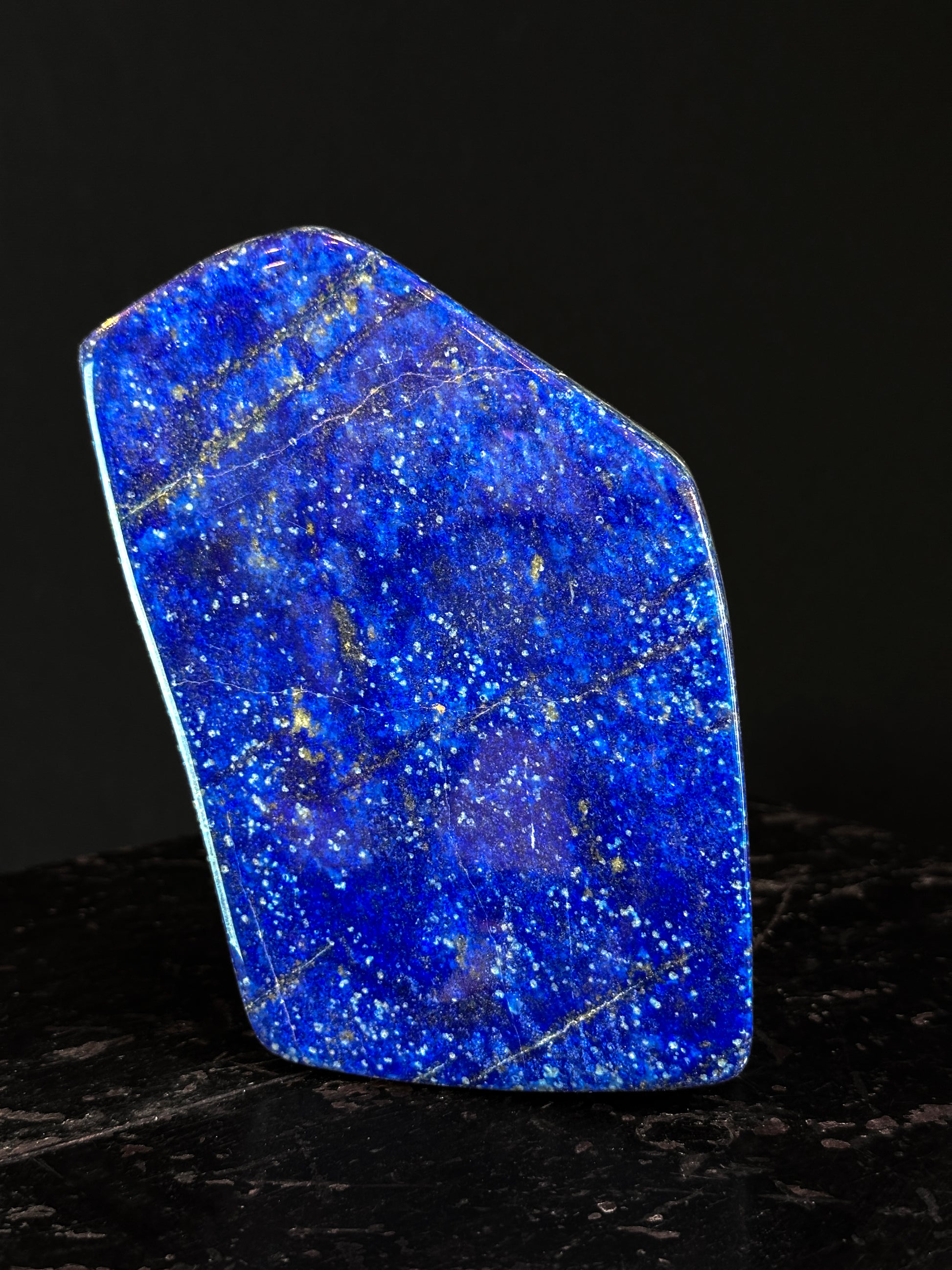 This polished block reveals all the mineral richness of lapis lazuli, between intense azure brilliance and metallic sparkles. A raw and elegant piece, it is equally suitable as a decorative object or as a specimen for a mineralogical collection.