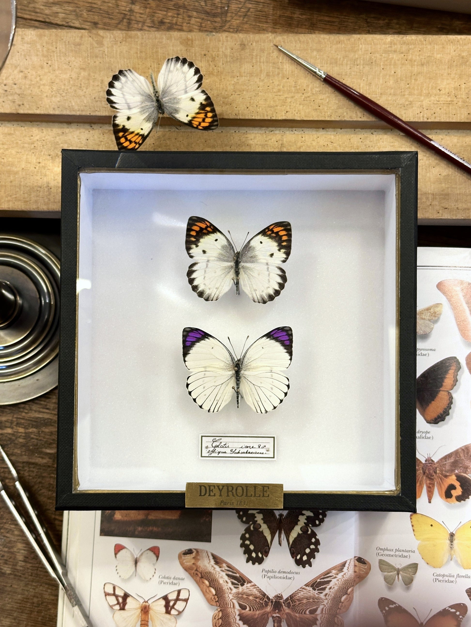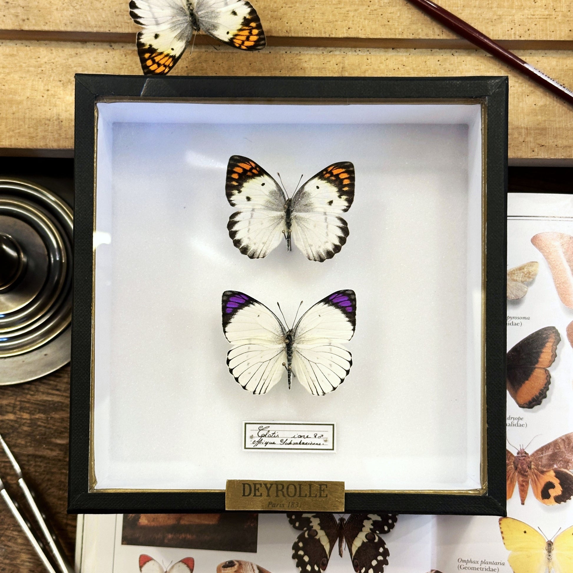 Very similar in appearance but nonetheless distinct, the male and female Colotis ione are differentiated by their delicate patterns and the color of their wingtips, each edged with fine black lace. The female is shown here at the top, the male at the bottom. These specimens illustrate the impressive sexual dimorphism sometimes observed in the Lepidoptera kingdom.