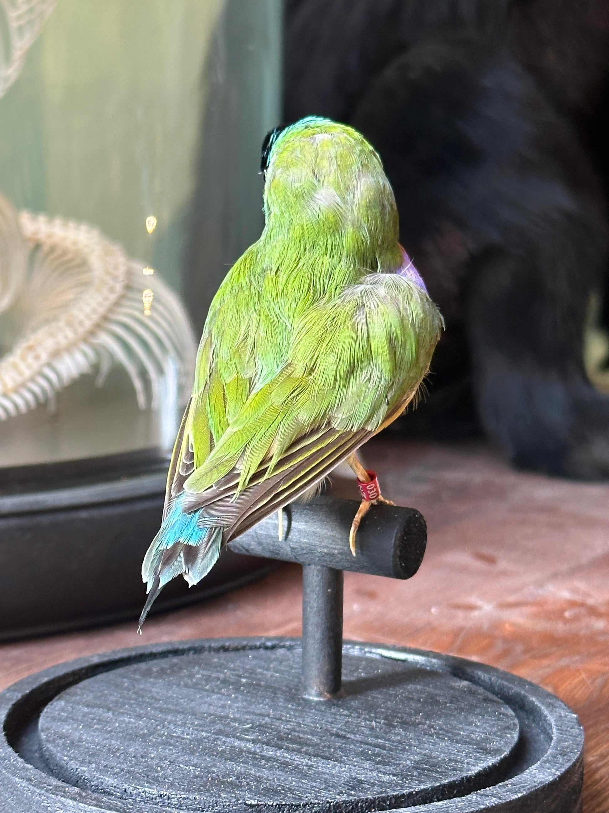 Under its glass dome, the Gould's Diamond displays a symphony of vibrant colors: a glowing orange mask, a black throat, a purple chest, a golden belly, and an emerald green back.