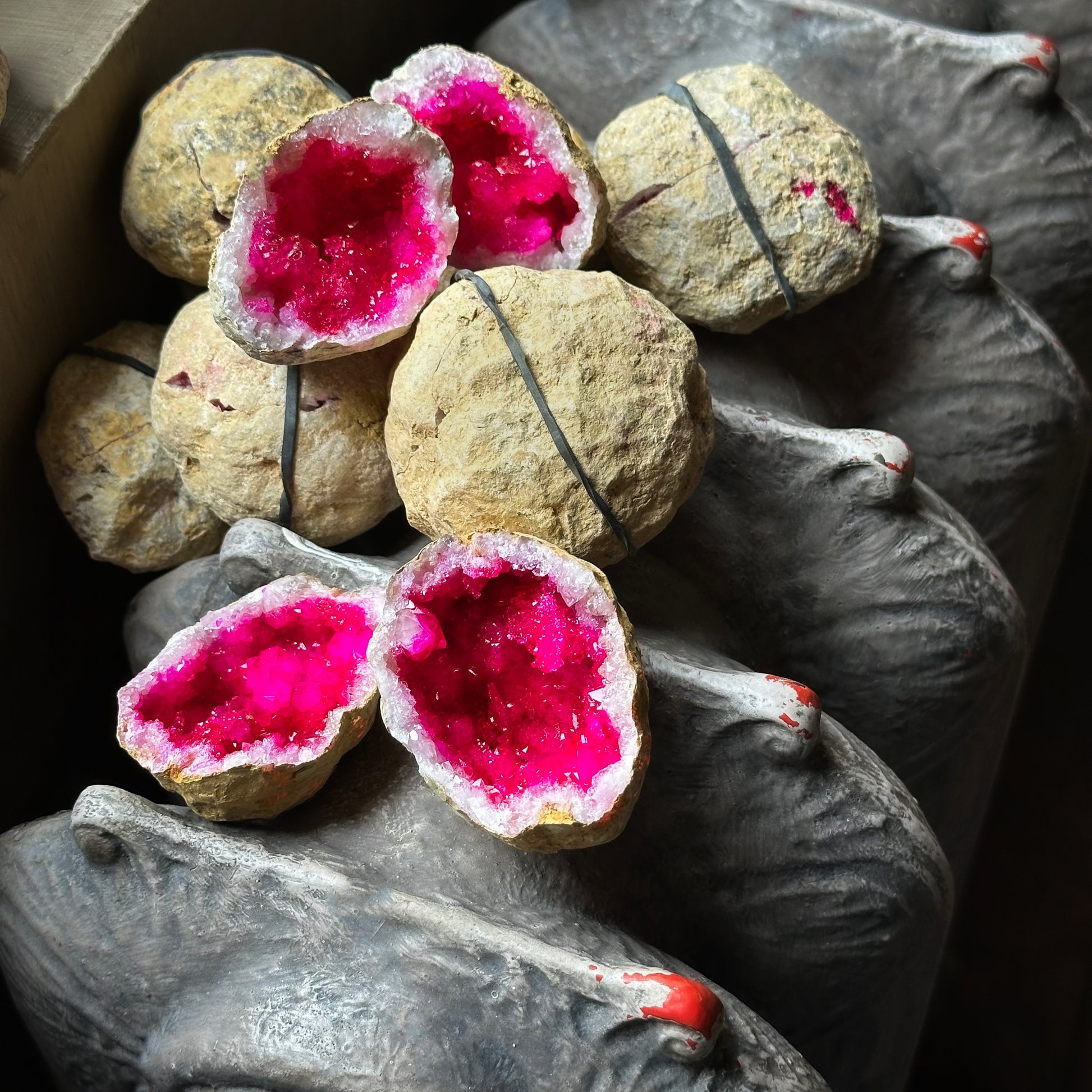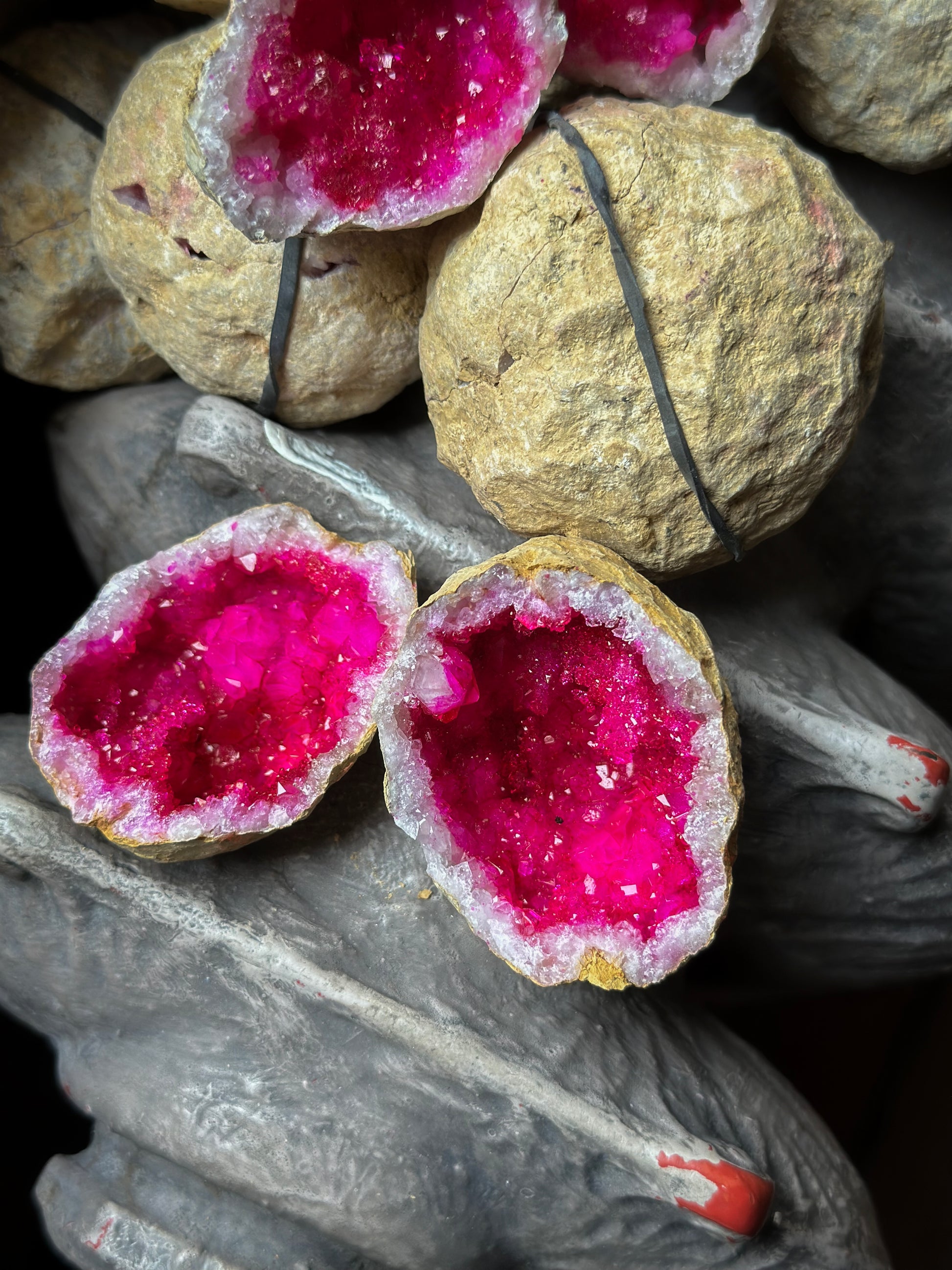 Beneath its discreet rocky appearance lies a dazzling universe. This geode opens onto a heart lined with shimmering quartz crystals, with intense pink reflections. A natural alchemy, quartz forms in the cavities of volcanic rocks and slowly grows crystals that capture and reflect the light.