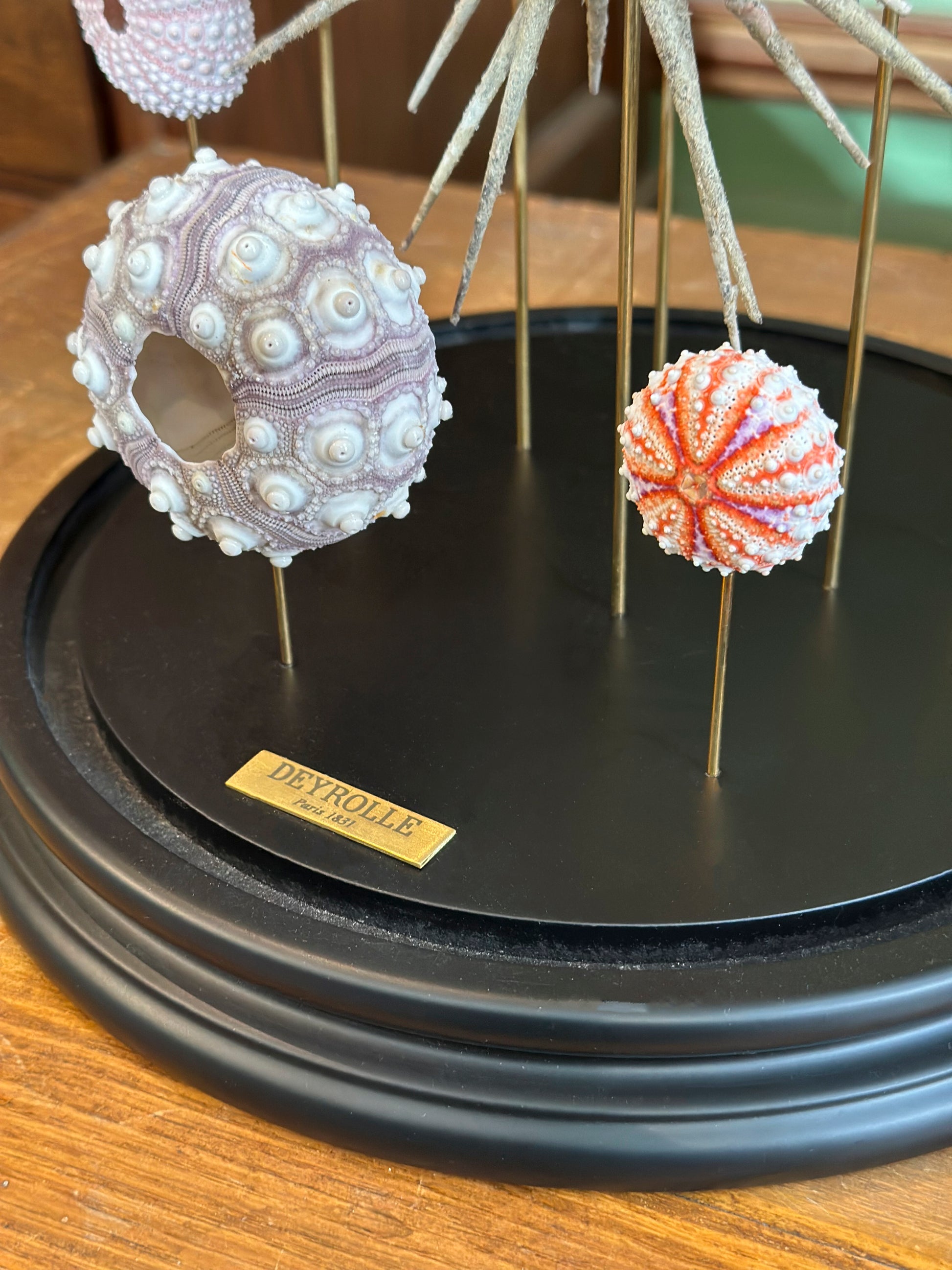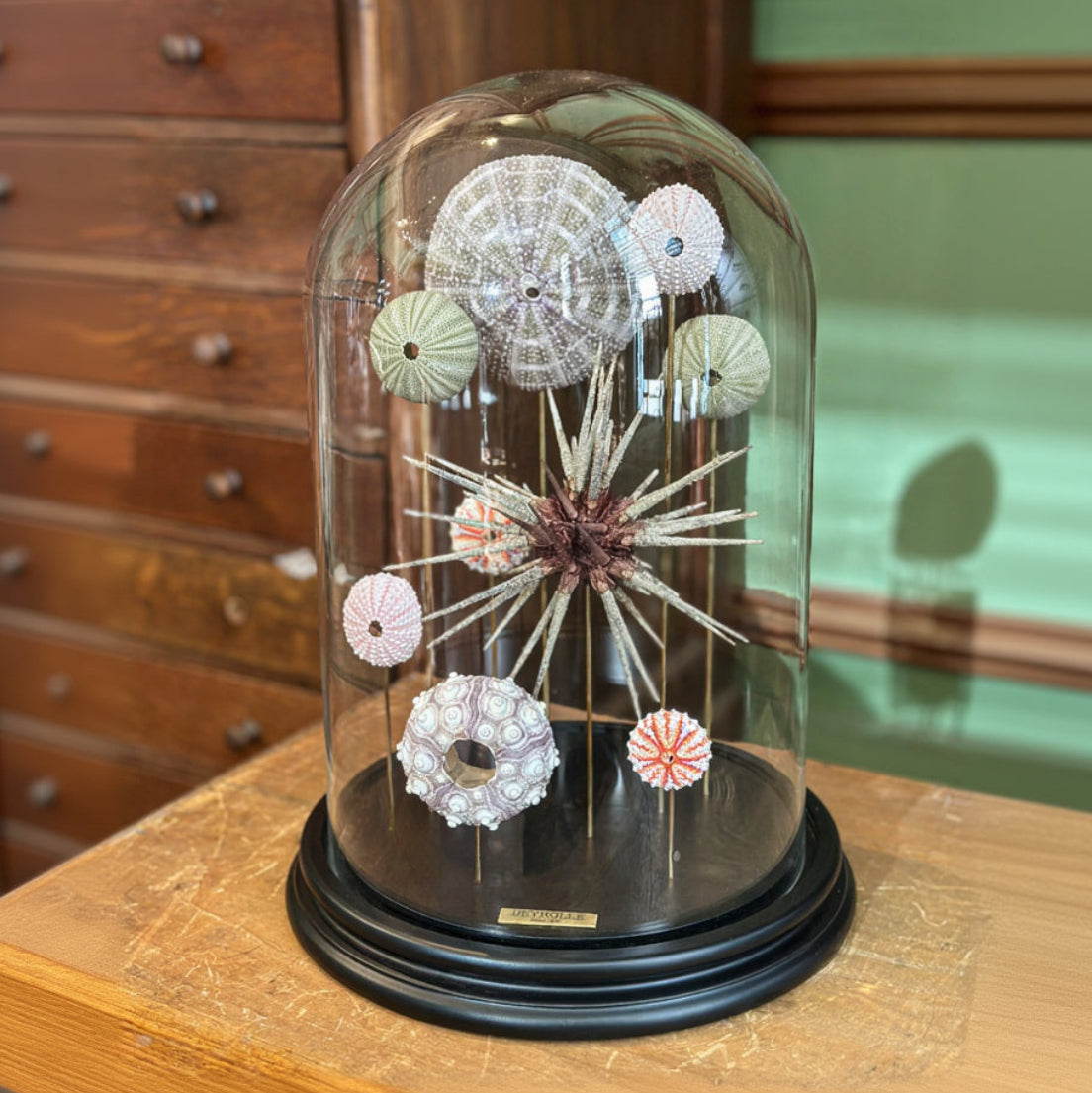 Ce globe réunit neuf oursins soigneusement sélectionnés et assemblés selon le savoir-faire naturaliste de Deyrolle. Présentés comme une étude de formes et de couleurs marines, ils composent un ensemble graphique inspiré des cabinets de curiosités.