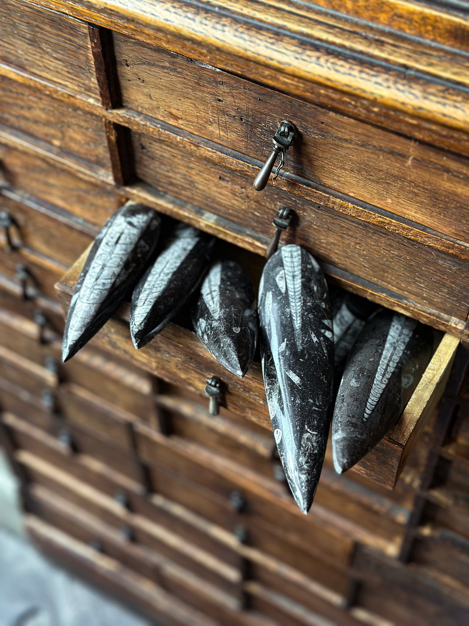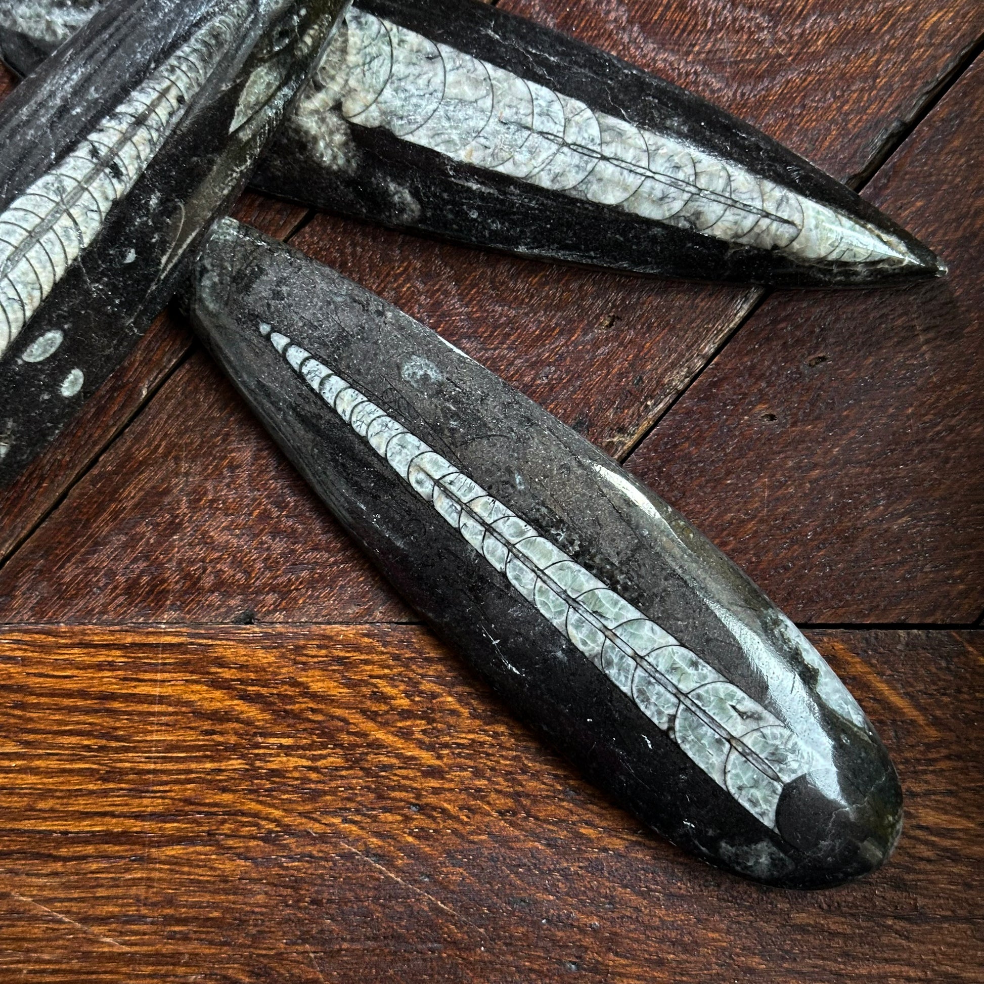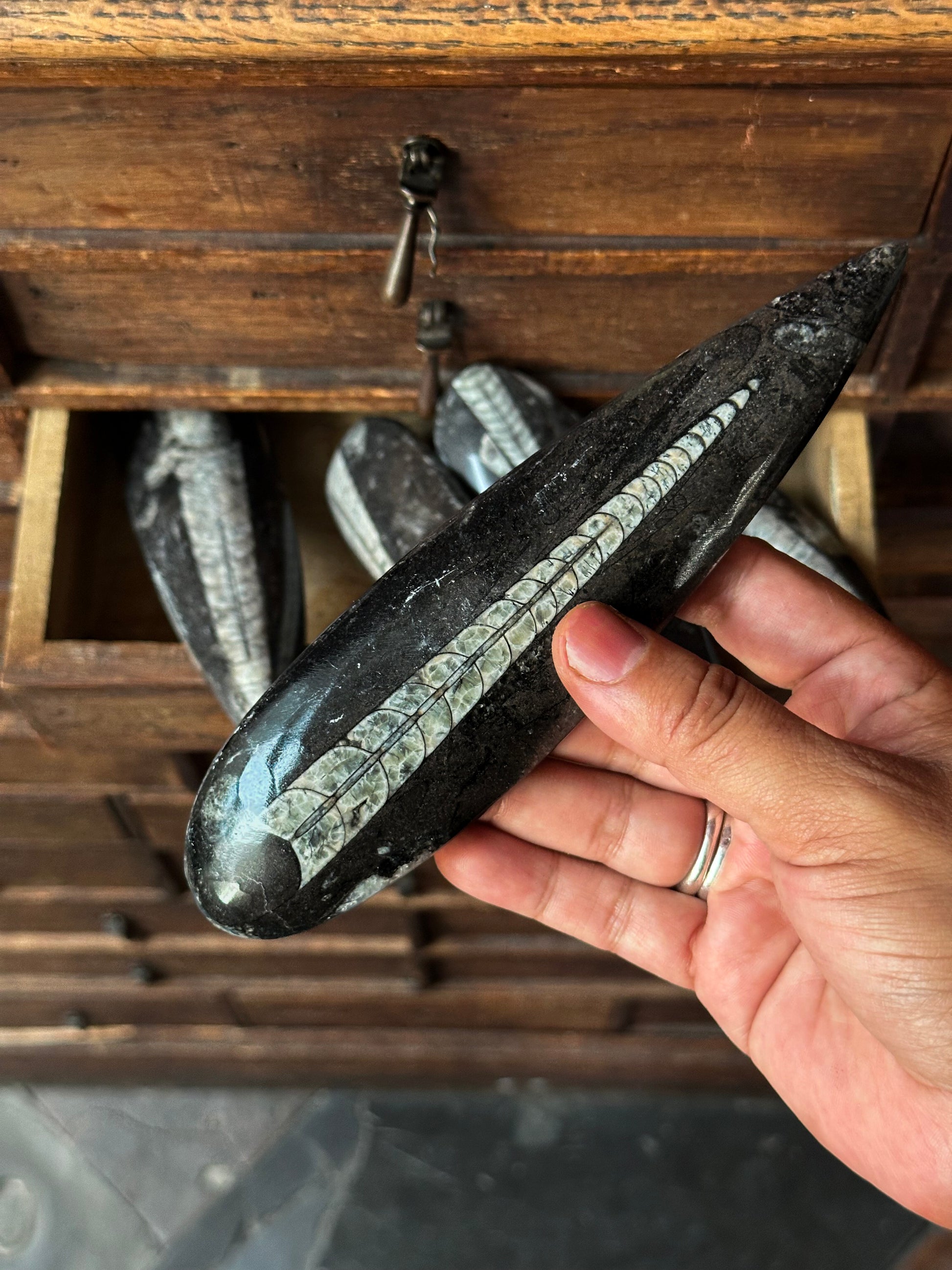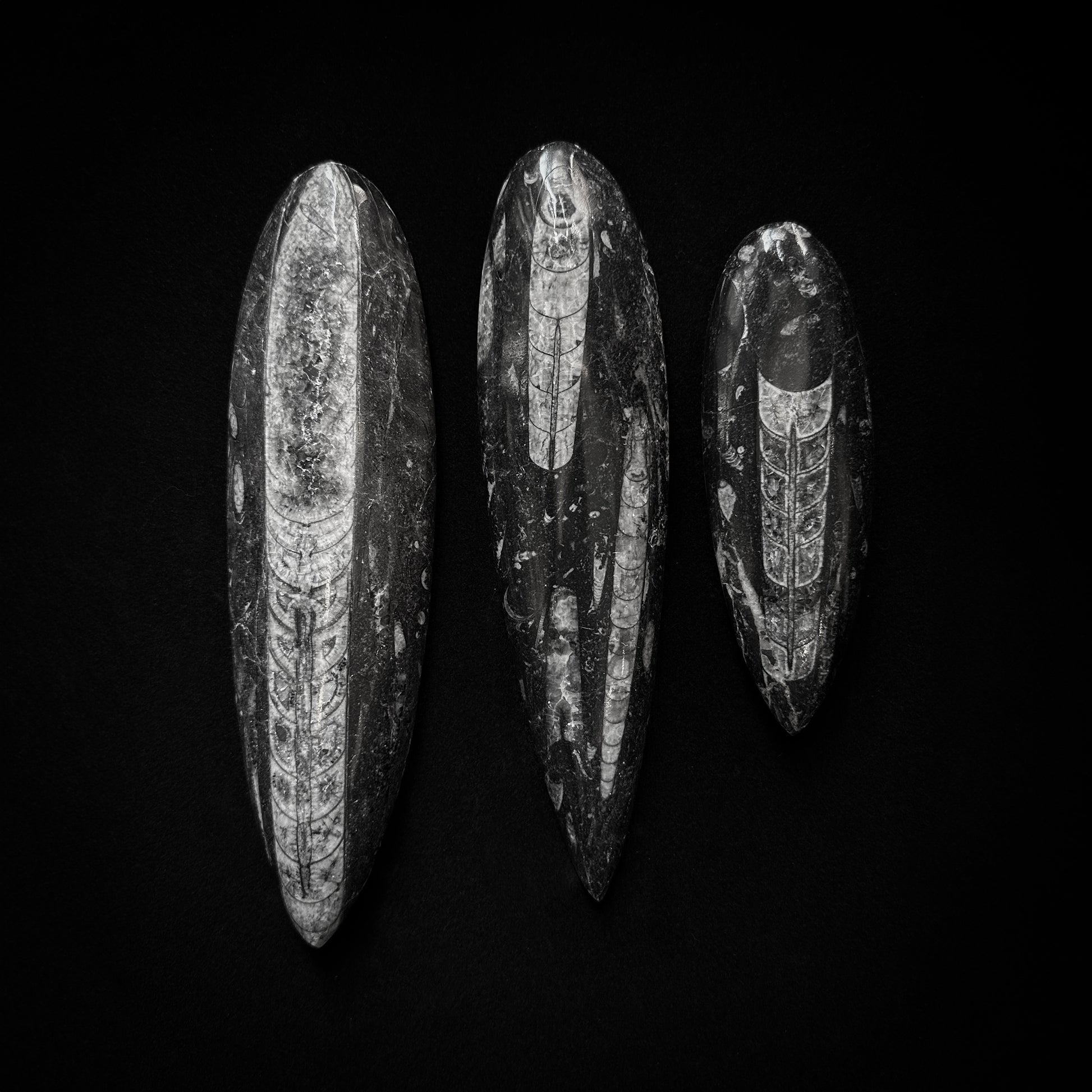 Here, fossilization has frozen their streamlined silhouette in a polished black stone that highlights the contrast of the light shell. A true natural sculpture, this specimen appeals to both natural science enthusiasts and lovers of unique decorative objects. Each piece is unique, combining scientific rigor and timeless aesthetics. A collector's item that tells the ancient story of life and invites us to contemplate the beauty of the forms created by nature.