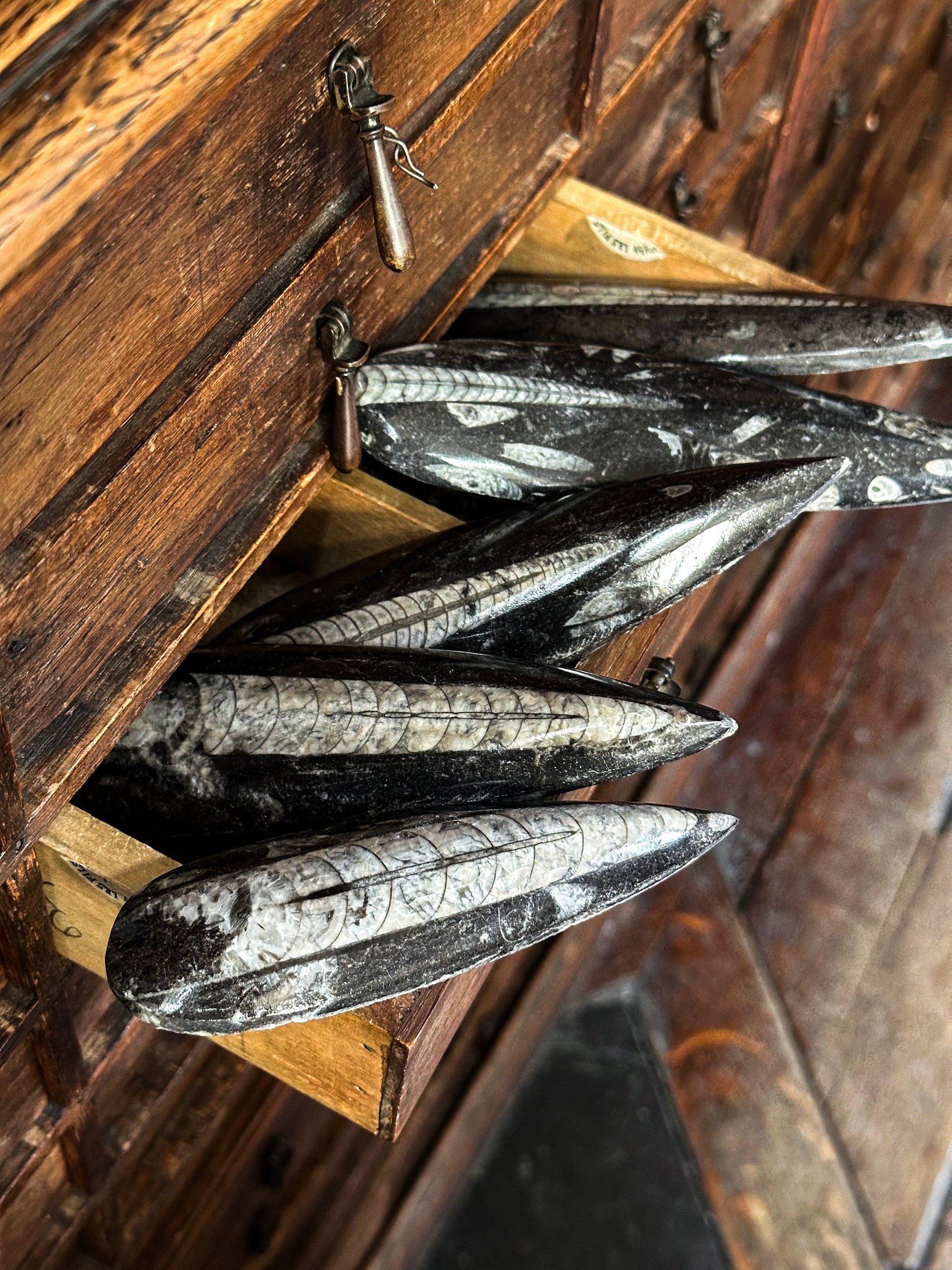 A remnant of a marine world more than 350 million years old, orthocera were primitive cephalopods, distant ancestors of modern squid and cuttlefish. Their elongated shell, divided into successive chambers, allowed them to control their buoyancy and explore the depths.