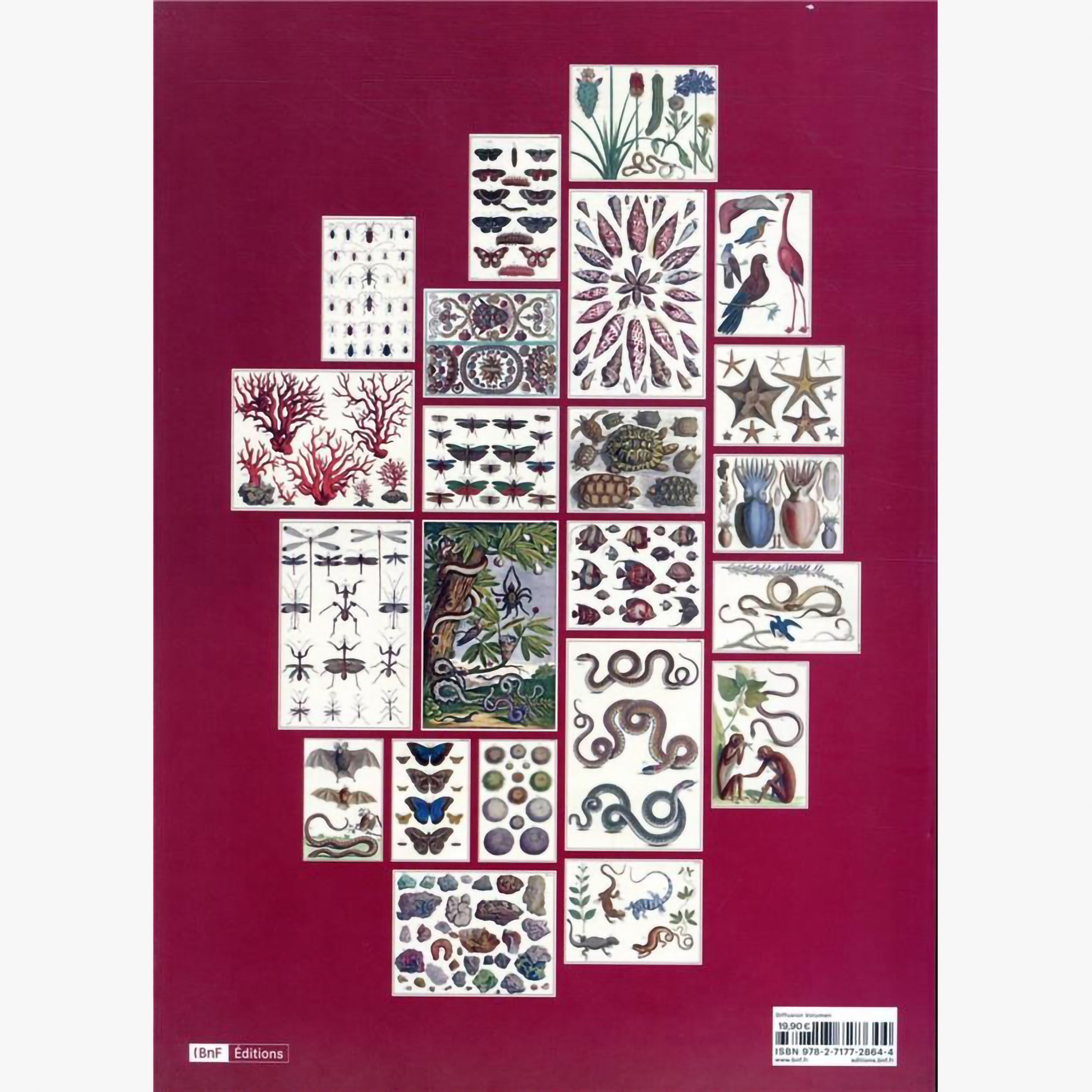 Published in the 18th century, the catalog of Albertus Seba's cabinet of curiosities is one of the most valuable natural history works of its time, on the border between art and science. 22 plates of mammals, birds, snakes, insects, corals, and even shells, are skillfully arranged in this book, detachable and ready to be framed to form splendid decorative patterns...