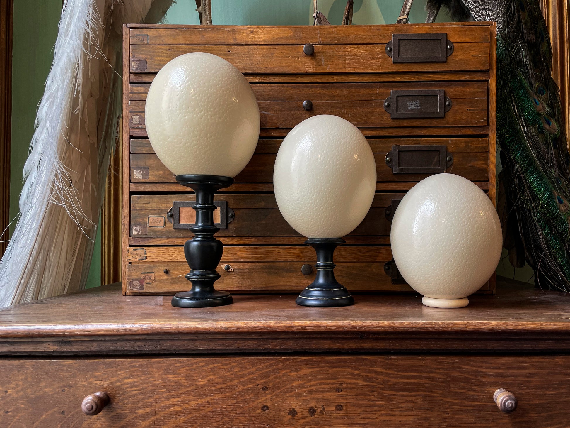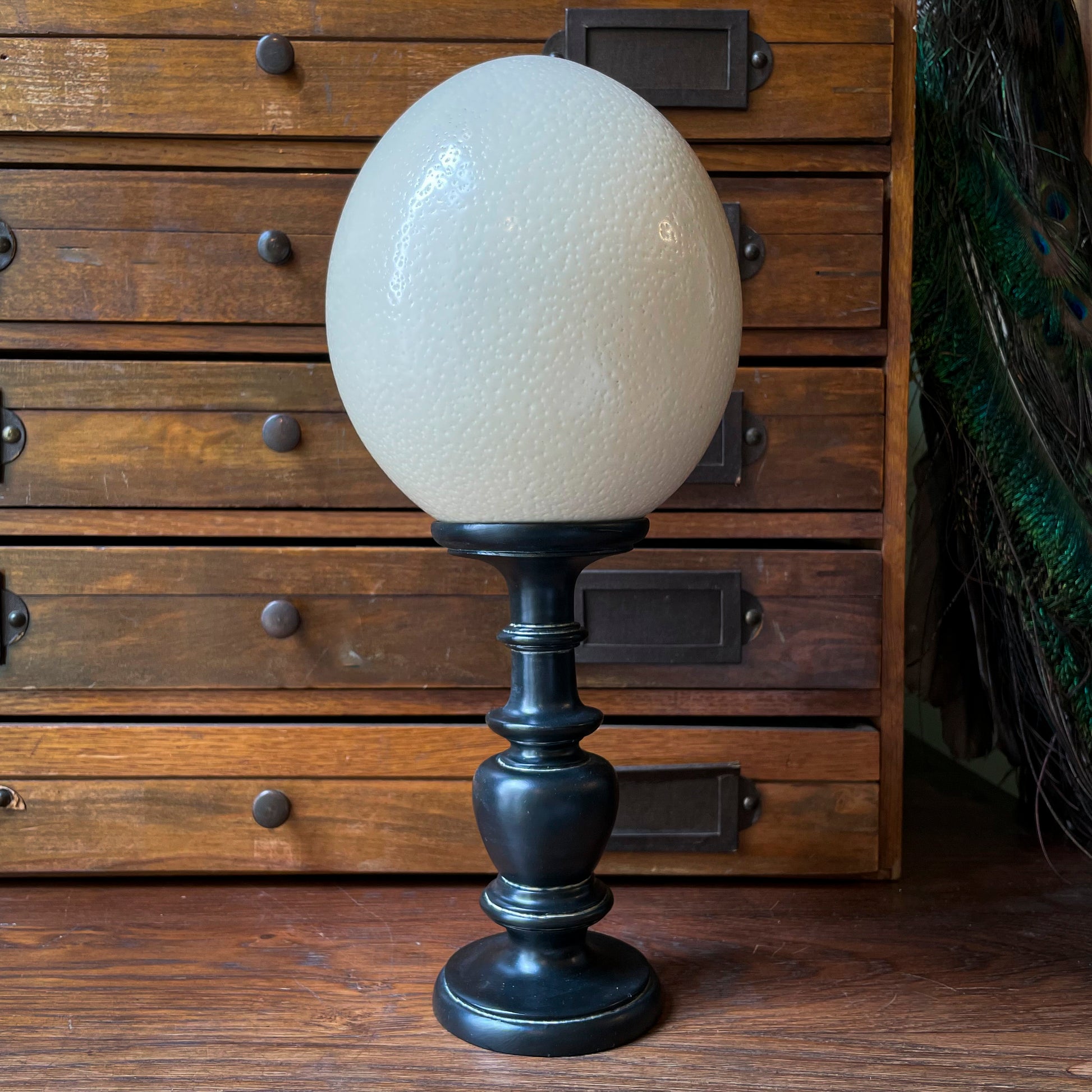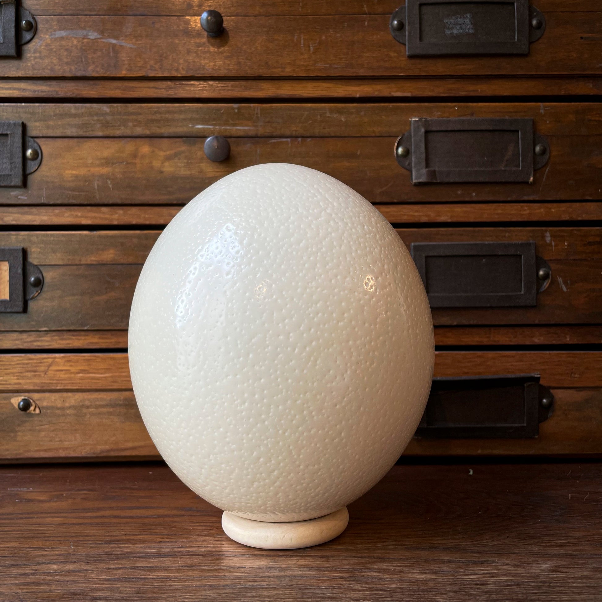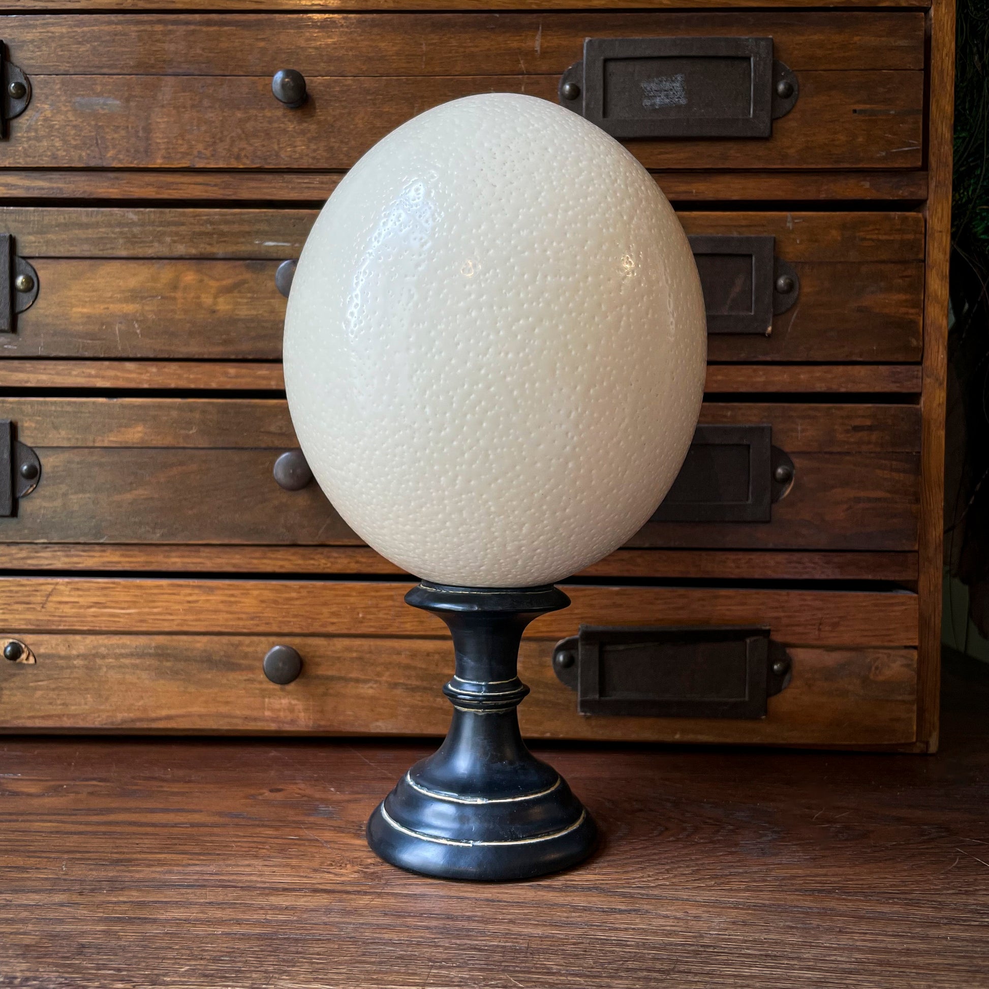 Our standard chicken eggs look pale in comparison to these magnificent ostrich eggs. Their textured surface and size are what make them unique. Often measuring between 15 and 17cm, they are more suited to attractive stands than to narrow egg cups. On their dark wooden perches, they may resemble a type of bobbin. However, we strongly advise against using them for this purpose. They are also available in their simplest form, without a stand and with a simple support to keep them upright.