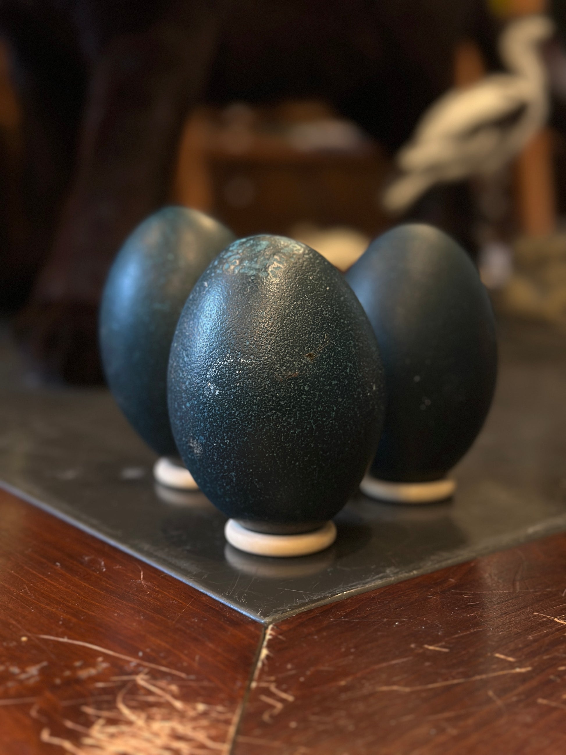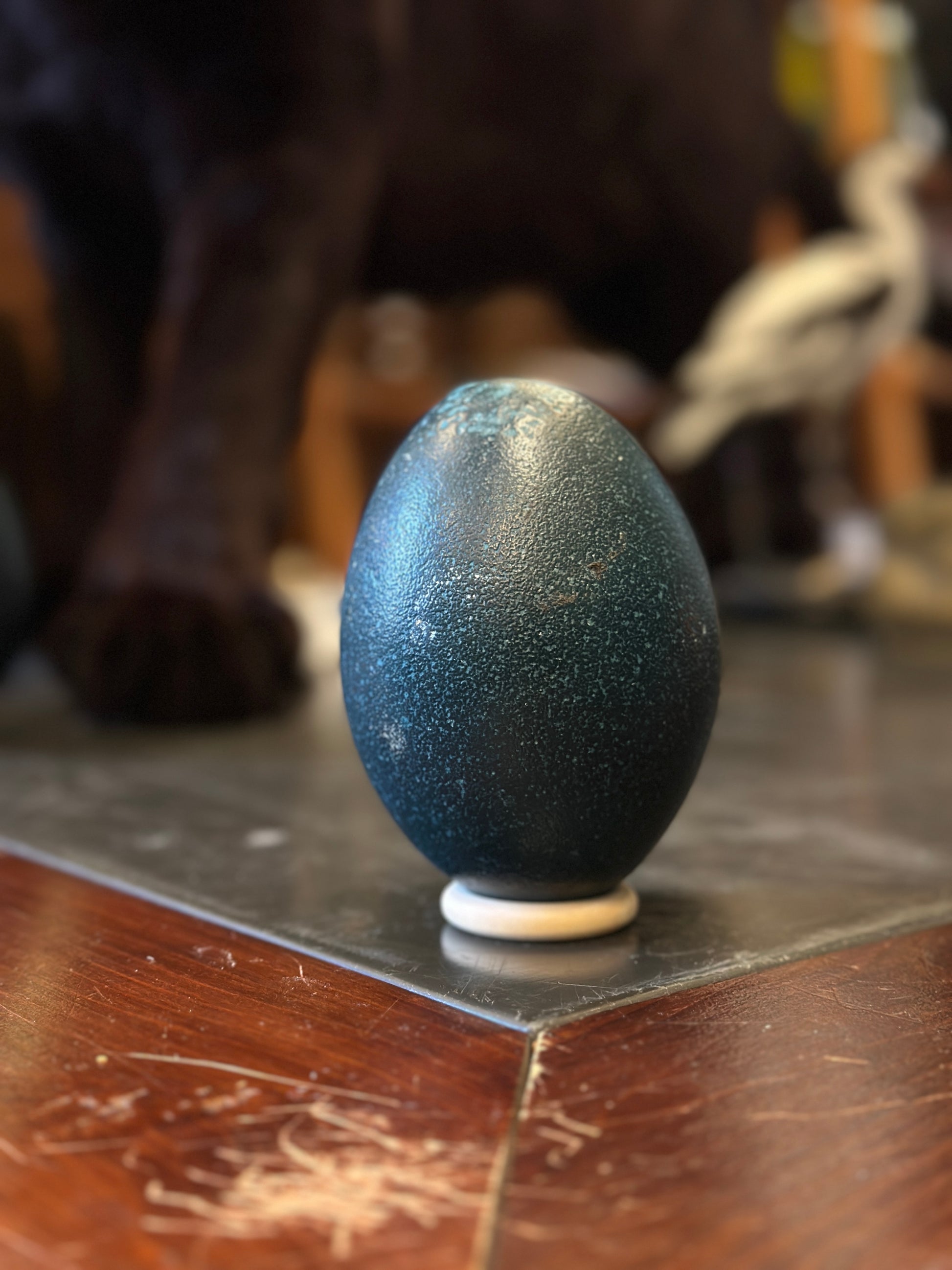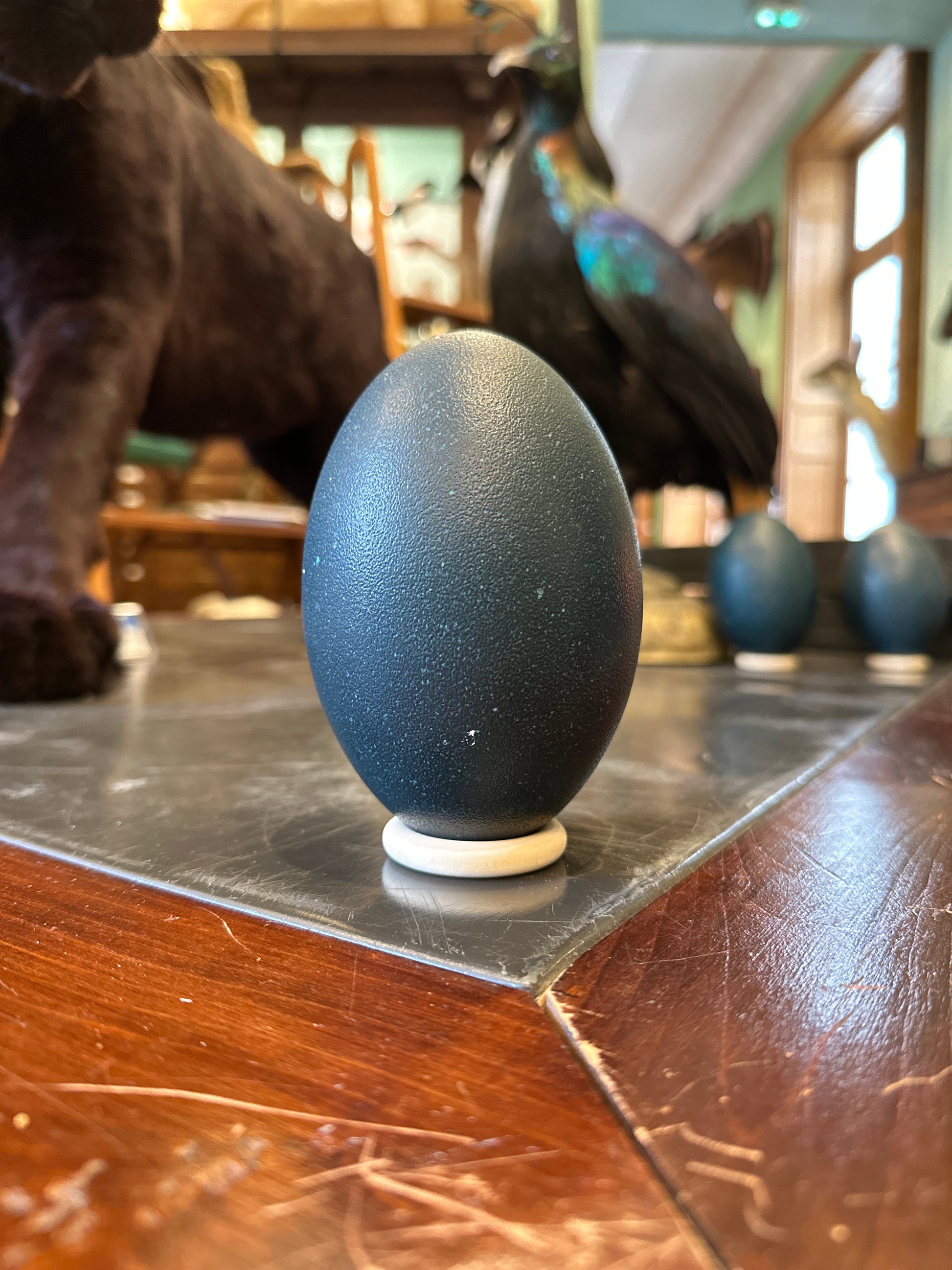 The emu egg is distinguished by its large size and its unique colour, an intense dark green, sometimes tending towards black. This deep shade is not uniform: looking closely, one notices a slightly grainy and marbled surface, composed of several layers of shades ranging from emerald green to midnight blue. The shell, extremely strong, can reach several millimetres thick, offering effective protection against predators. The emu ( Dromaius novaehollandiae ) is an emblematic bird of Australia and the second largest bird in the world after the ostrich.