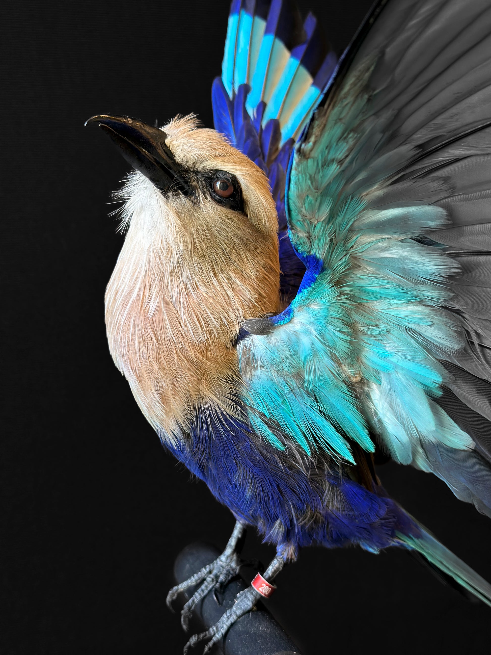 Ce Rollier à ventre bleu, naturalisé ailes largement déployées, révèle toute la magnificence chromatique propre à la famille des Coraciidés, ces oiseaux emblématiques des savanes africaines. Son plumage expose un éventail de bleus profonds, turquoises et outremer, contrastant avec la teinte chamois pâle de la tête et de la poitrine.