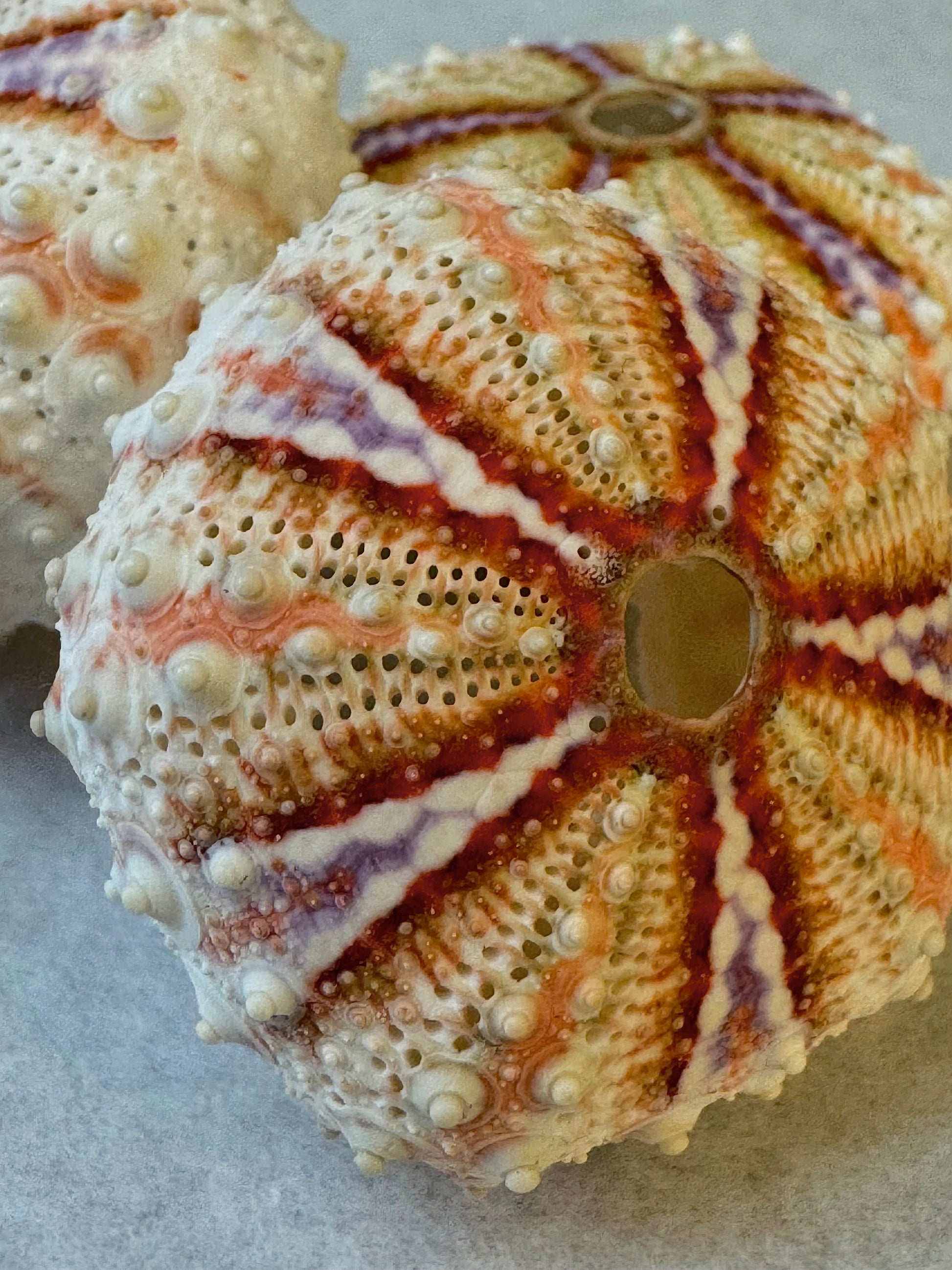 Their vibrant colors give the illusion of a delicately hand-decorated object... and yet, in Indonesian waters, this sea urchin remains virtually inaccessible to humans! It lives at impressive depths, between 100 and 500 meters below the surface, and protects itself with long spines (the radioles) with red and white rings, echoing the patterns on its skeleton. This contrast is all the more fascinating because it inhabits the darkness of the deep sea, where light never penetrates. A colorful adornment, visible only to it, like a secret luxury of the abyss.