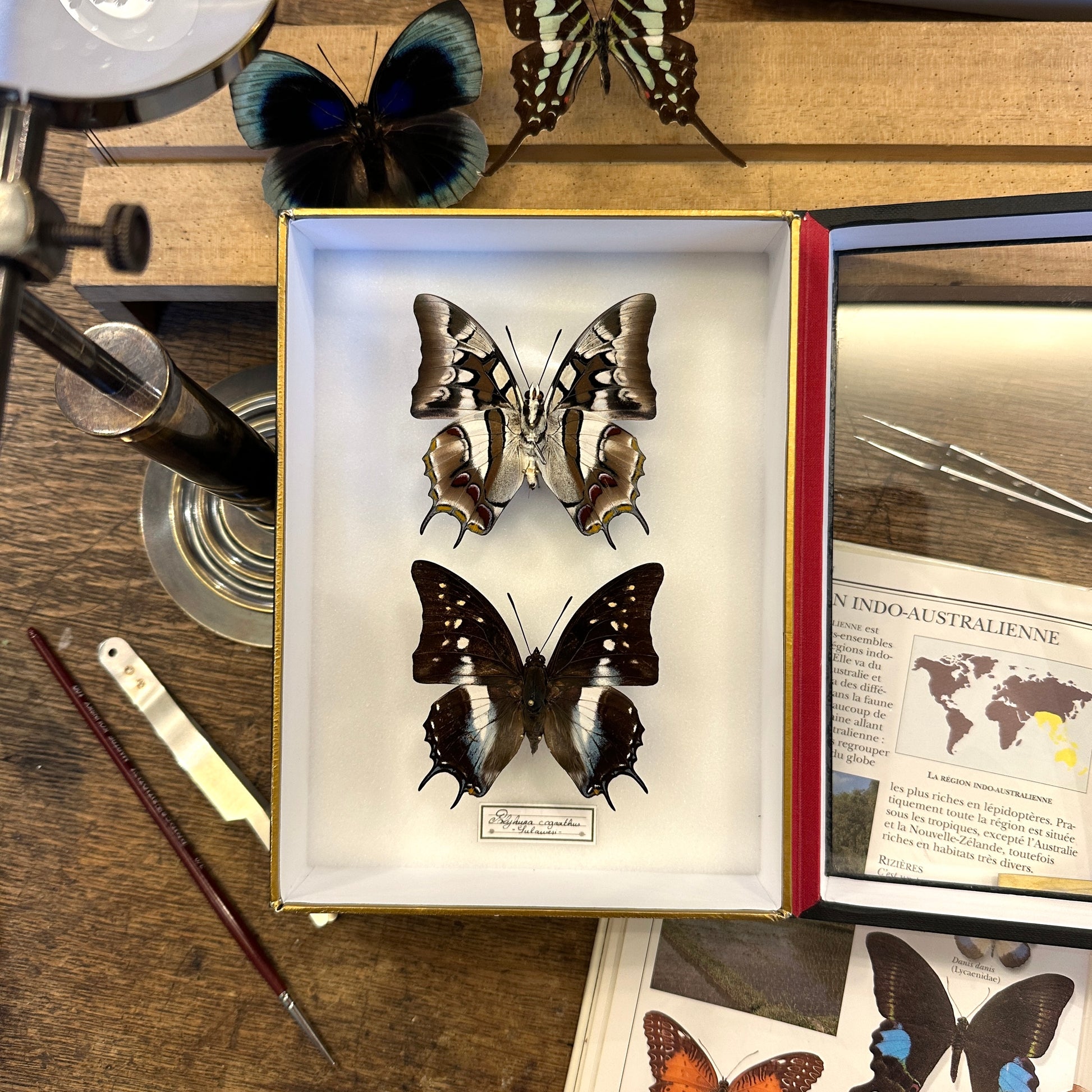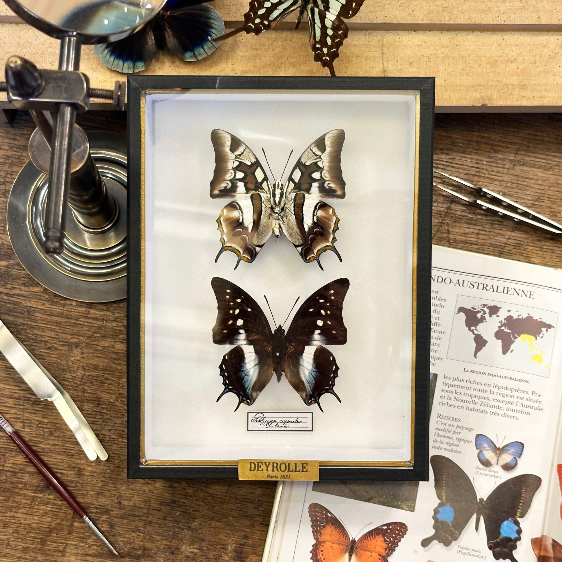 Originating from Indonesia, Polyura cognatus is distinguished by its elegantly cut wings and two characteristic long tails. Its brown upperparts, punctuated with white and bluish touches, contrast with a lighter and highly contrasting underside, offering two complementary faces of great graphic finesse.