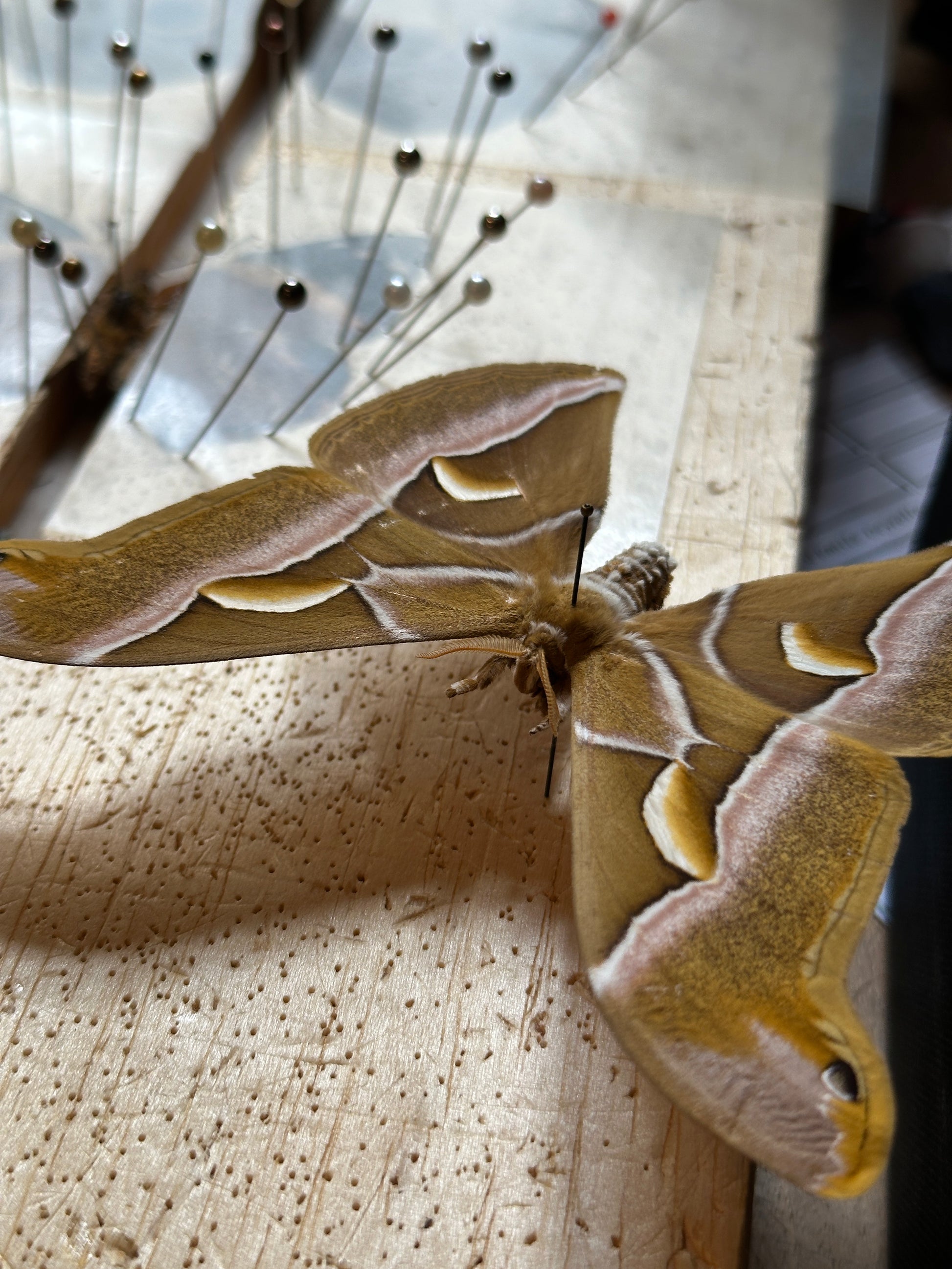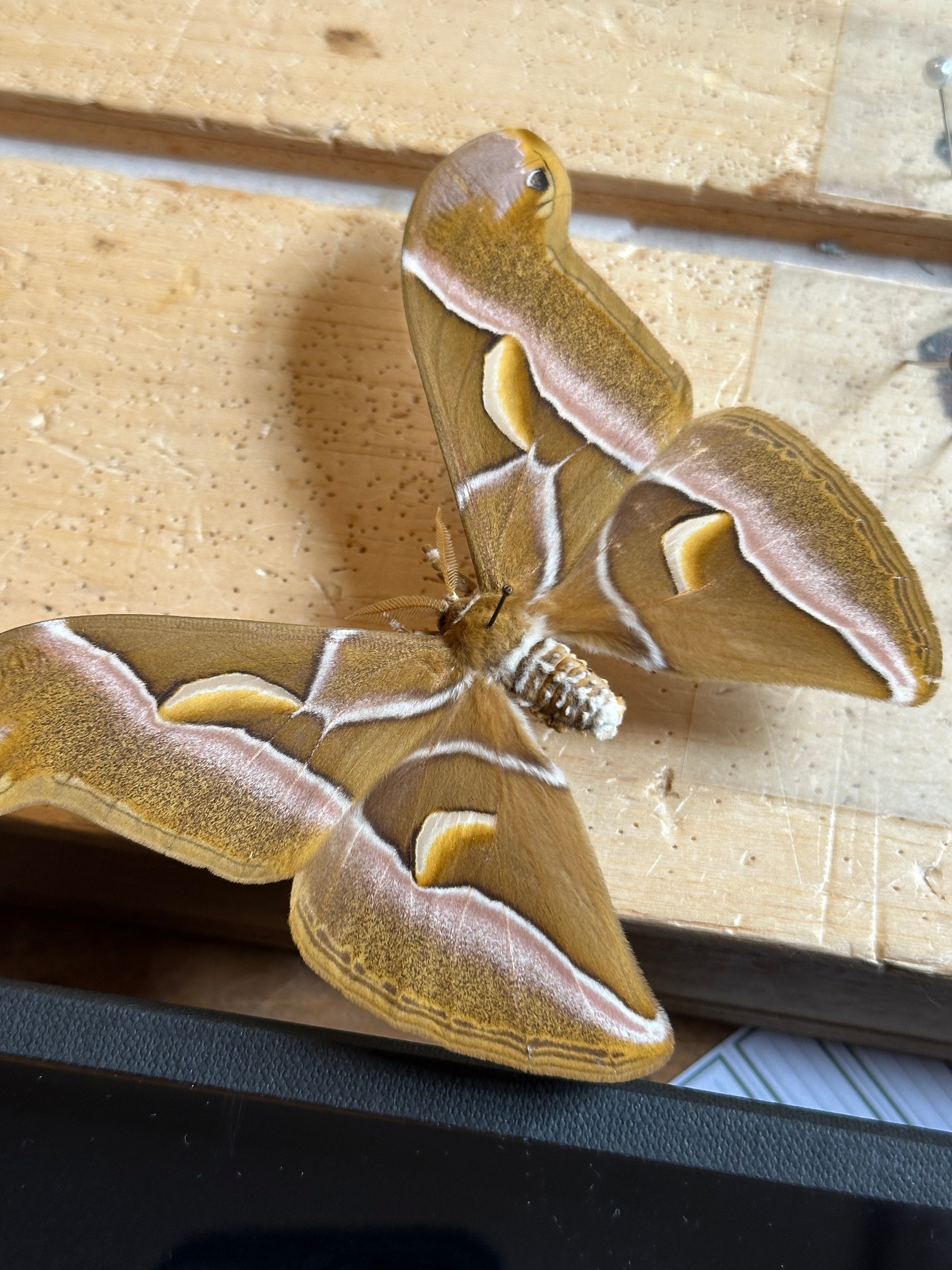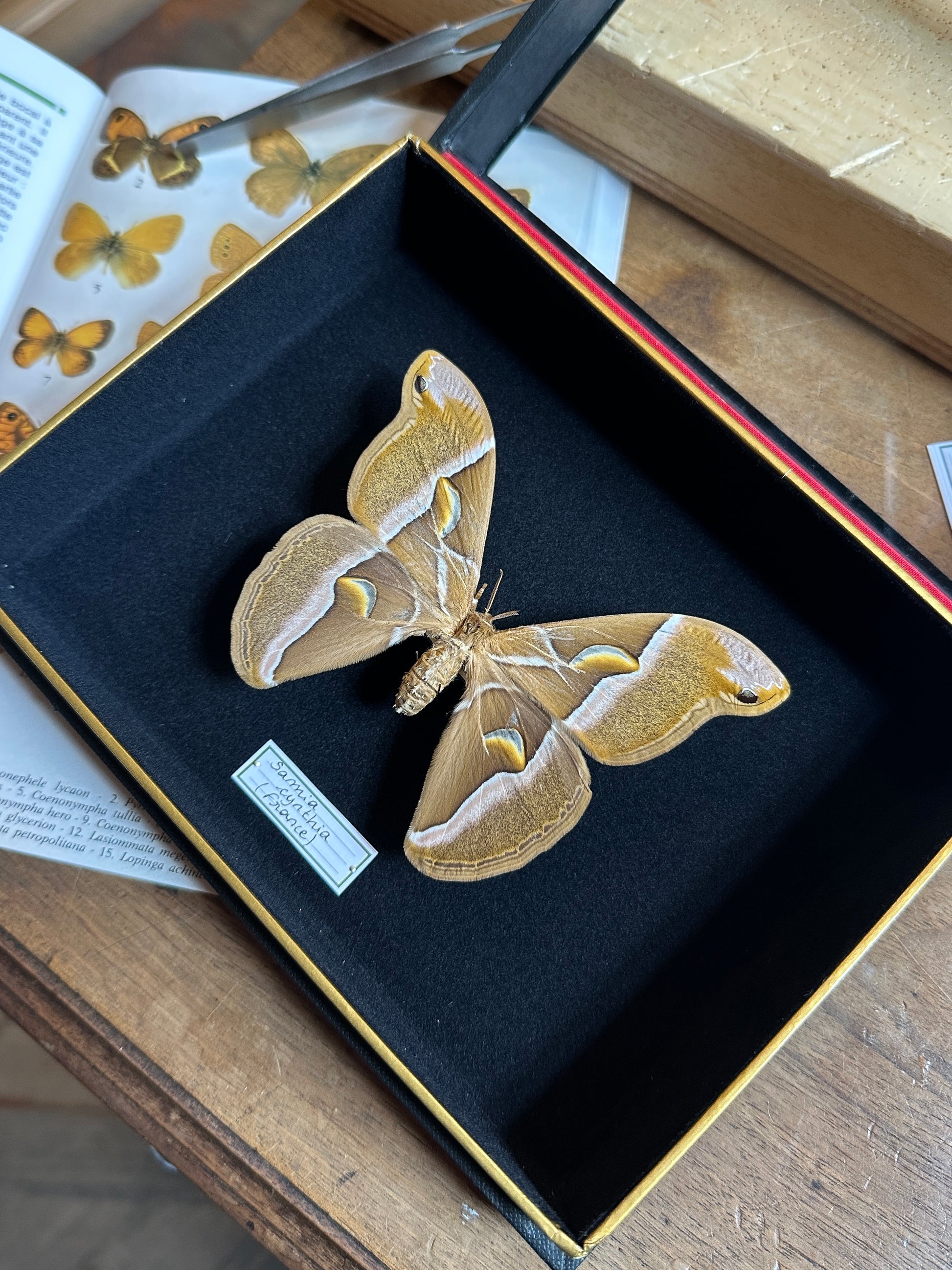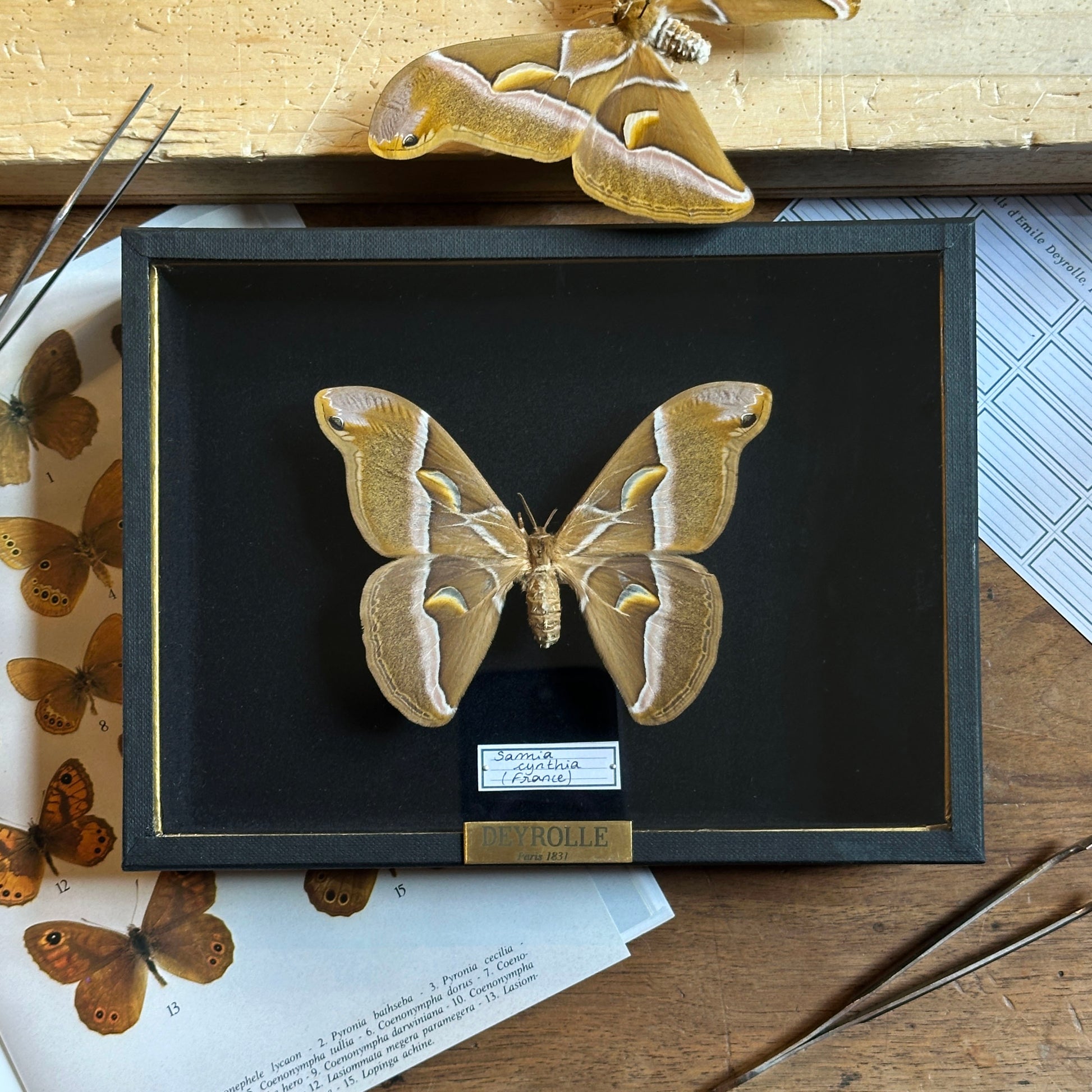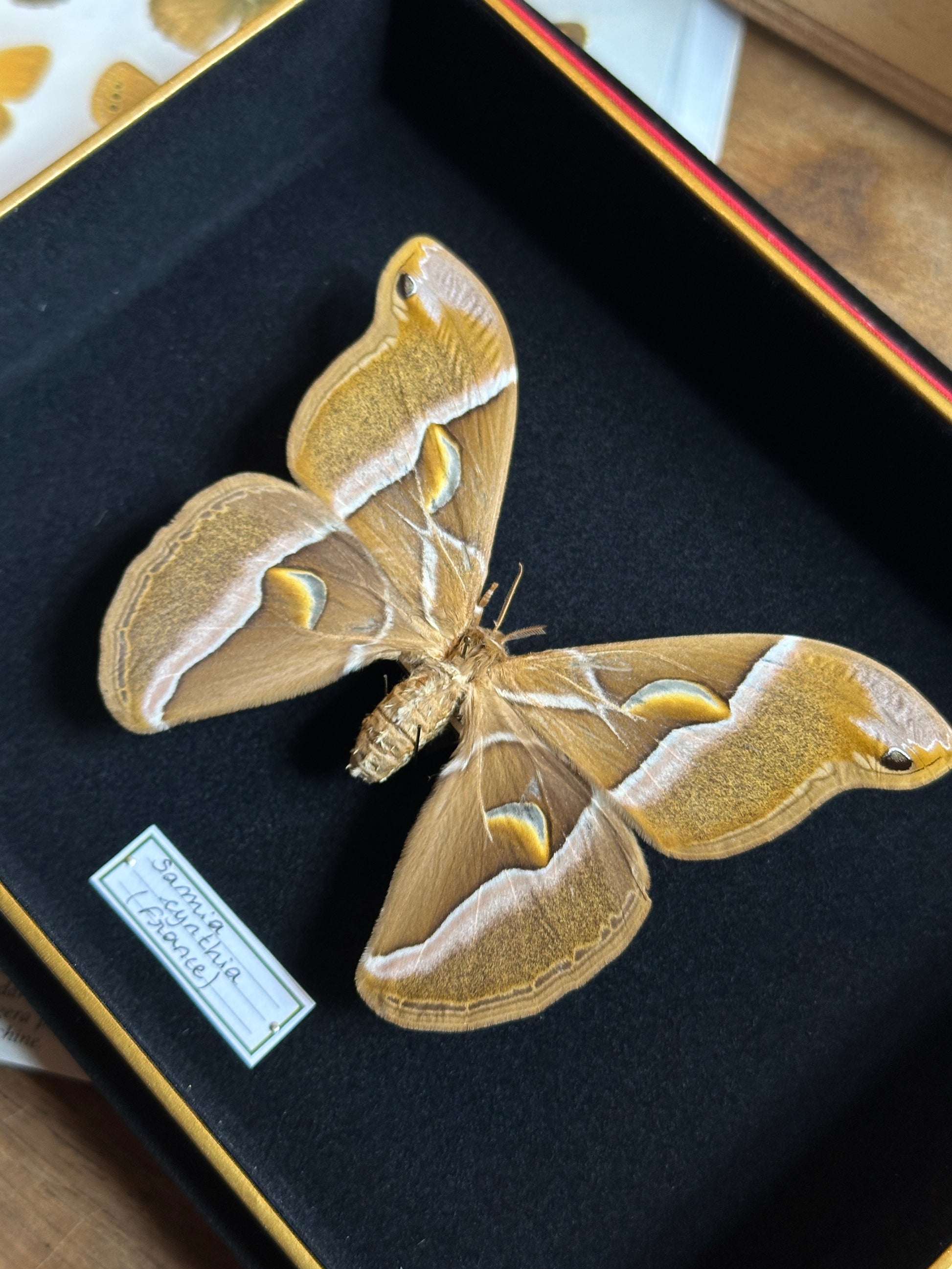 Également appelée ver à soie de l’ailante, la Samia cynthia est un papillon de nuit originaire d’Asie, reconnu pour la délicatesse de ses ailes maronnées aux reflets argentés. Chaque aile, en forme générale de trapèze, est traversée de transparences et d'une bande blanche rosée verticale. Ses ocelles en forme de lunes rappellent pourquoi il est également nommé Croissant.