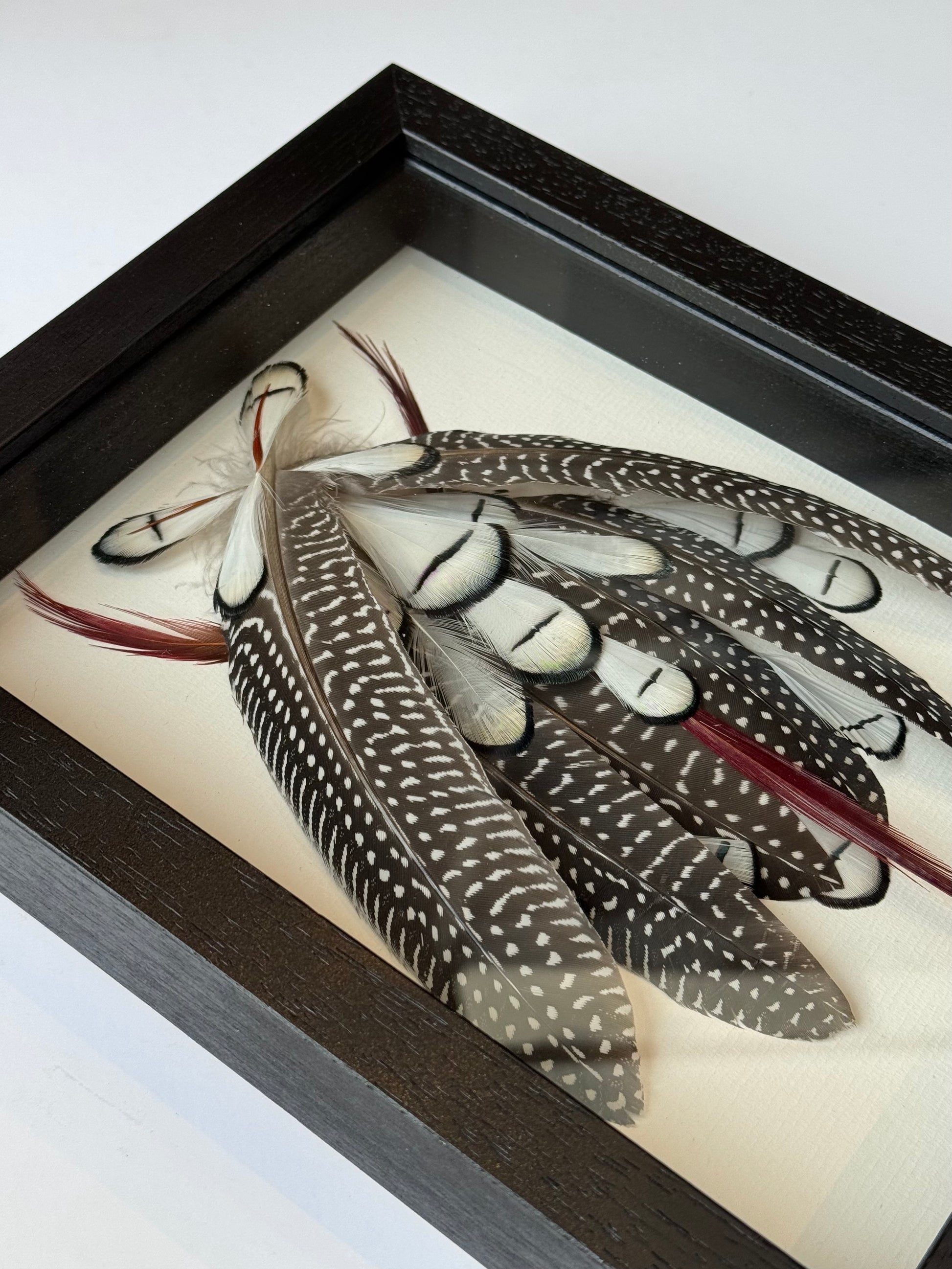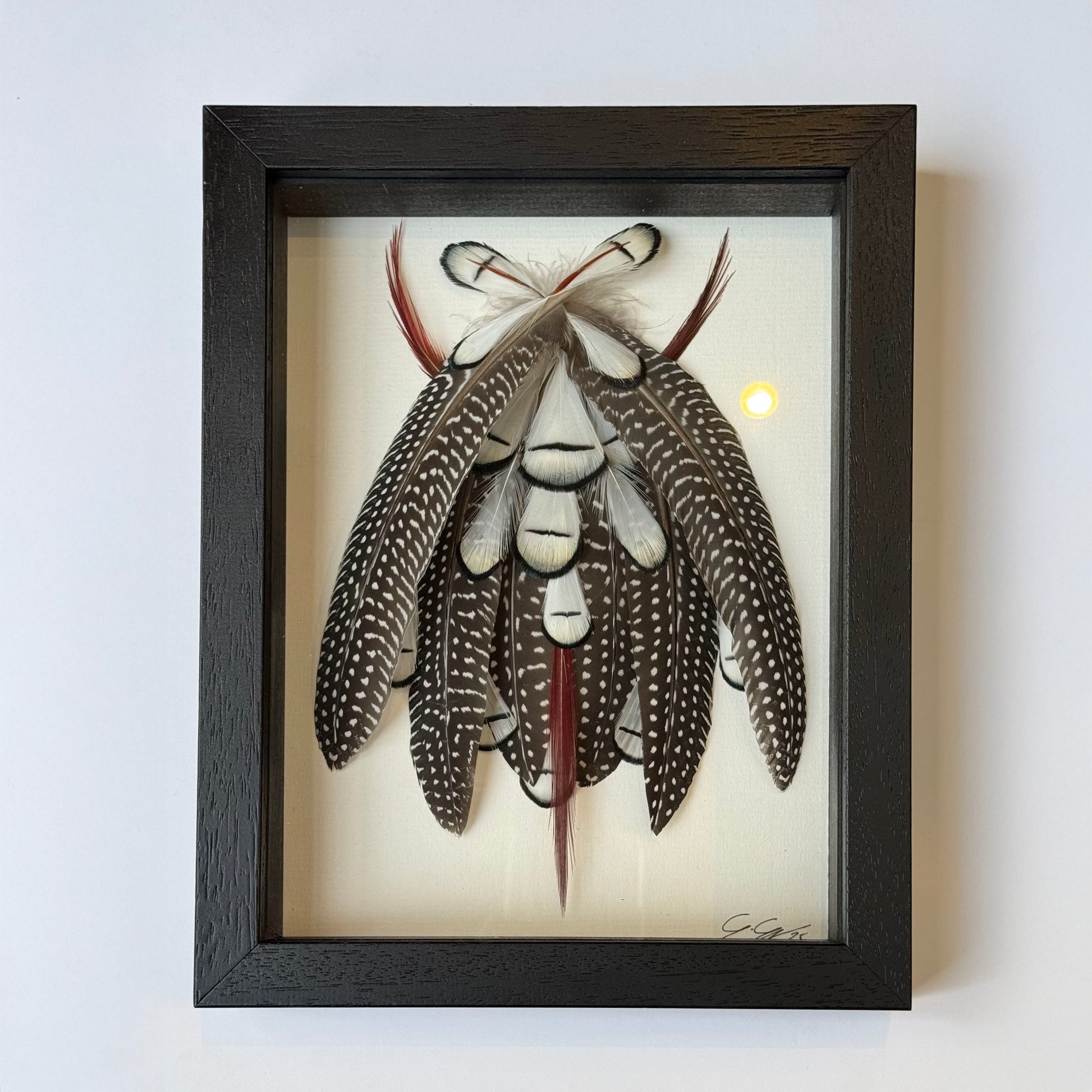A careful assembly of natural feathers, this unique creation evokes an animal mask or a mysterious totem.