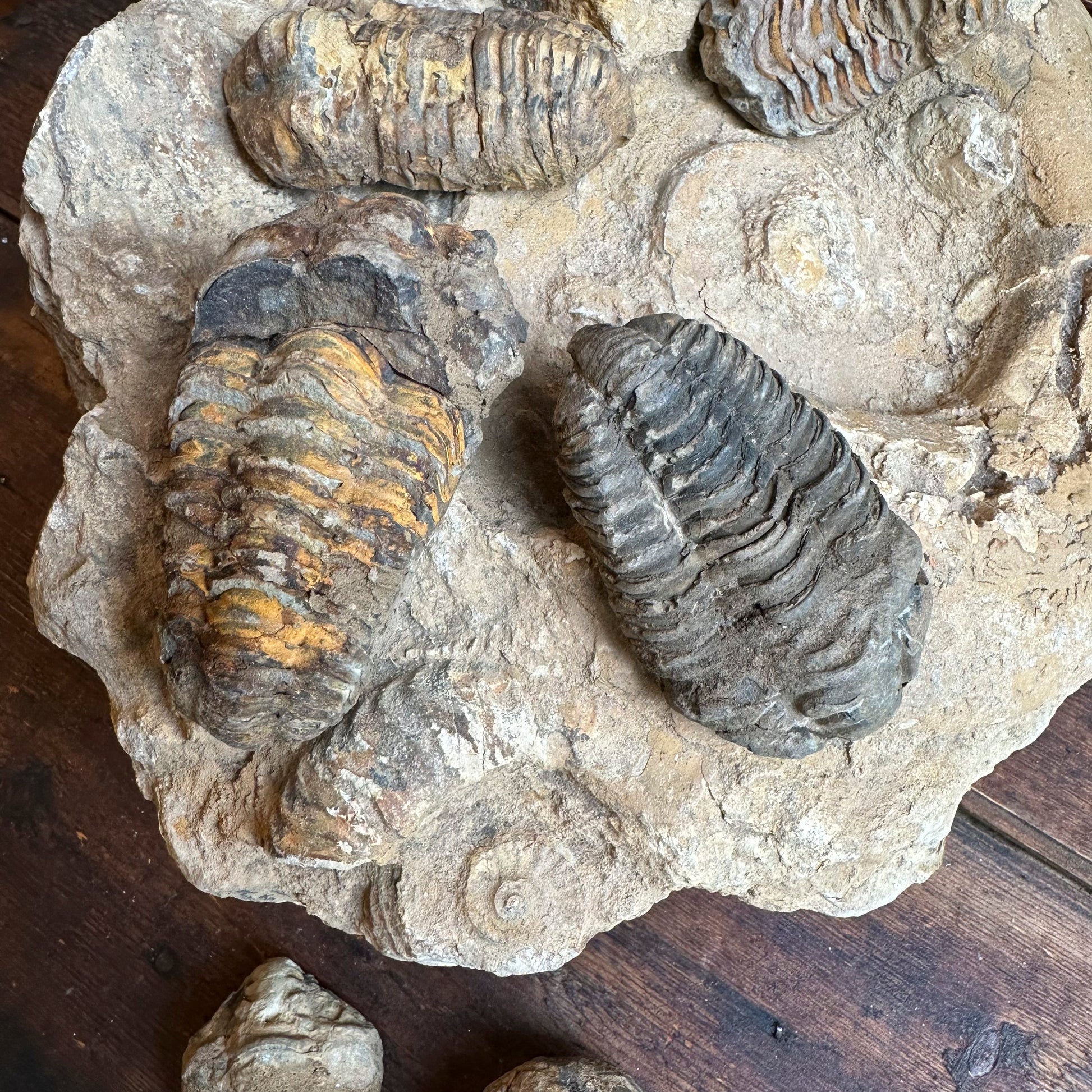 The Calymene trilobite is a genus of fossil trilobites that lived during the Ordovician Period , approximately 488 million years ago. Trilobites are marine arthropods, and the genus Calymene is one of the best known of those that inhabited the seabed at the time. This genus is characterized by a segmented body, divided into three longitudinal lobes, and a hard shell that could sometimes roll into a ball, a defensive characteristic found in several species of trilobites.