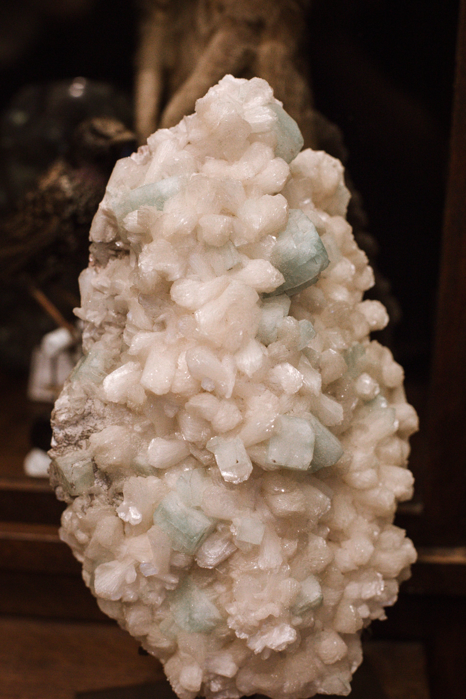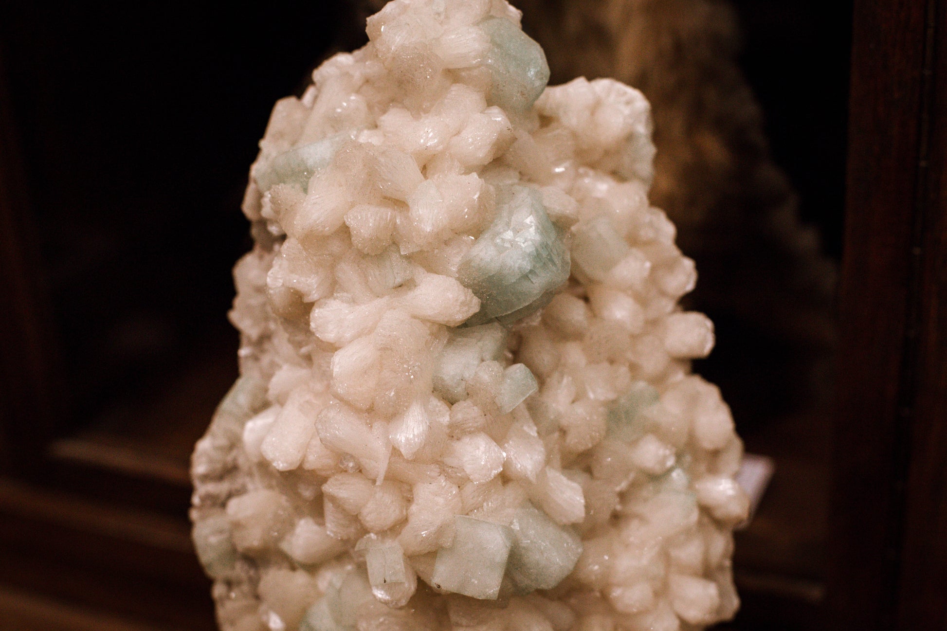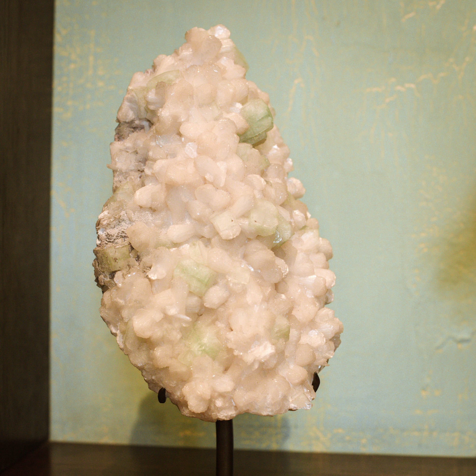 Le mélange du vert pâle de l'apophyllite et du blanc scintillant de la stilbite donne un résultat radiant. Les deux minéraux se fondent naturellement l'un dans l'autre, créant ainsi ce dégradé subtil de coloris légers.