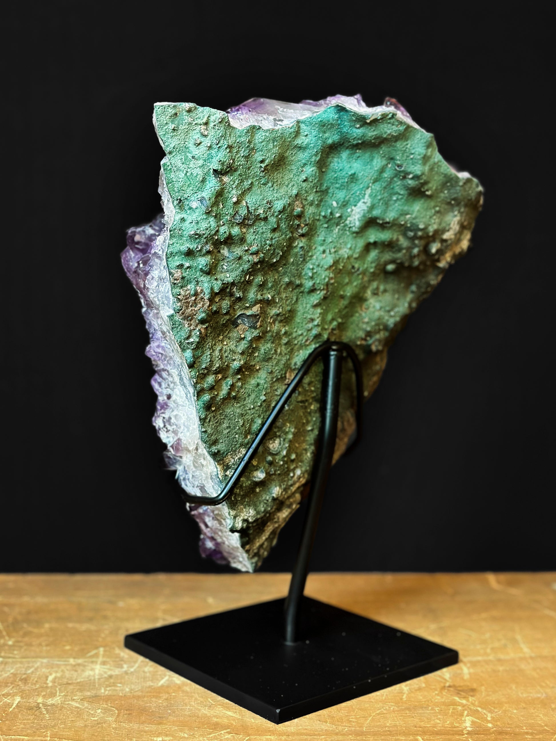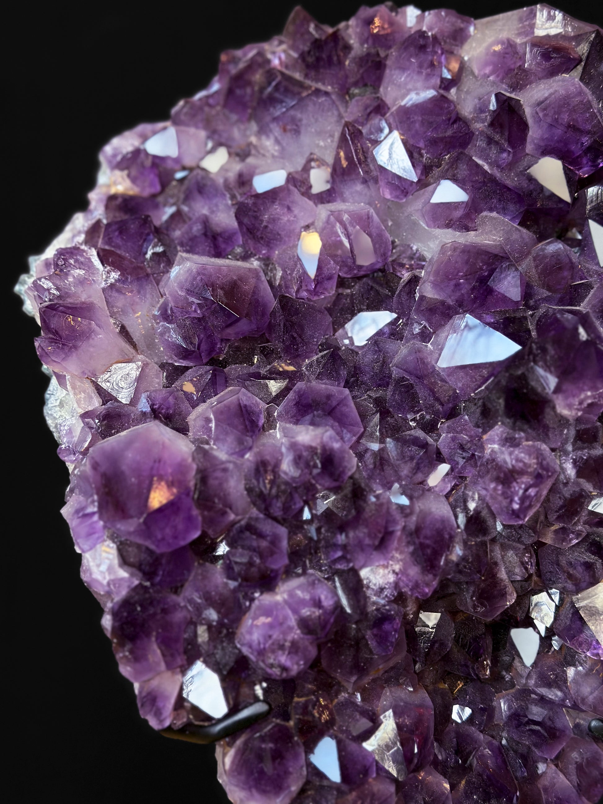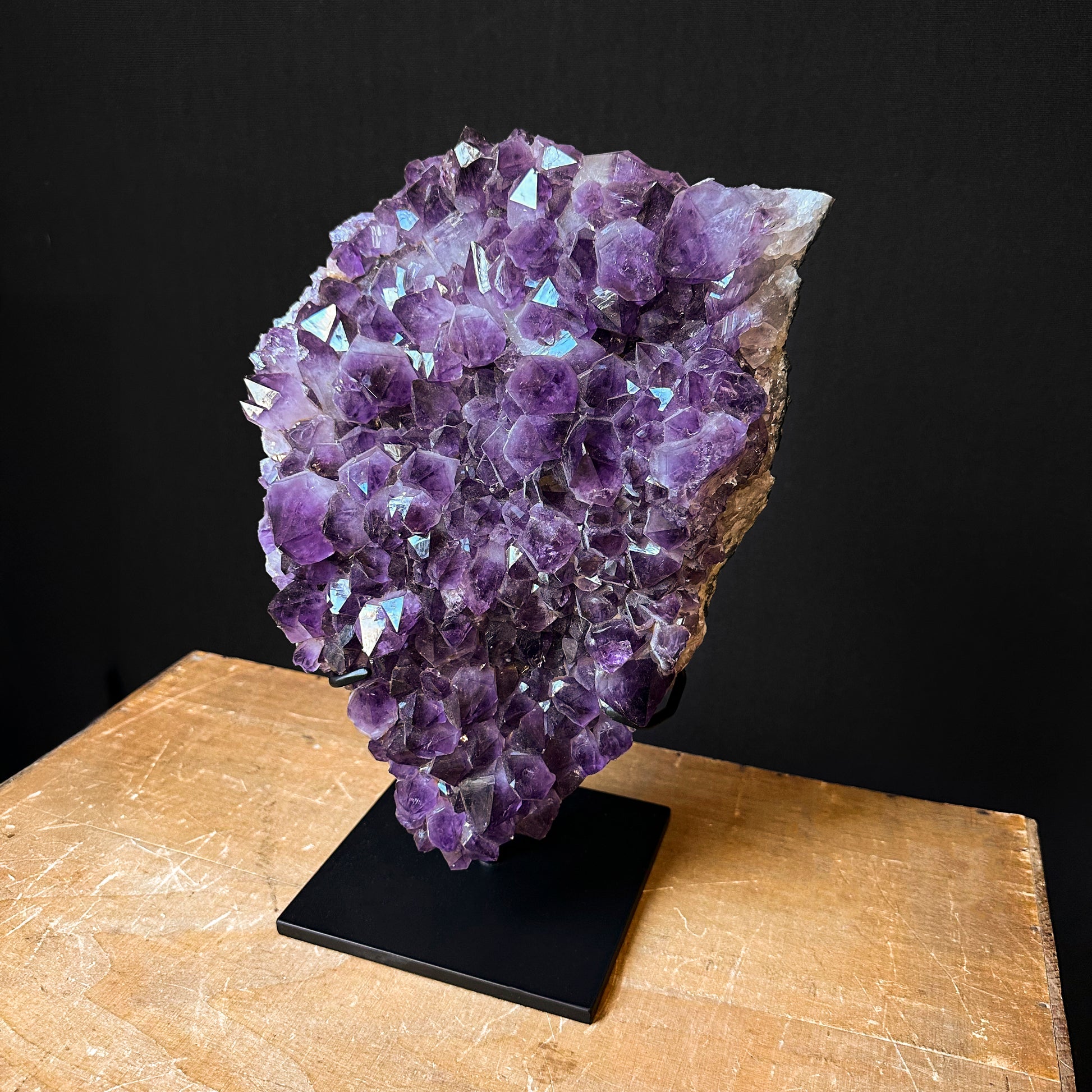 Née dans le silence souterrain des cavités volcaniques, l’améthyste est un joyau façonné pendant des millions d’années. Ses cristaux parfaitement géométriques témoignent d’une cristallisation lente et régulière. Éclatante comme une nuit étoilée, cette améthyste expose une constellation de cristaux violets en pointe dont les facettes captent la lumière et composent un relief vibrant. Présentée sur un socle en acier noir, cette pièce est un fragment de Terre brute élevé au rang d’objet d’art.