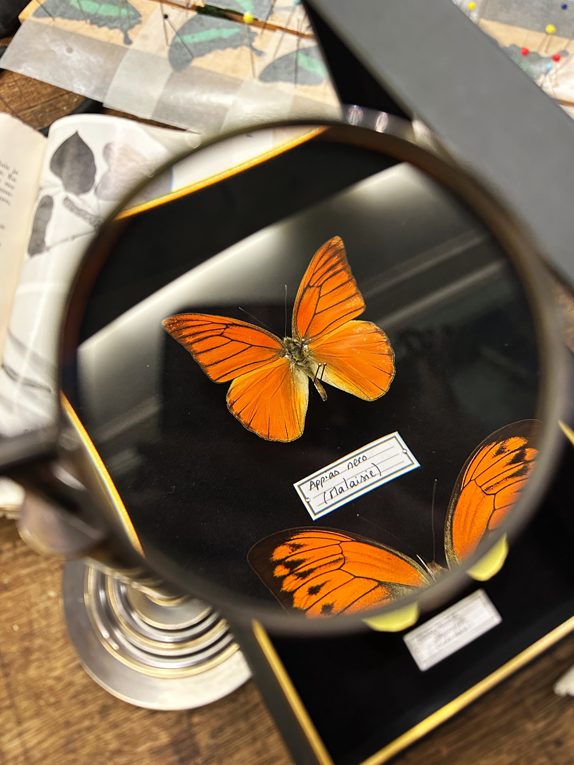 Ce duo associe deux papillons emblématiques d’Asie du Sud-Est, réunis dans un cadre qui met en valeur la chaleur de leurs couleurs. Appias nero, placé en partie supérieure, est orange et parcouru de nervures fines. En contraste, Hebomoia leucippe occupe la partie inférieure du cadre. Plus massif, ce papillon est reconnaissable à ses ailes antérieures orange vif bordées de brun, qui se fondent ensuite dans un jaune crème sur les postérieures.