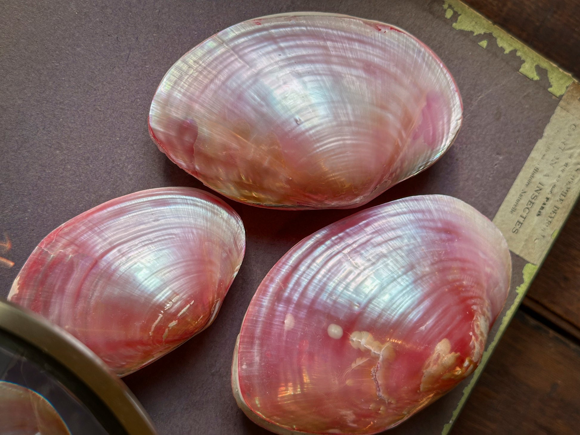 Son manteau sécrète une fine couche de nacre dont la teinte irisée varie selon la composition minérale et les conditions du milieu. Ces nuances délicates, oscillant entre le rose poudré et le violine nacré, en font une pièce naturelle étonnamment poétique. Lignes concentriques et croissance radiale témoignent de son âge et de l’histoire de son habitat, à la manière des cernes d’un arbre.