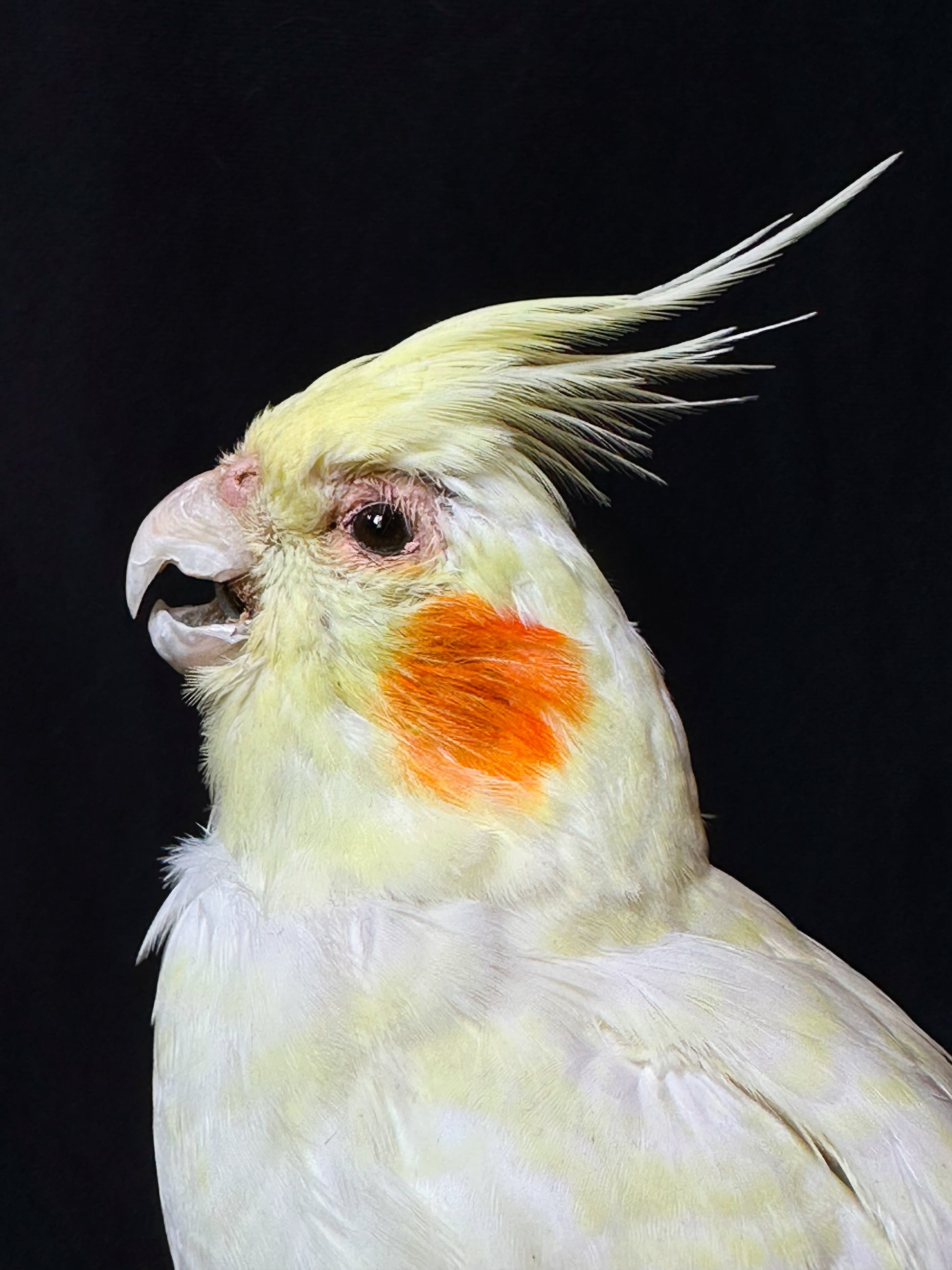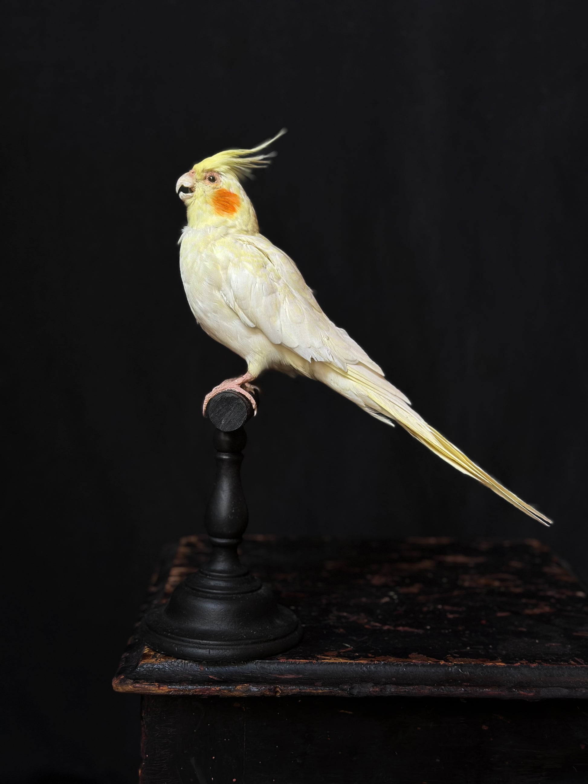 La calopsitte élégante porte bien son nom ! Cet amusant oiseau, naturalisé bec ouvert et œil rieur, semble en pleine conversation de salon. Avec sa coiffe savamment ébouriffée, ses joues trop fardées et son teint pâle, on croirait voir une précieuse ridicule échappée tout droit de la comédie humaine.