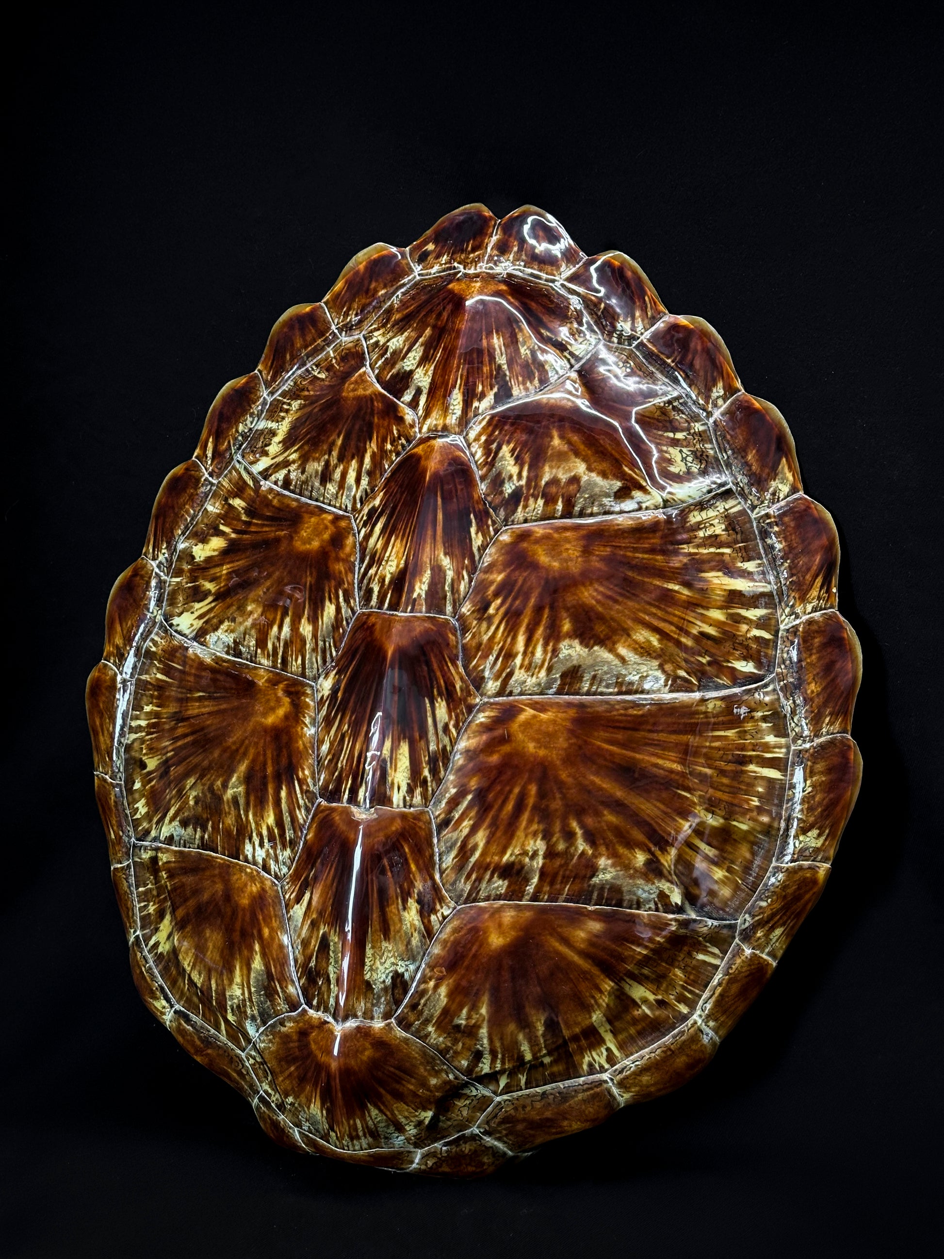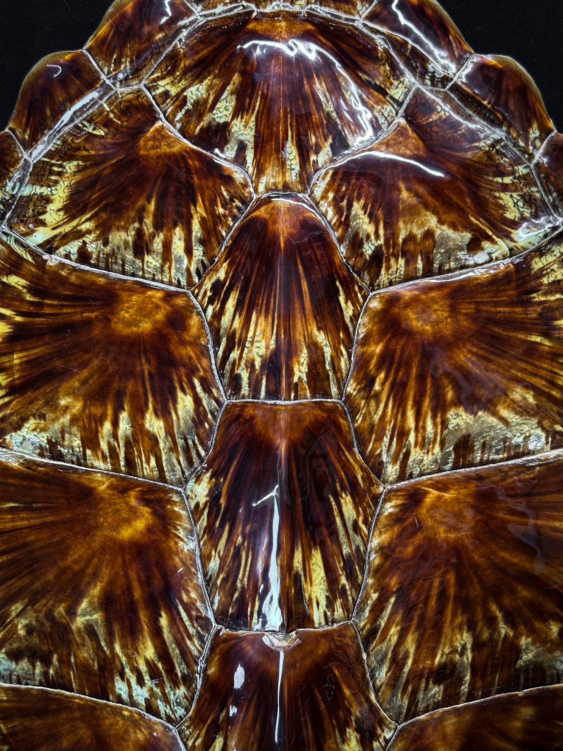 La coloration de la carapace est un mélange saisissant de tons bruns, jaunes et noirs, formant un motif presque marbré ou éclaté, avec des transitions de couleur qui mettent en valeur les particularités de chaque écaille.