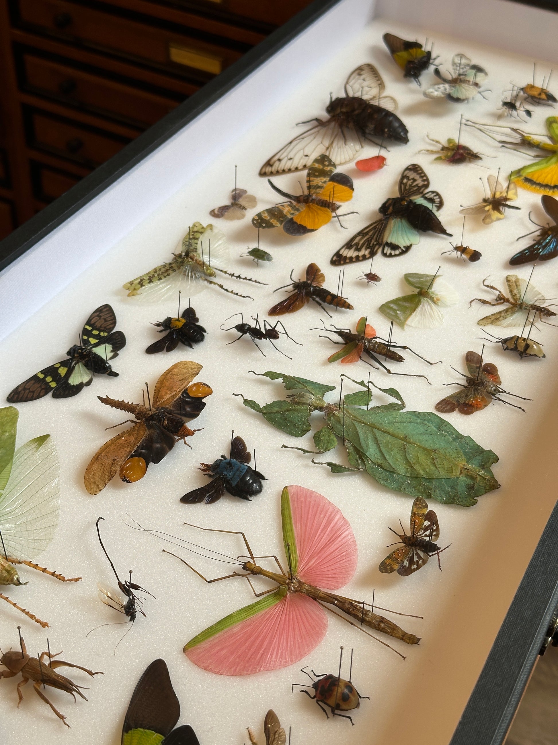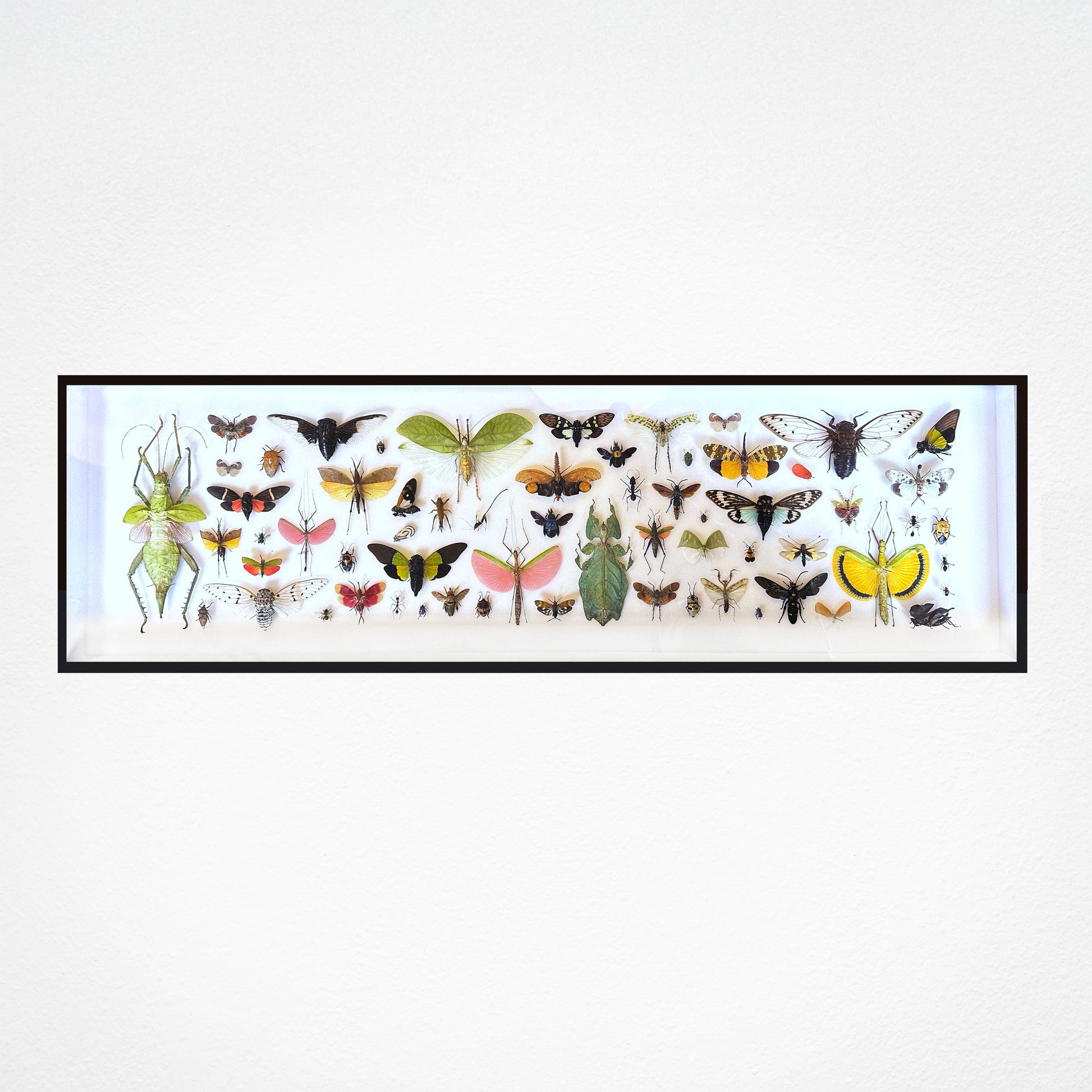 Présentés dans un cadre vitrine sur mesure, ces insectes sont patiemment positionnés à la main, créant une œuvre d’art où se mêlent transparences, textures et symétries naturelles.
