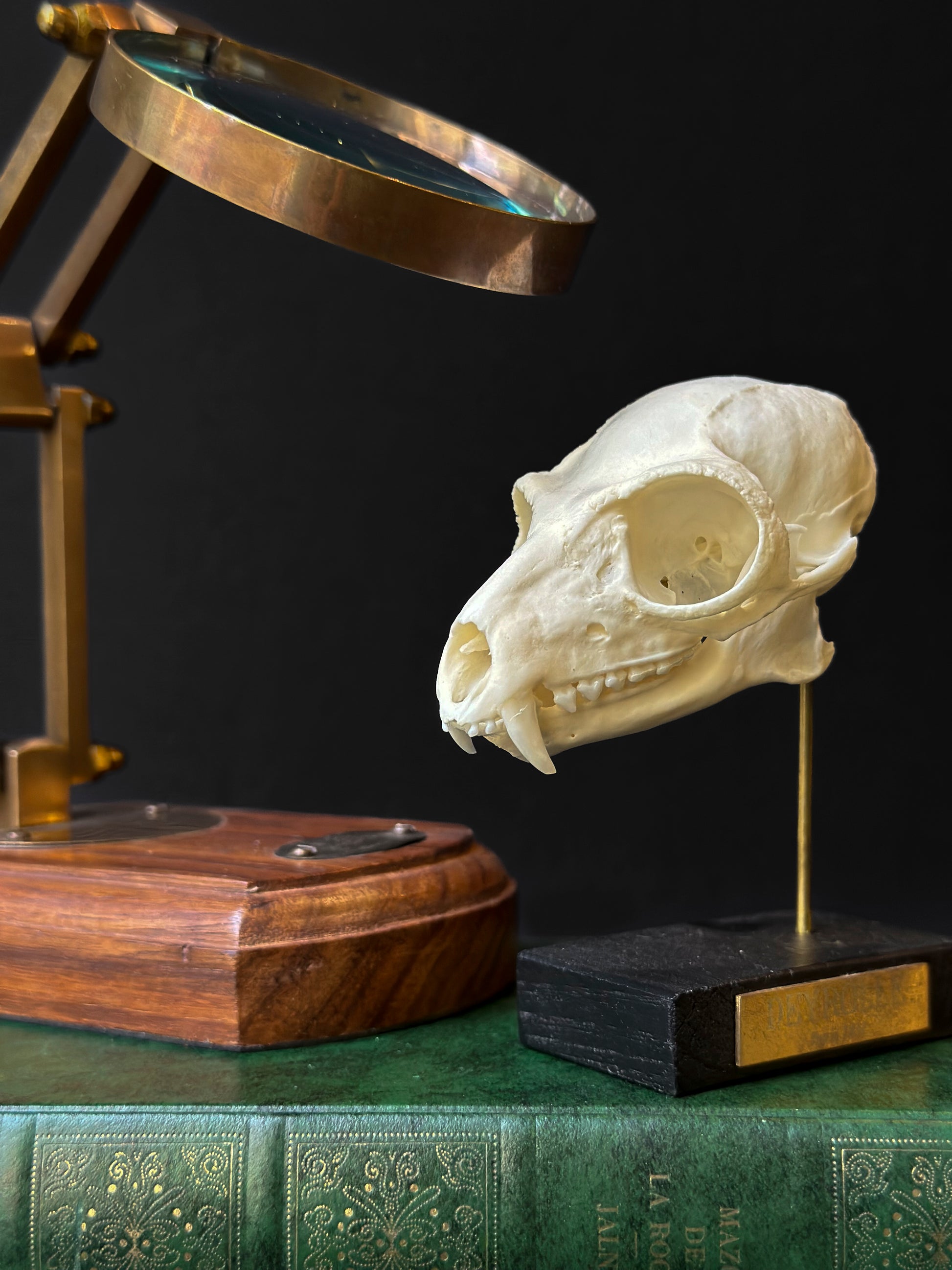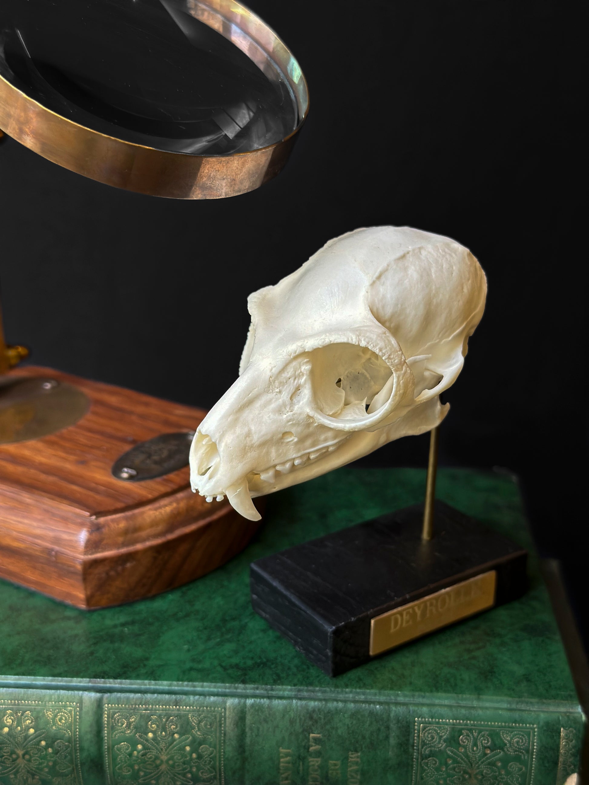 Le lémur catta est un primate emblématique de la famille des lémuriens, endémique de Madagascar et de quelques îles voisines. Son crâne présente des caractéristiques anatomiques distinctes de celles des singes, notamment un museau plus allongé. À l’état sauvage, l’espèce est aujourd’hui menacée, principalement en raison de la destruction de son habitat liée à la déforestation.