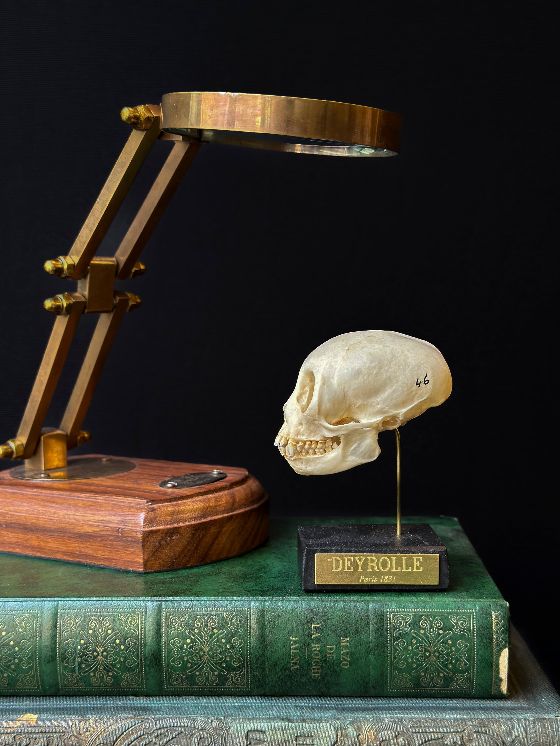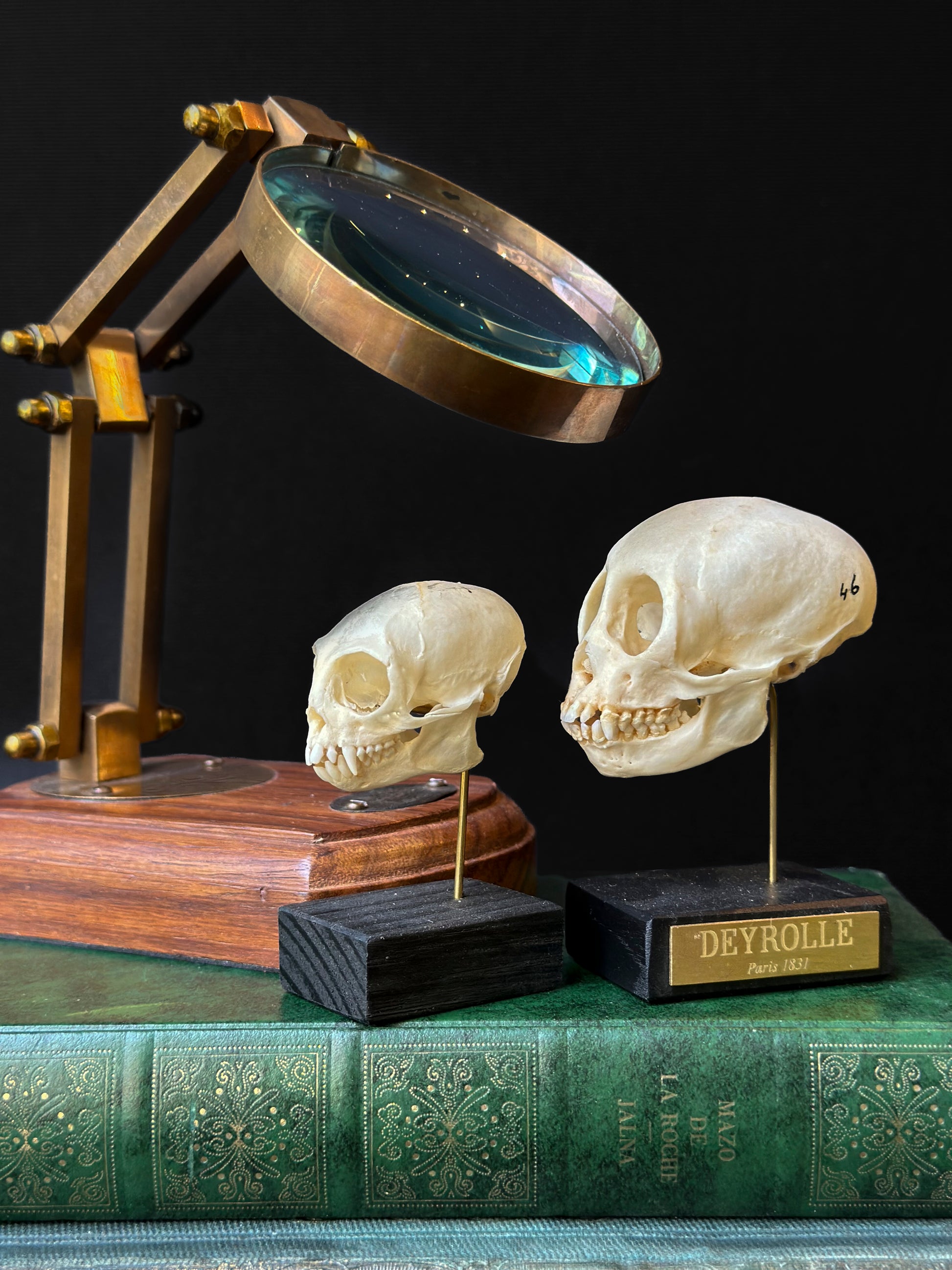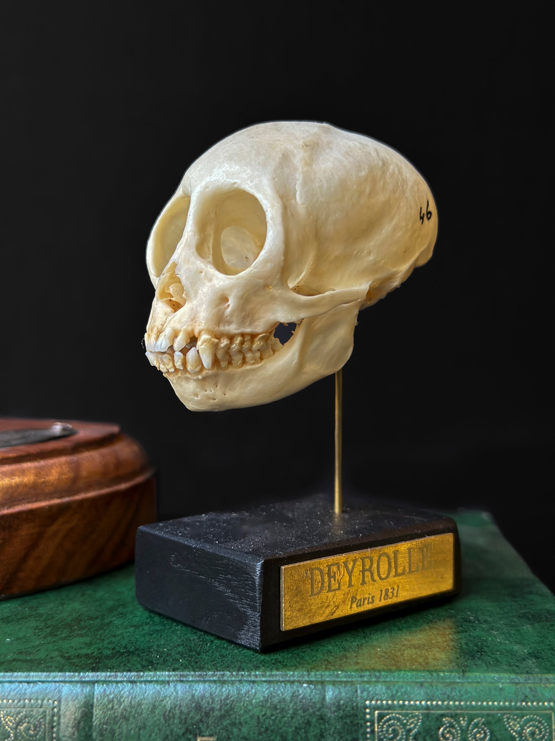 Ce crâne d’ouistiti commun (Callithrix jacchus), petit primate néotropical de la famille des Callitrichidés, se caractérise par une boîte crânienne arrondie, des orbites larges orientées vers l’avant traduisant une vision stéréoscopique développée, et un rostre court portant une dentition fine adaptée à un régime omnivore spécialisé, mêlant insectes, fruits et exsudats végétaux, ces derniers étant prélevés grâce à des incisives robustes et légèrement projetées. Ce spécimen a été soigneusement monté sur socle dans nos ateliers pour offrir une présentation à la fois pédagogique et esthétique.