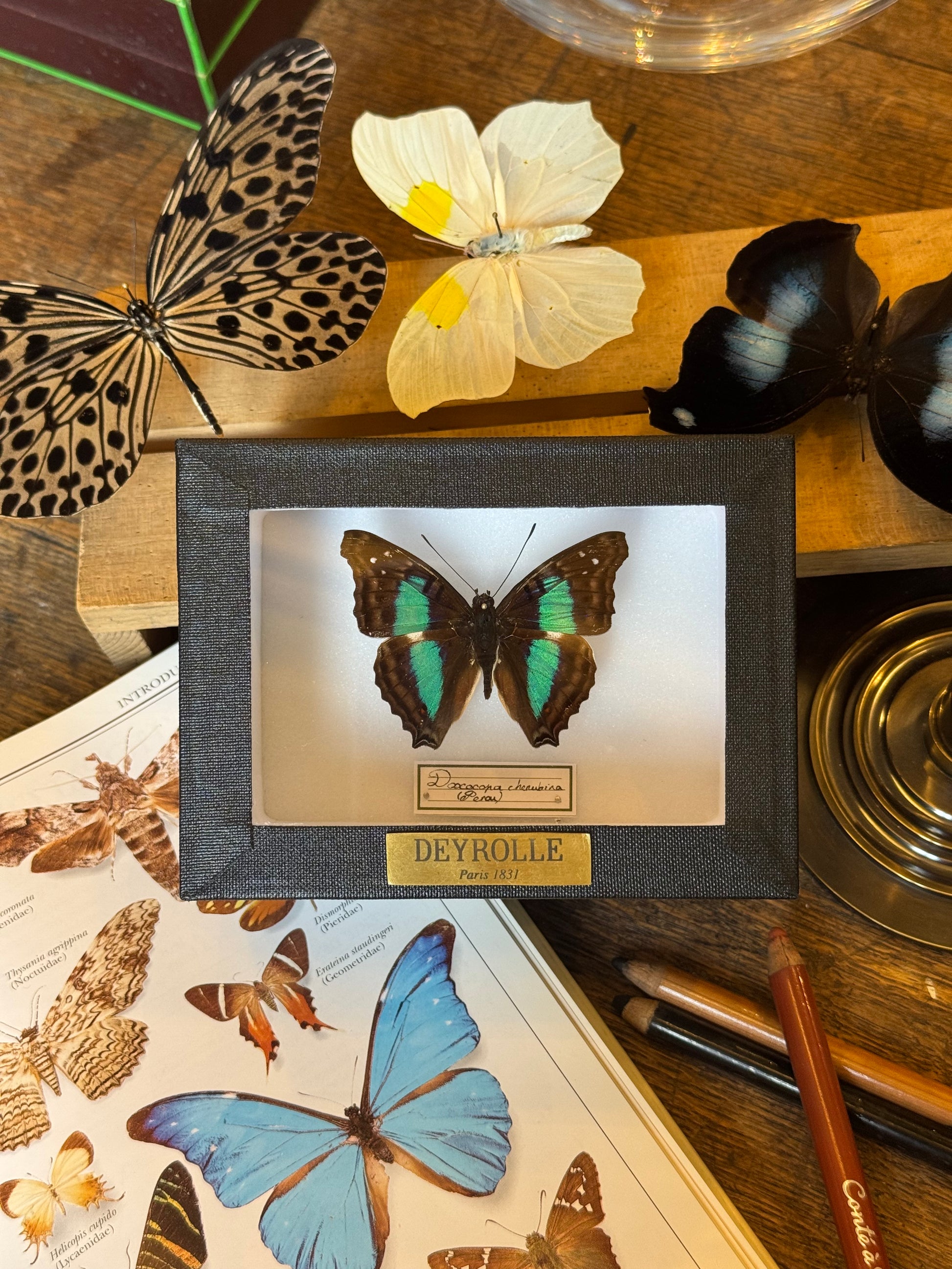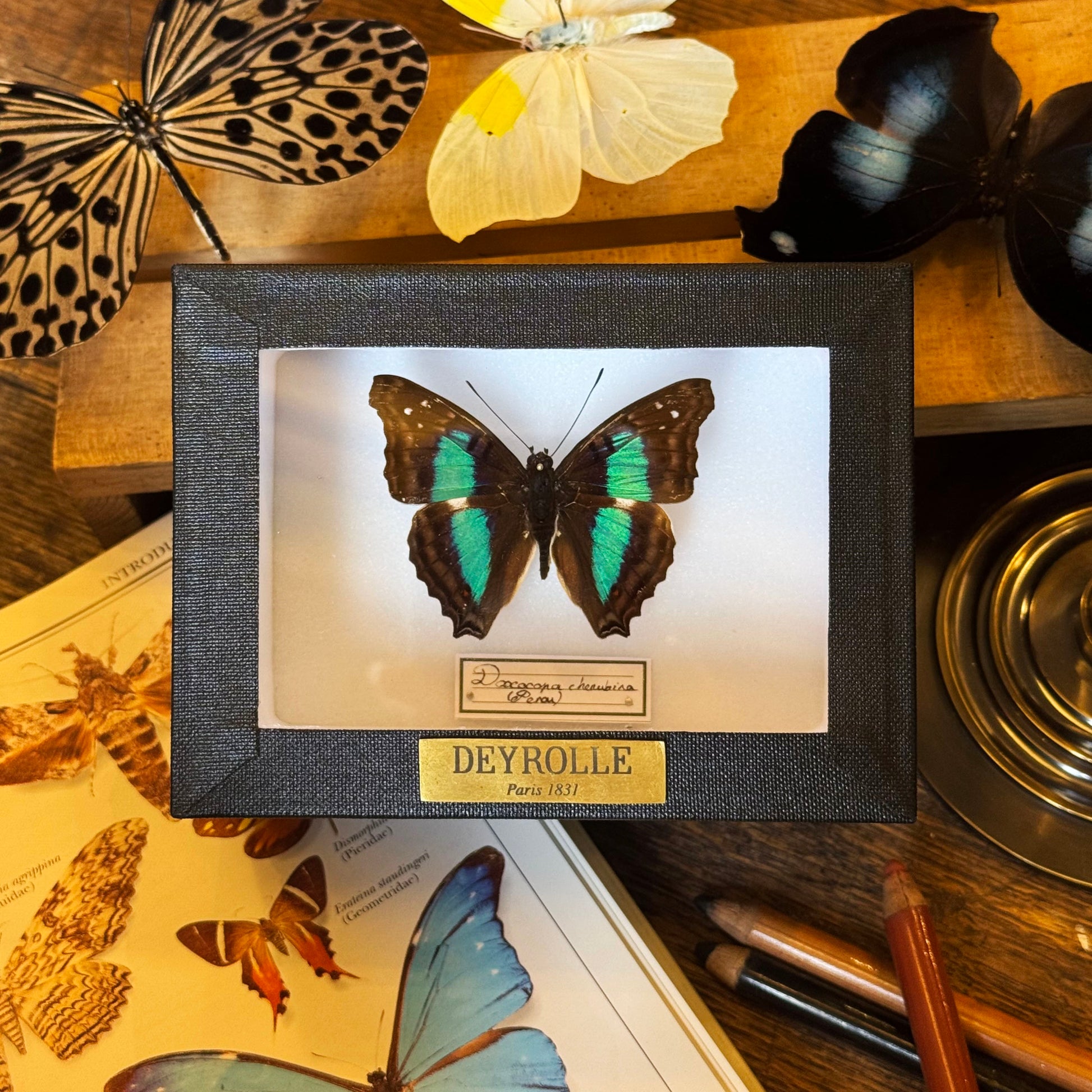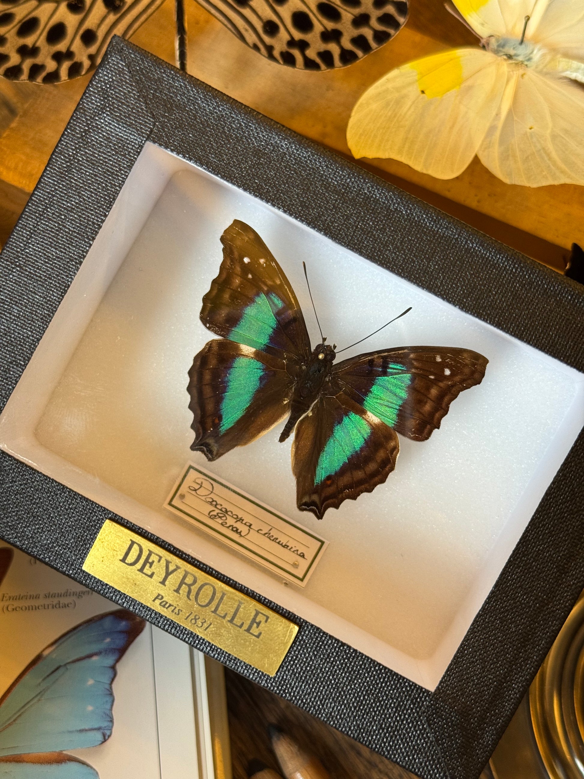 Présenté dans une boîte hermétique vitrée à accrocher, il est sublimé par un cadre noir sur fond blanc. Chaque spécimen est soigneusement identifié par une étiquette calligraphiée, mentionnant son nom latin et son origine. Une plaque en laiton gravée du nom de Deyrolle certifie l’authenticité de cette pièce unique, issue de nos collections.