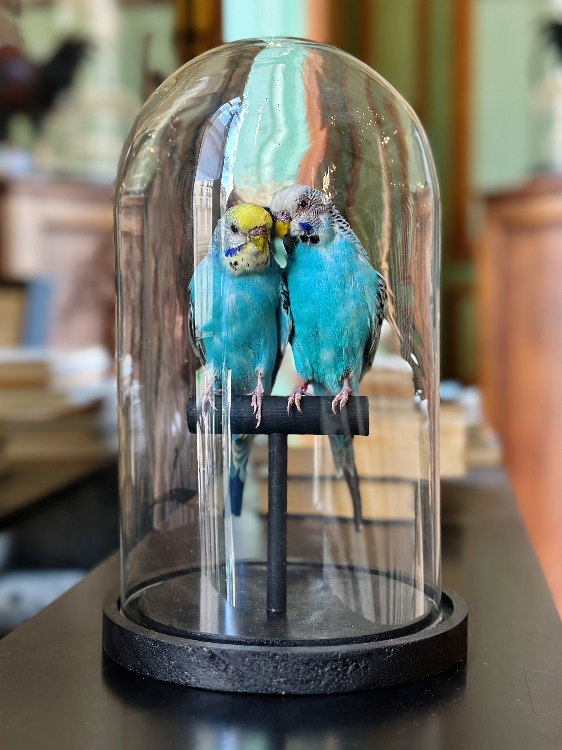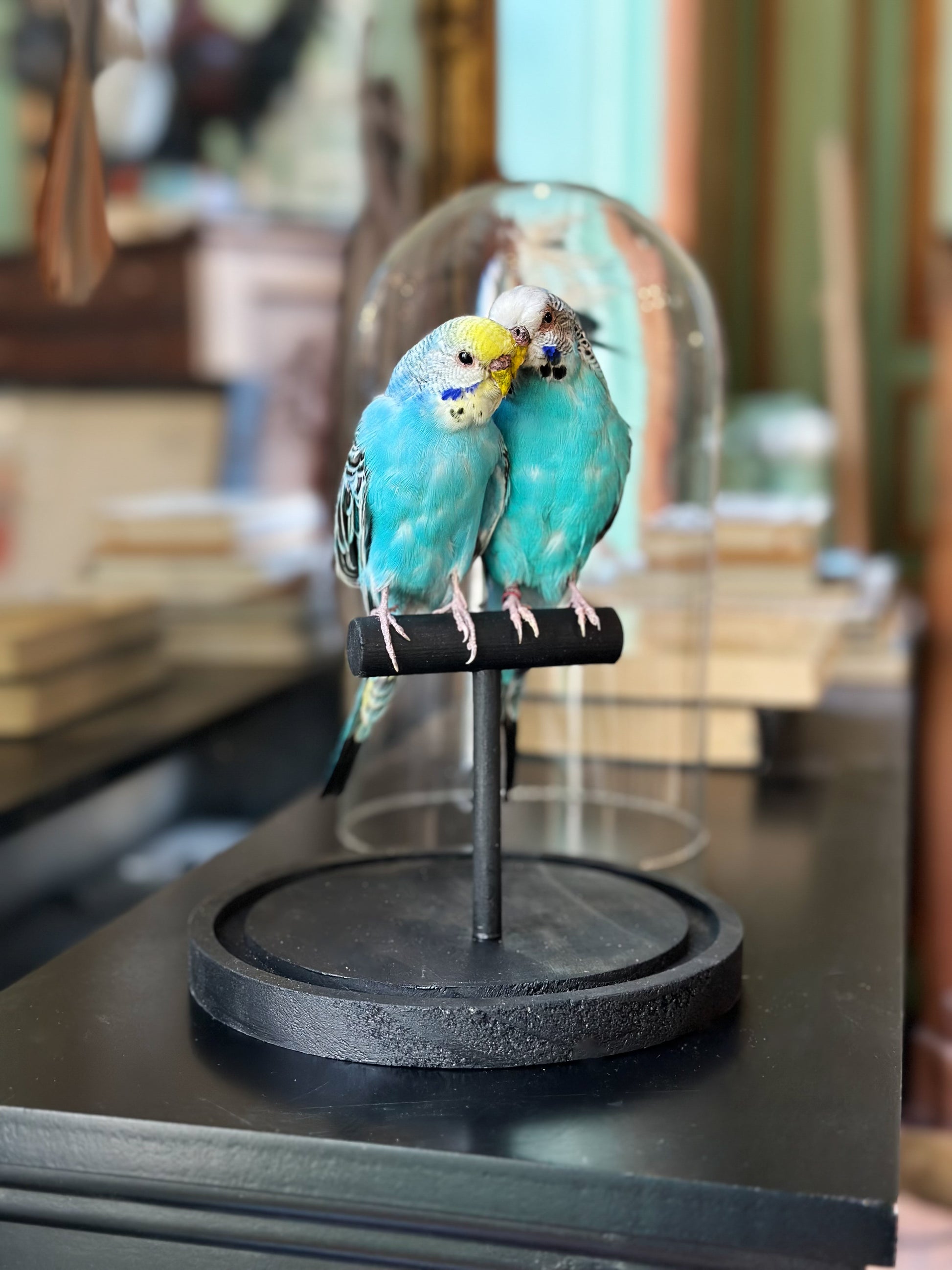 Ce charmant duo de perruches ondulées délicatement naturalisées est présenté sur un élégant socle noir tourné et protégé par un globe en verre. Ces deux spécimens aux nuances vives de bleu pastel et jaune citron capturent un moment de tendresse et de complicité, une pièce idéale pour apporter une touche de poésie à tout intérieur.