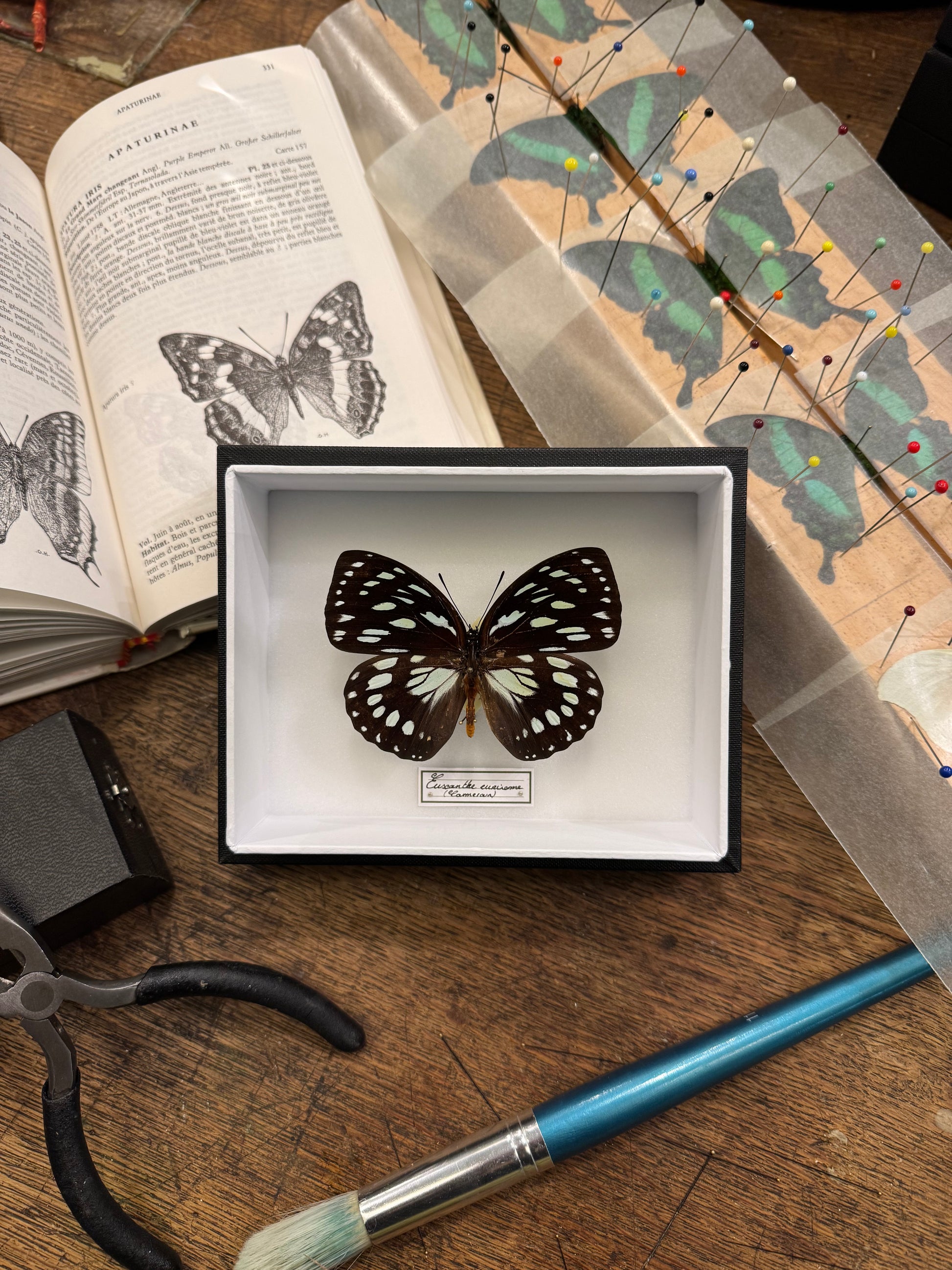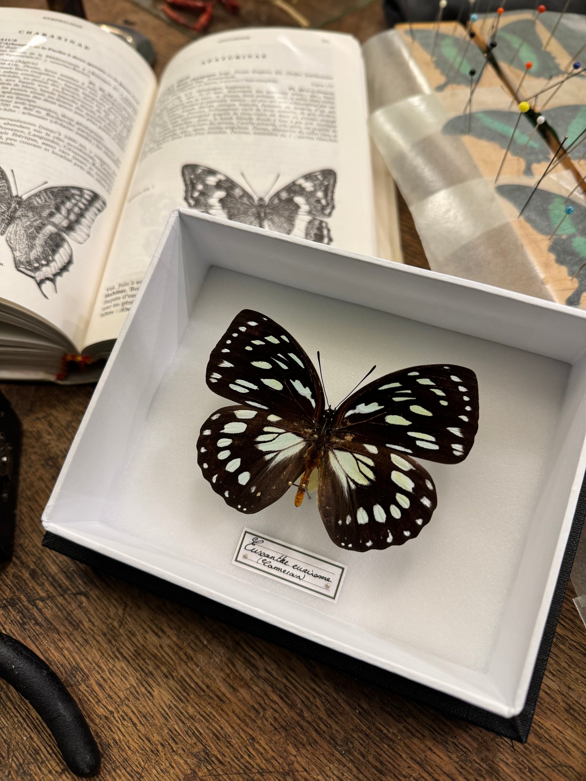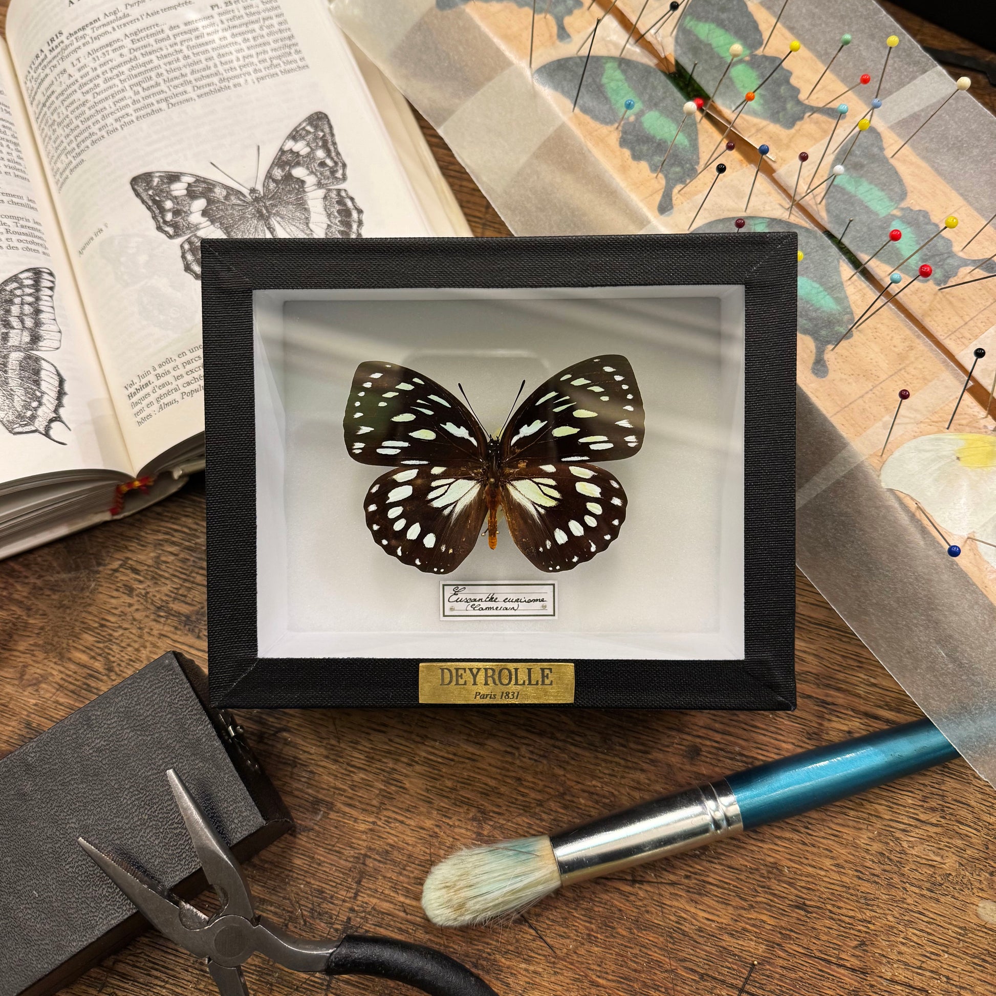 Présenté dans une boîte hermétique vitrée à accrocher, ce spécimen est sublimé par un cadre noir sur fond blanc. Chaque spécimen est soigneusement identifié par une étiquette calligraphiée, mentionnant son nom latin et son origine. Une plaque en laiton gravée du nom de Deyrolle certifie l’authenticité de cette pièce unique, issue de nos collections.