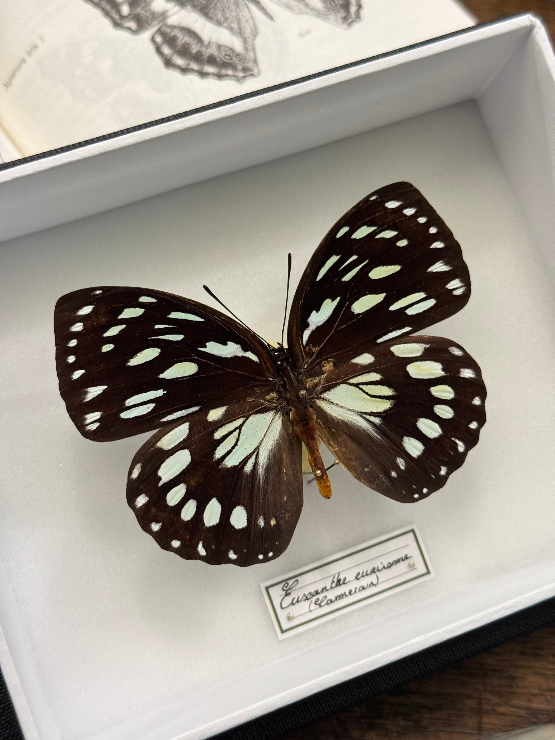 Euxanthe eurinome, surnommée la Reine commune des forêts, est un papillon typique des zones boisées d’Afrique occidentale et centrale. Ses ailes brun profond sont ponctuées de taches blanches (légèrement vertes) bien nettes. Cette espèce est strictement forestière, observée dans les sous-bois lumineux et les clairières.