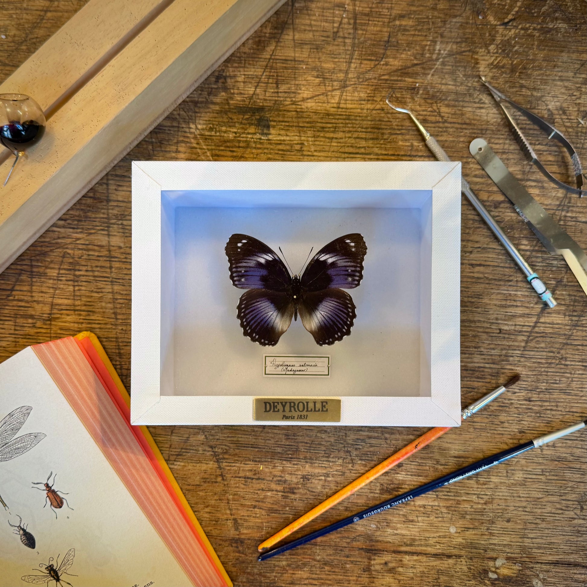 Surnommé le diadème bleu, Hypolimnas salmacis nous subjugue par son noir velouté traversé d'un halo bleu roi et de douces taches blanches. Chez cette espèce, les mâles arborent cette parure pour séduire et impressionner, tandis que les femelles se camouflent dans le feuillage avec des teintes plus sobres. Au-delà de son élégance, ce papillon intrigue les scientifiques, car certaines de ses populations sont influencées par une bactérie (Wolbachia) qui bouleverse la proportion des sexes.