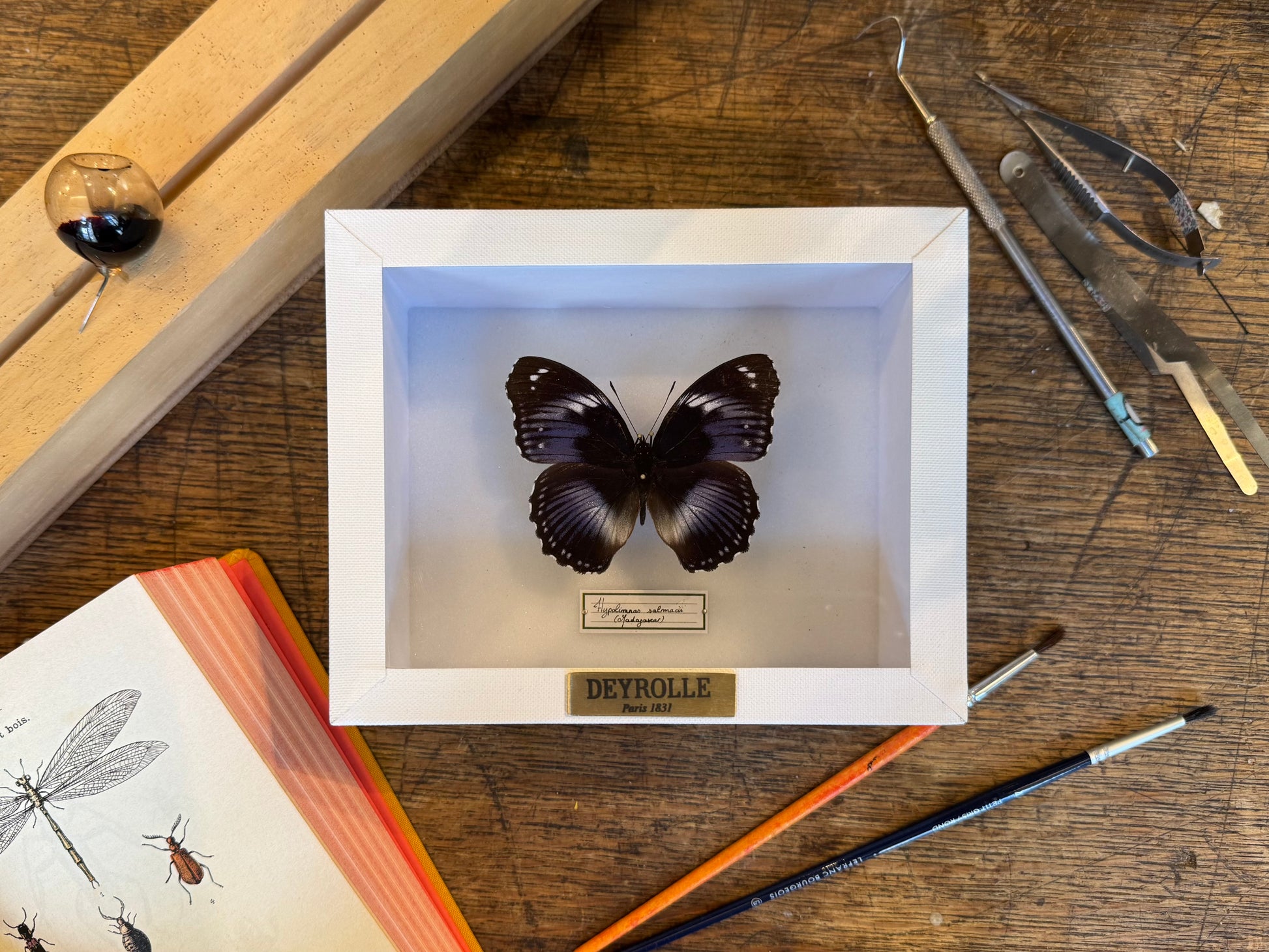 Présenté dans une boîte hermétique vitrée à accrocher, il est sublimé par un cadre blanc sur fond blanc. Chaque spécimen est soigneusement identifié par une étiquette calligraphiée, mentionnant son nom latin et son origine. Une plaque en laiton gravée du nom de Deyrolle certifie l’authenticité de cette pièce unique, issue de nos collections.