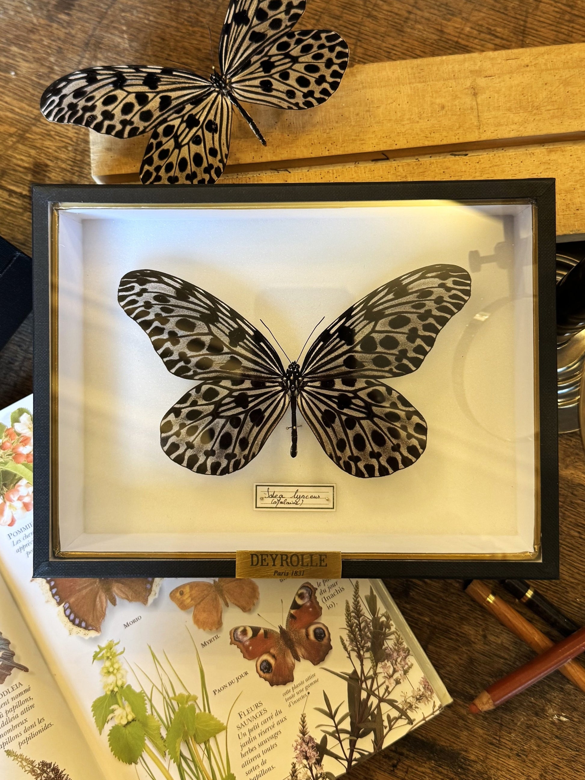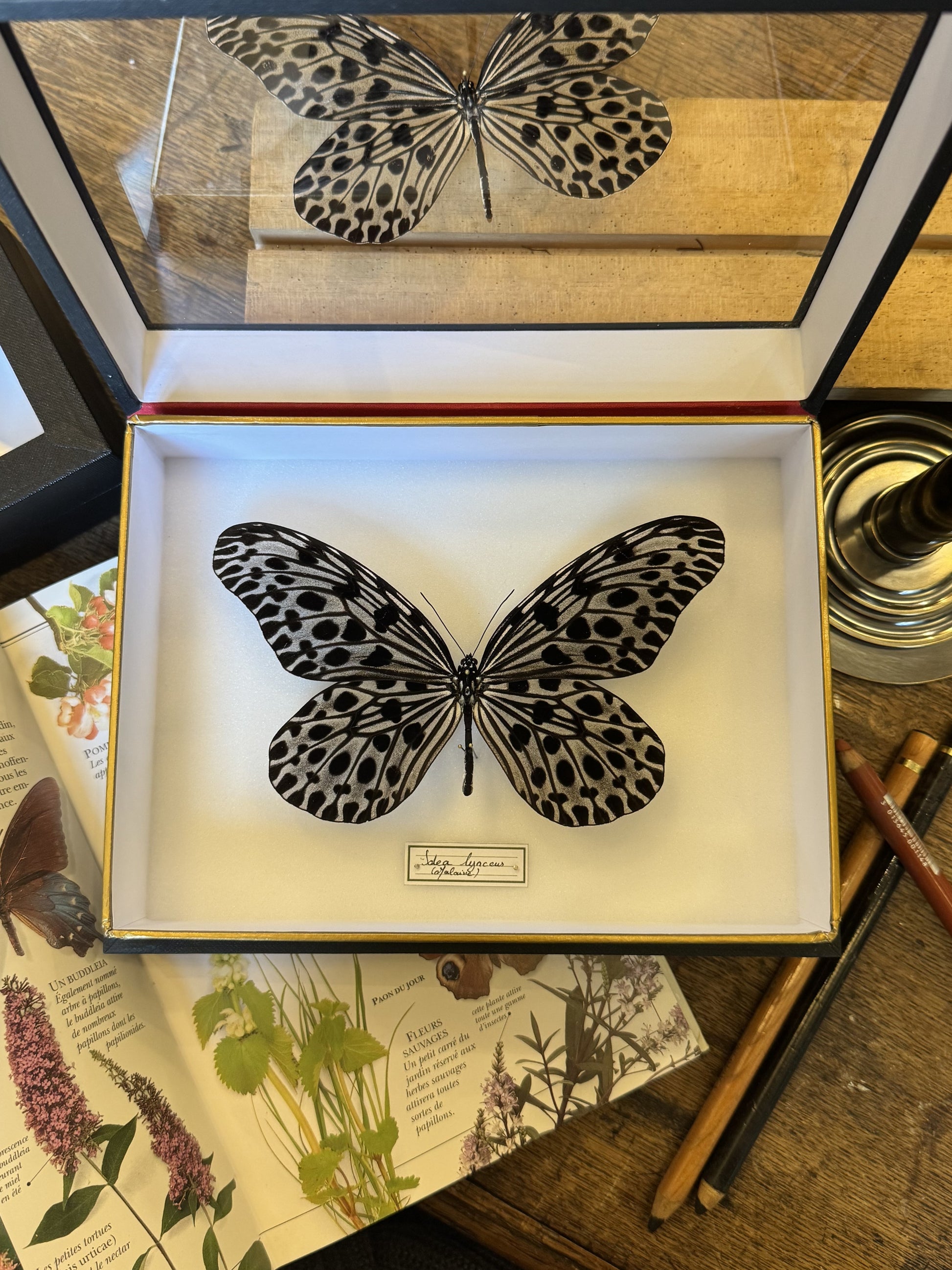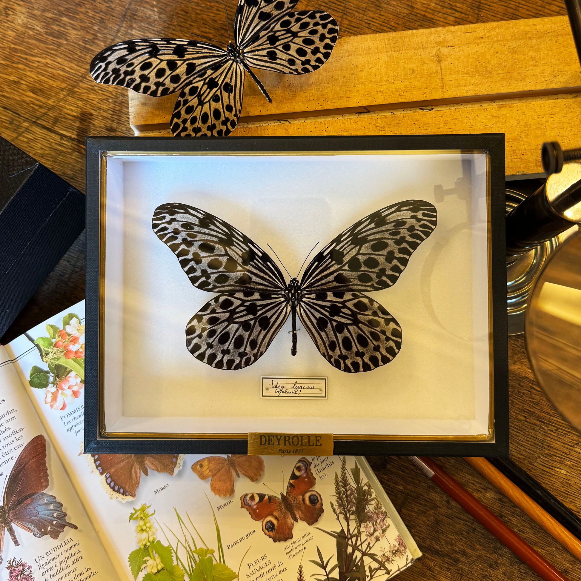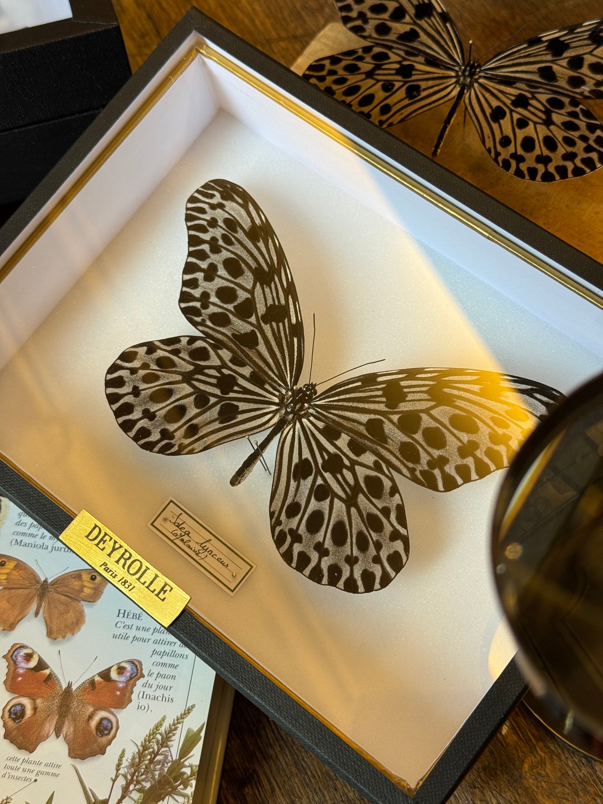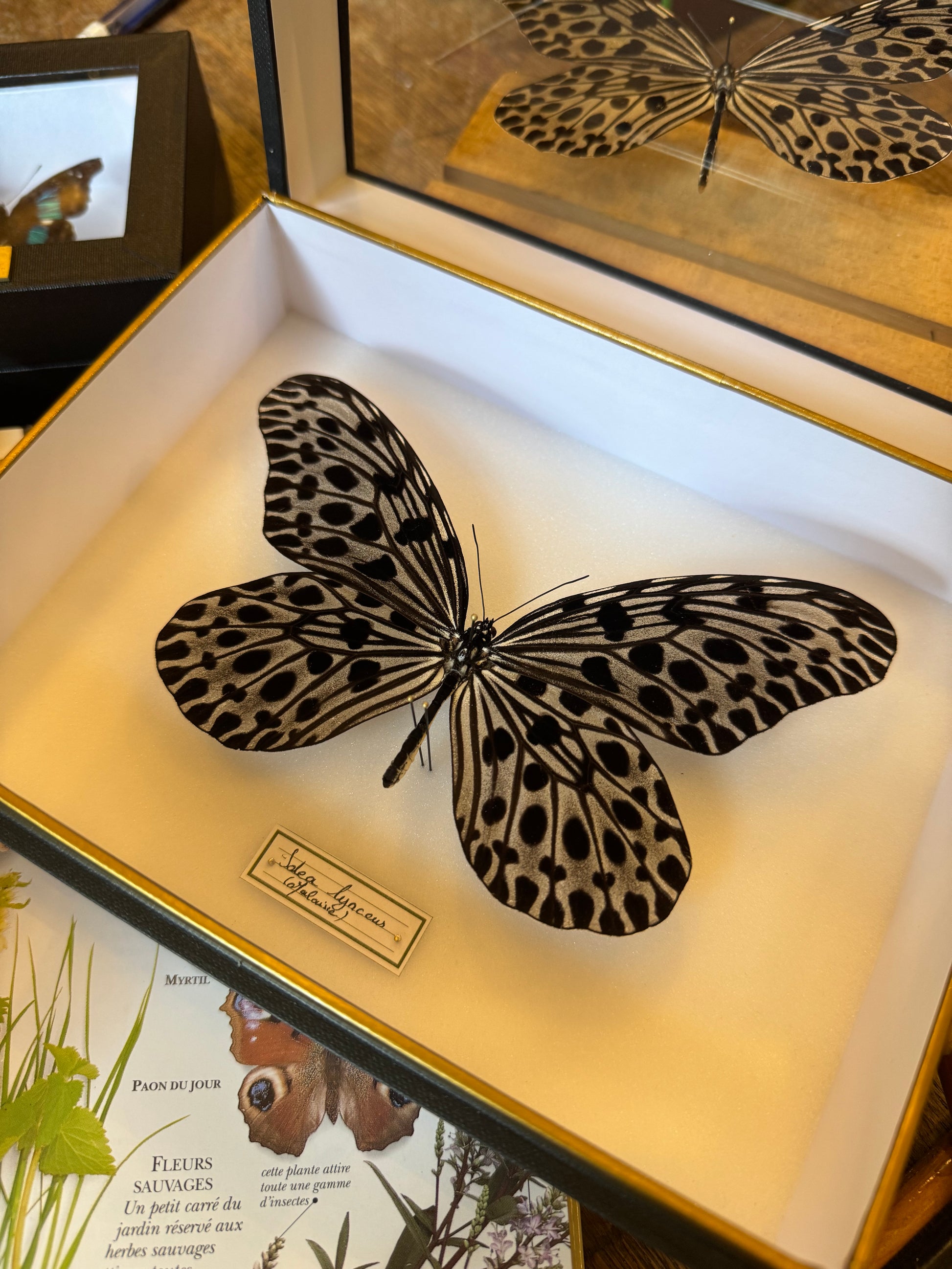 Idea lynceus, souvent appelé Grand planeur tacheté, est un papillon d’Asie du Sud-Est reconnaissable à ses larges ailes ivoire finement nervurées de noir et ponctuées de taches sombres régulières. D’une grande envergure et d’une légèreté apparente, il est célèbre pour son vol lent et plané, presque flottant.