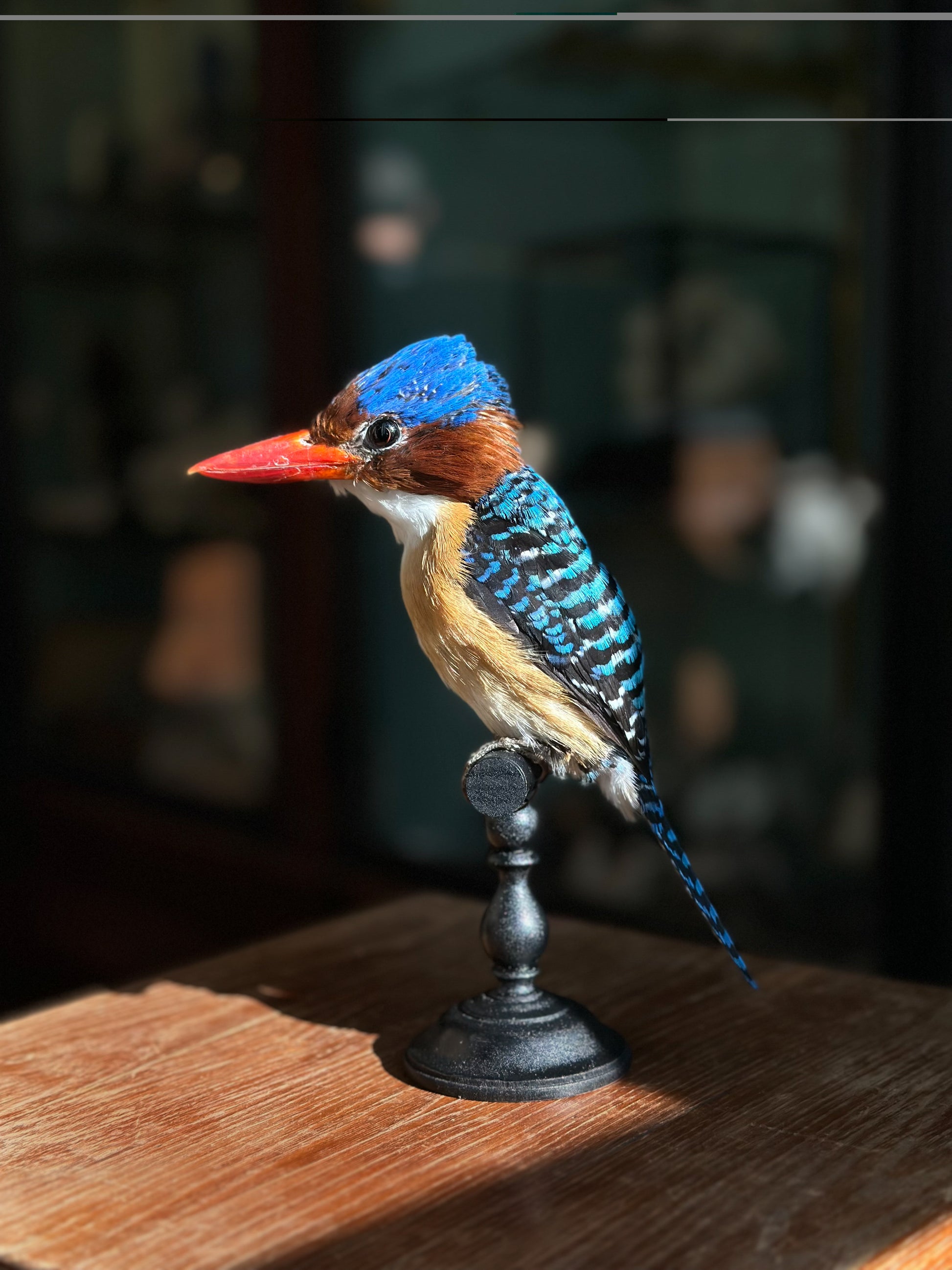 Perché fièrement sur son socle, ce martin-chasseur mâle arbore une allure aussi vive que son plumage. Son bec écarlate tranche avec l’éclat turquoise de ses ailes, tandis que sa calotte bleue semble coiffée pour une grande occasion. On l’imagine guettant avec malice les remous d’une rivière tropicale, prêt à fondre sur sa proie dans un éclair de couleurs.