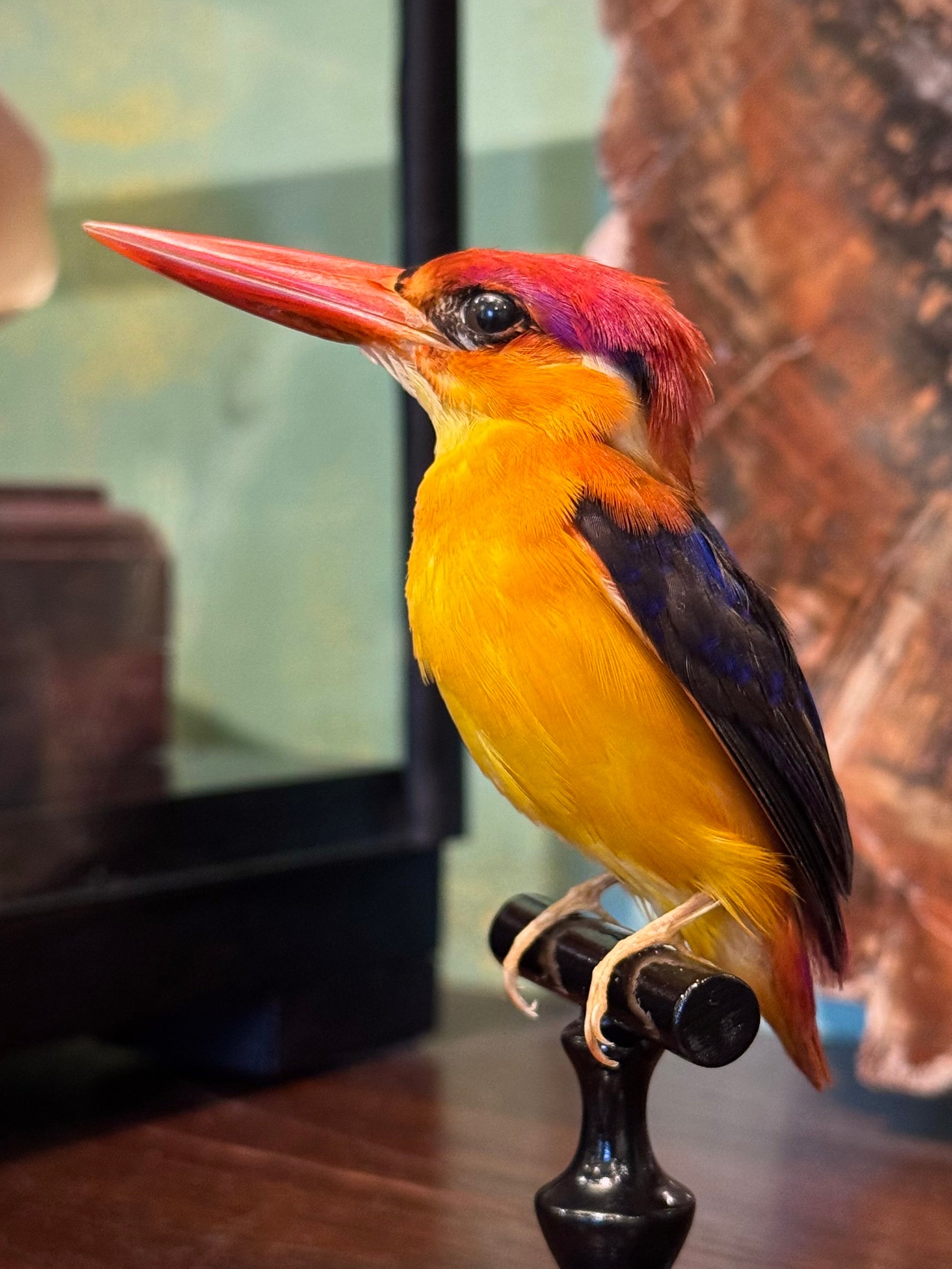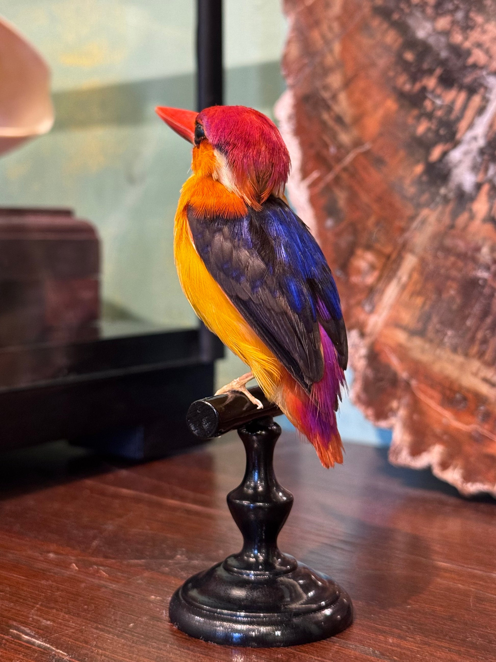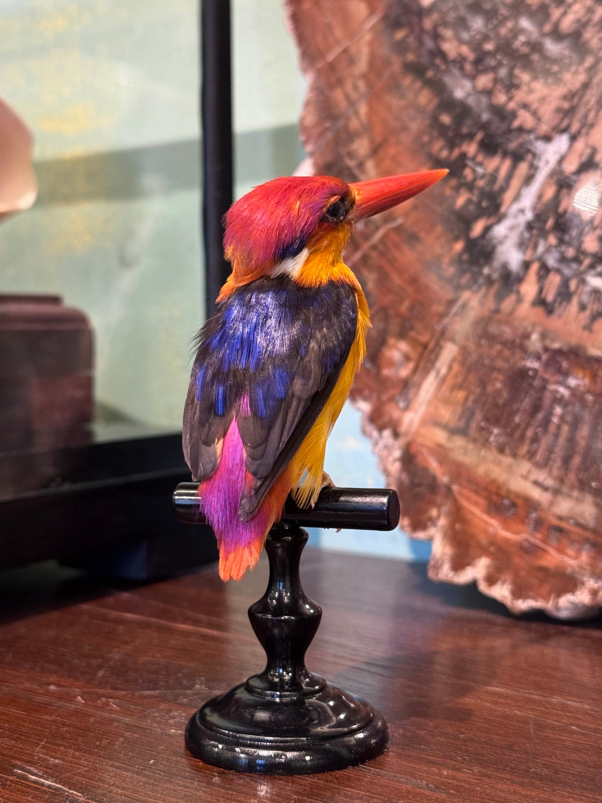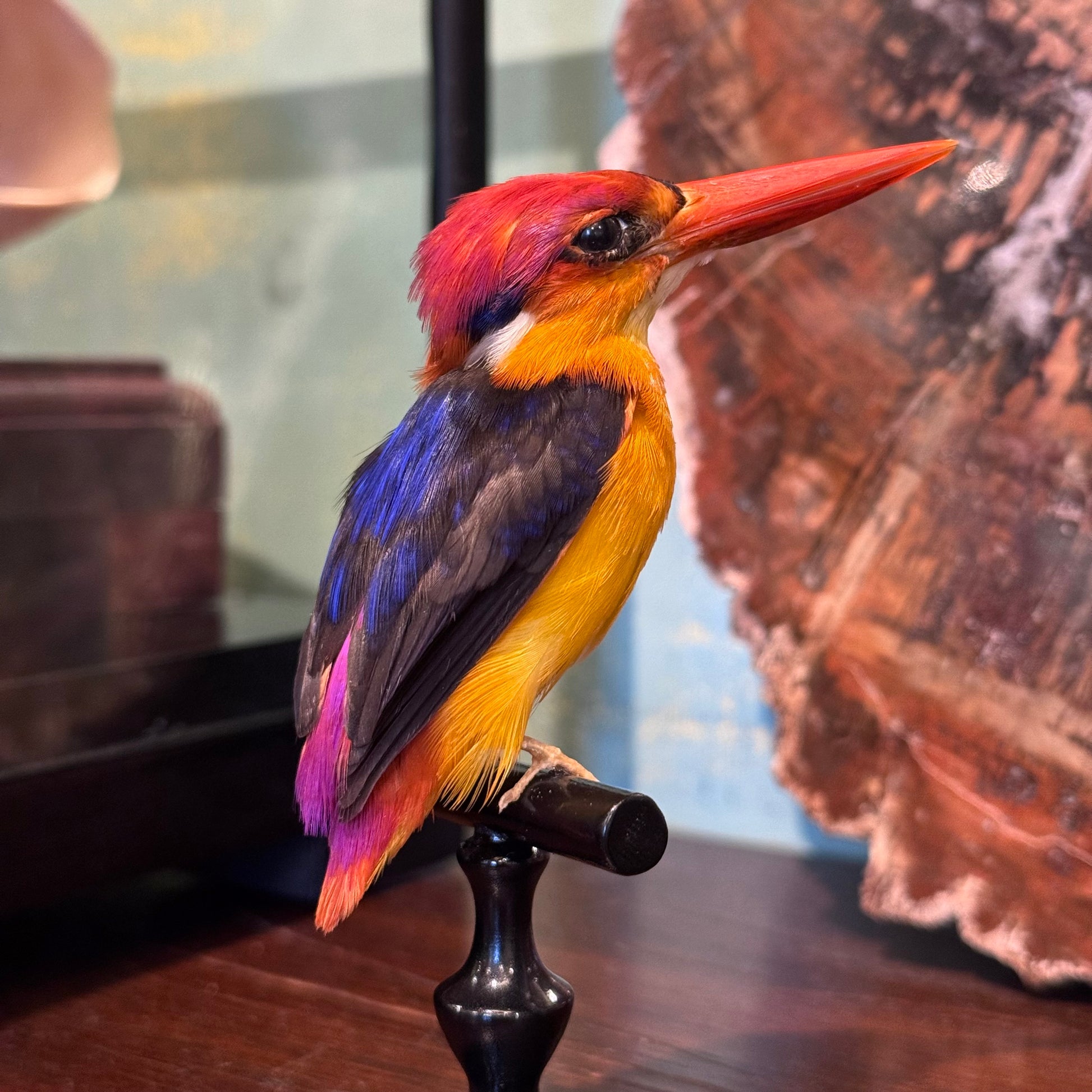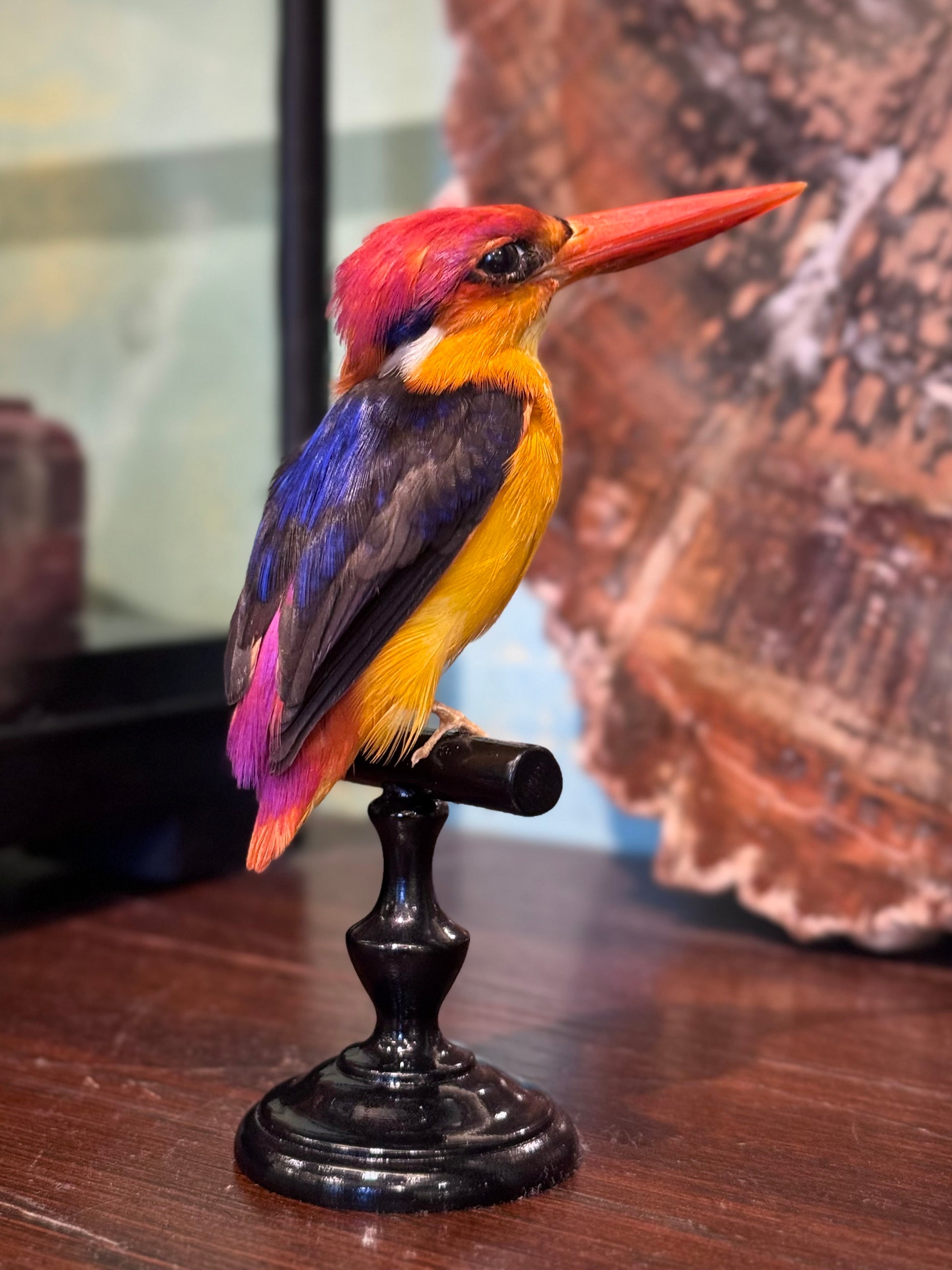 Le plumage incandescent de ce martin-pêcheur pourpré mêle le lila, le bleu roi, le orange et le jaune dans une harmonie presque irréelle. Avec son bec corail et son regard brillant, ce petit oiseau vit à l’ombre des feuillages, près des ruisseaux où il chasse insectes et petits poissons. Rarement aperçu, ses couleurs rivalisent avec les papillons et les fleurs des tropiques.