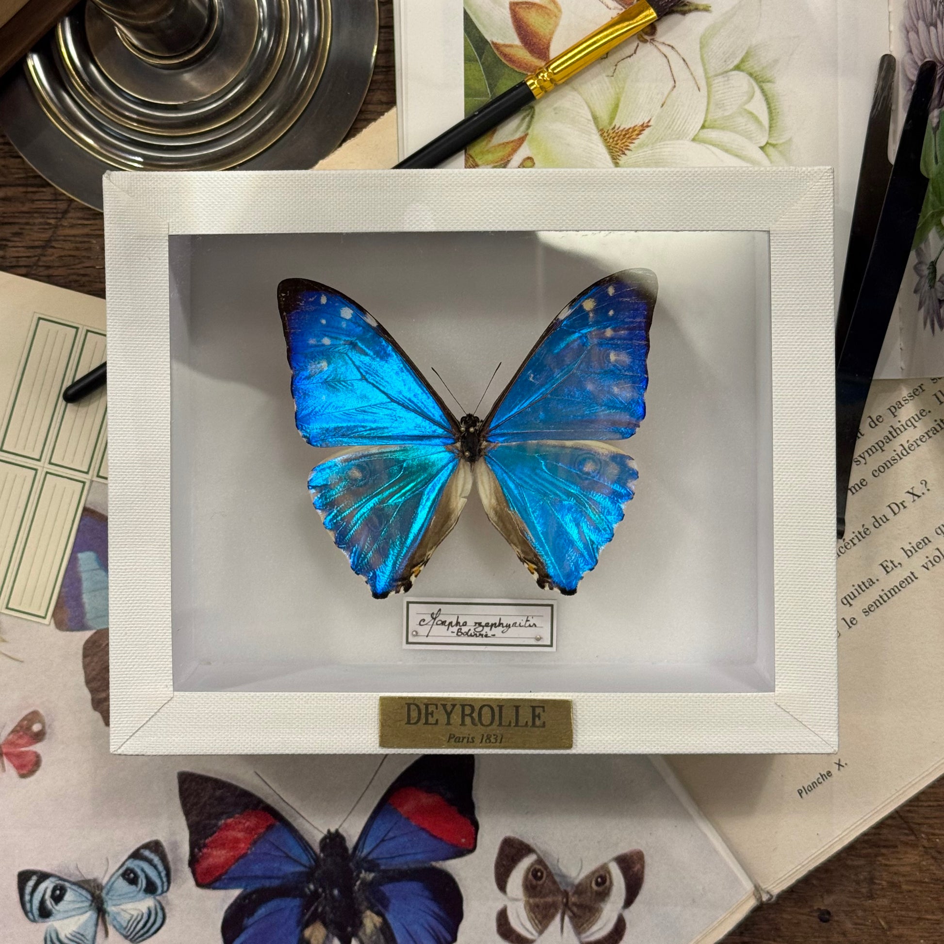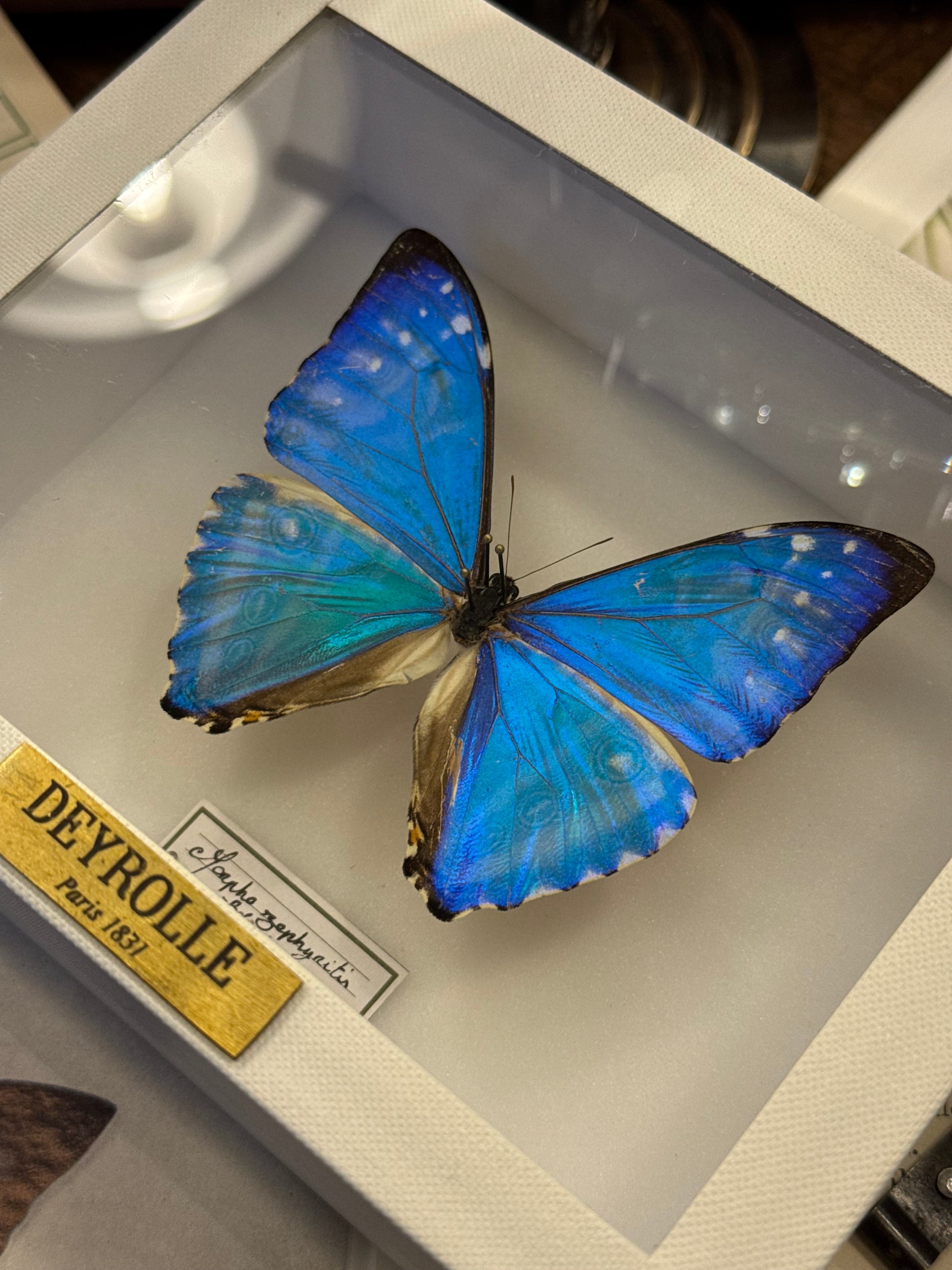 Reconnaissable à son bleu et ses reflets électriques, le Morpho zephyritis est l’un des morphos les plus recherchés pour sa luminosité exceptionnelle. Jouez avec la perspective pour révéler un mauve léger iridescent.