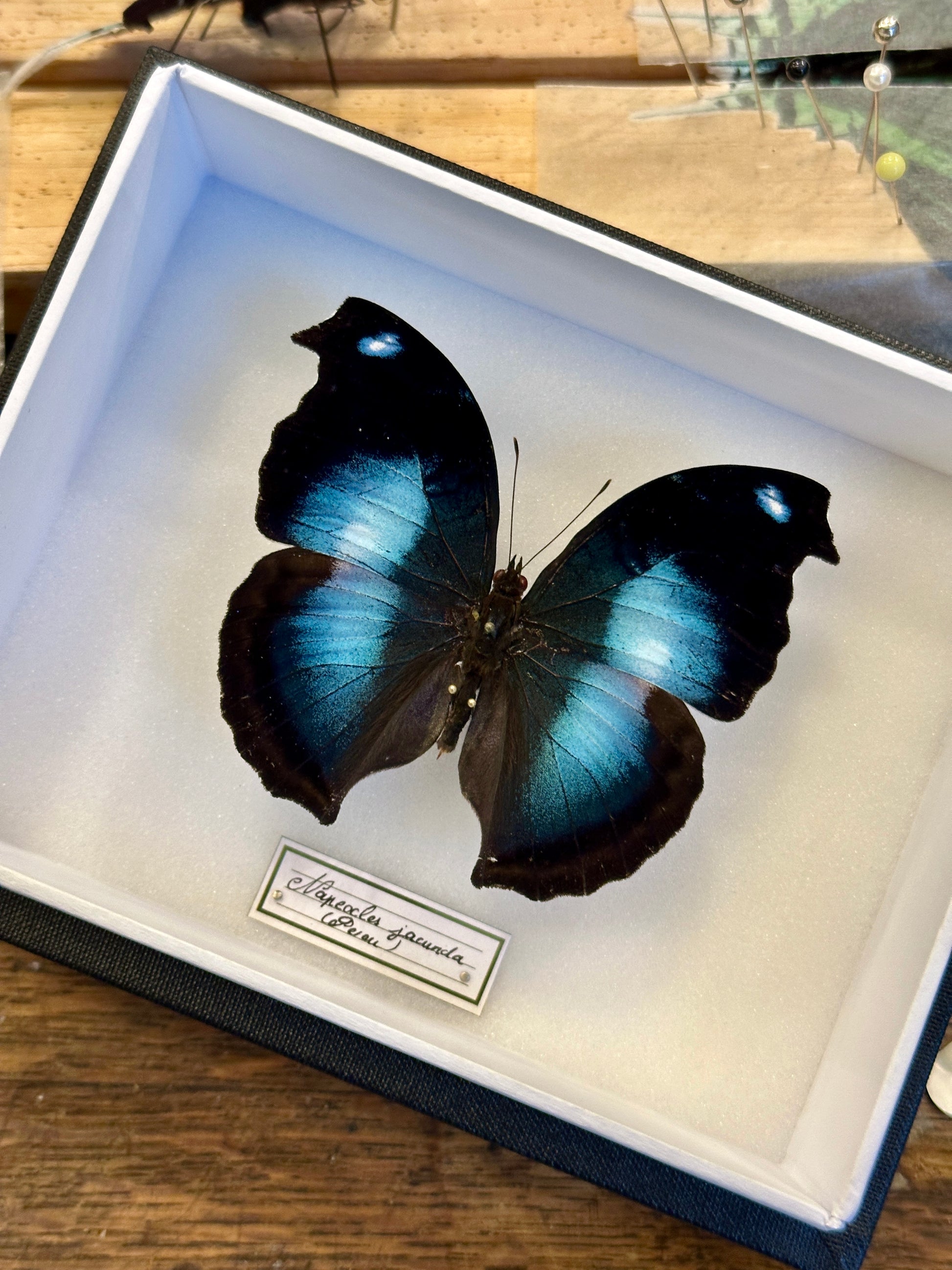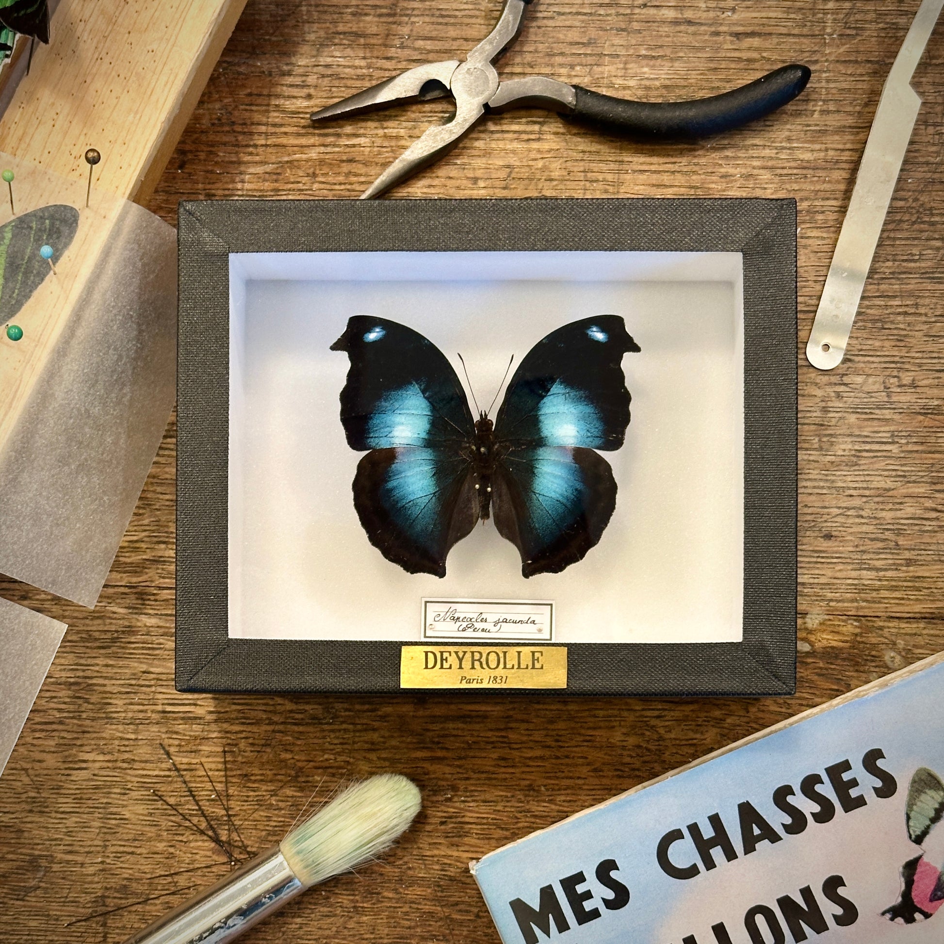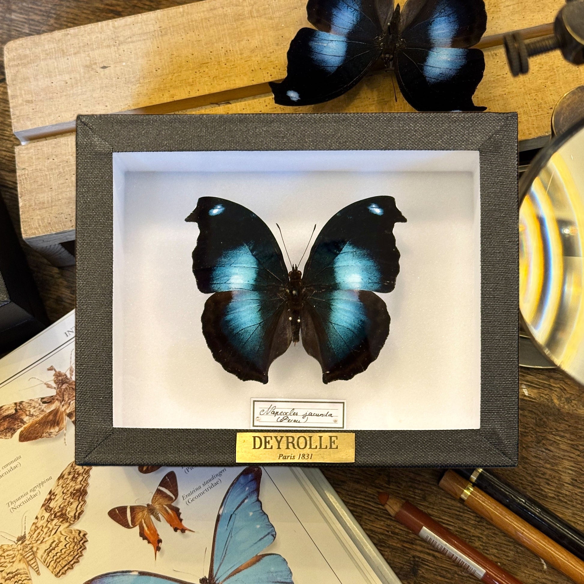 Ce Napeocles jucunda, papillon des forêts tropicales d’Amérique du Sud, dévoile un bleu lumineux émergeant de son avers noir velouté. Cette irisation singulière a souvent valu à l’espèce d’être confondue avec certains Morphos, bien qu’elle appartienne à une lignée différente de Nymphalidae.