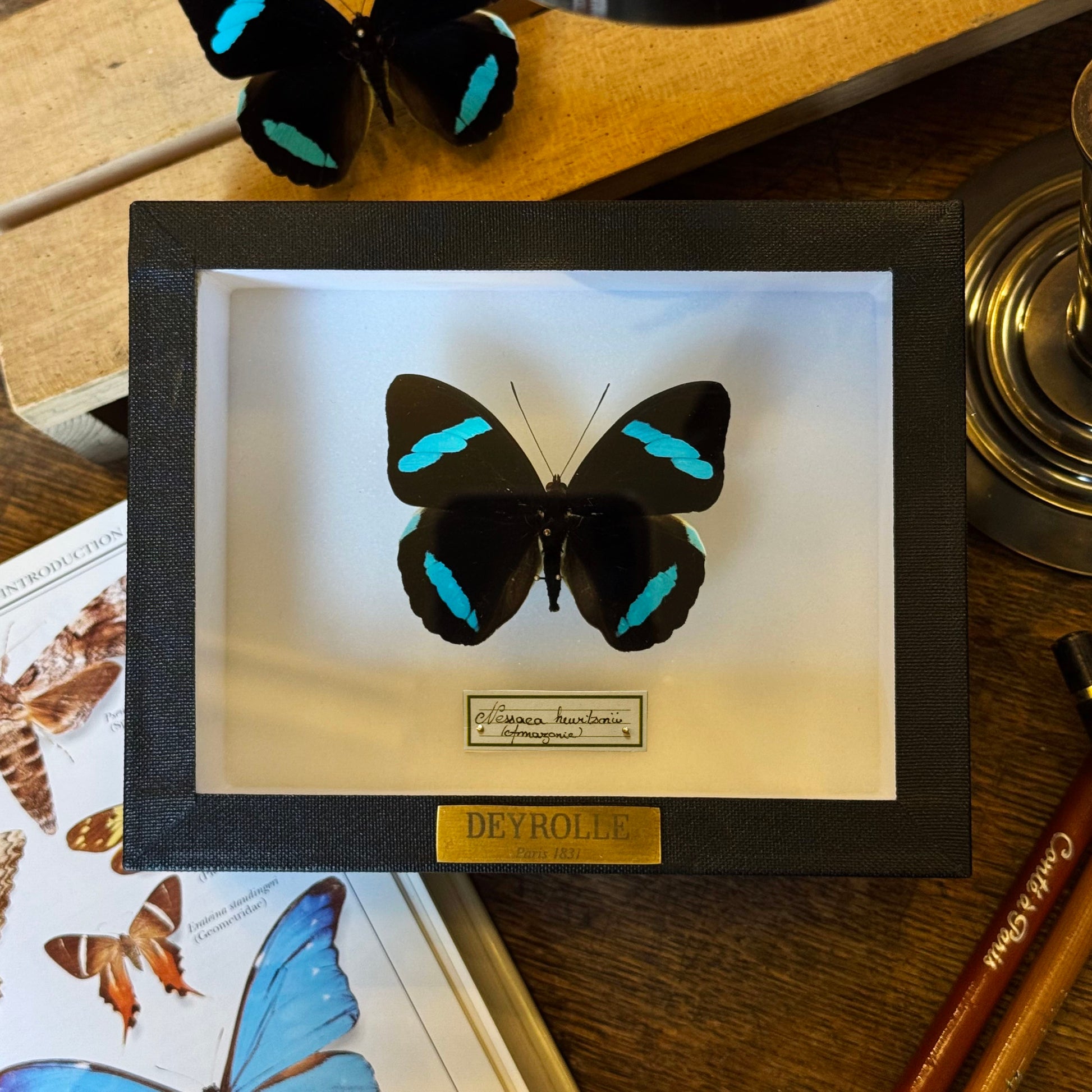 Présenté dans une boîte hermétique vitrée à accrocher, il est sublimé par un cadre noir sur fond blanc. Chaque spécimen est soigneusement identifié par une étiquette calligraphiée, mentionnant son nom latin et son origine. Une plaque en laiton gravée du nom de Deyrolle certifie l’authenticité de cette pièce unique, issue de nos collections.