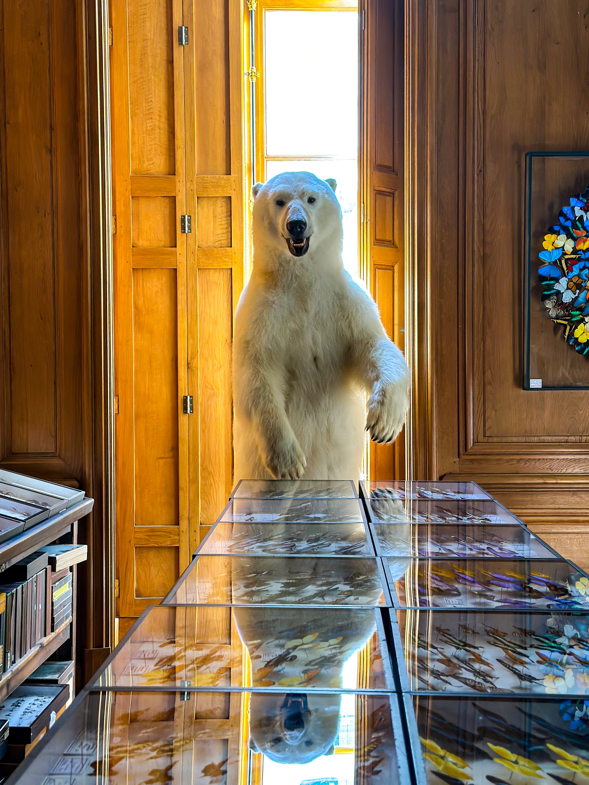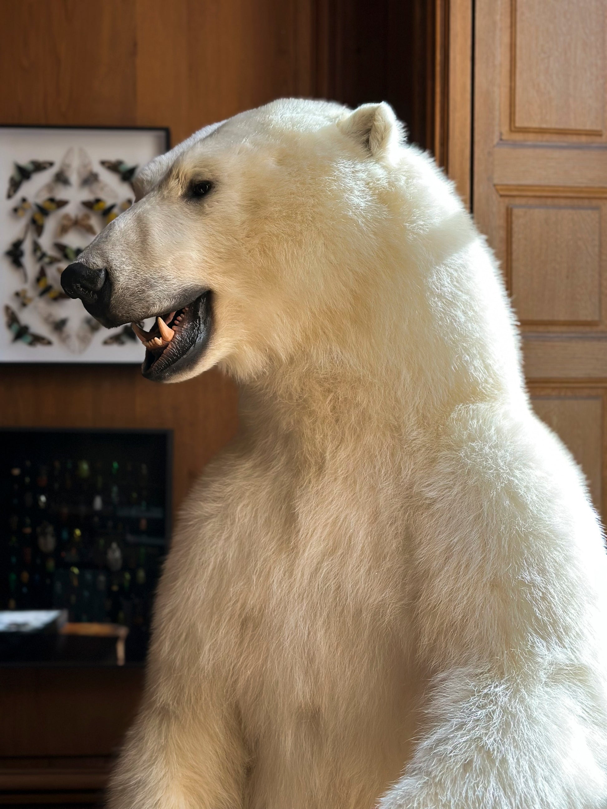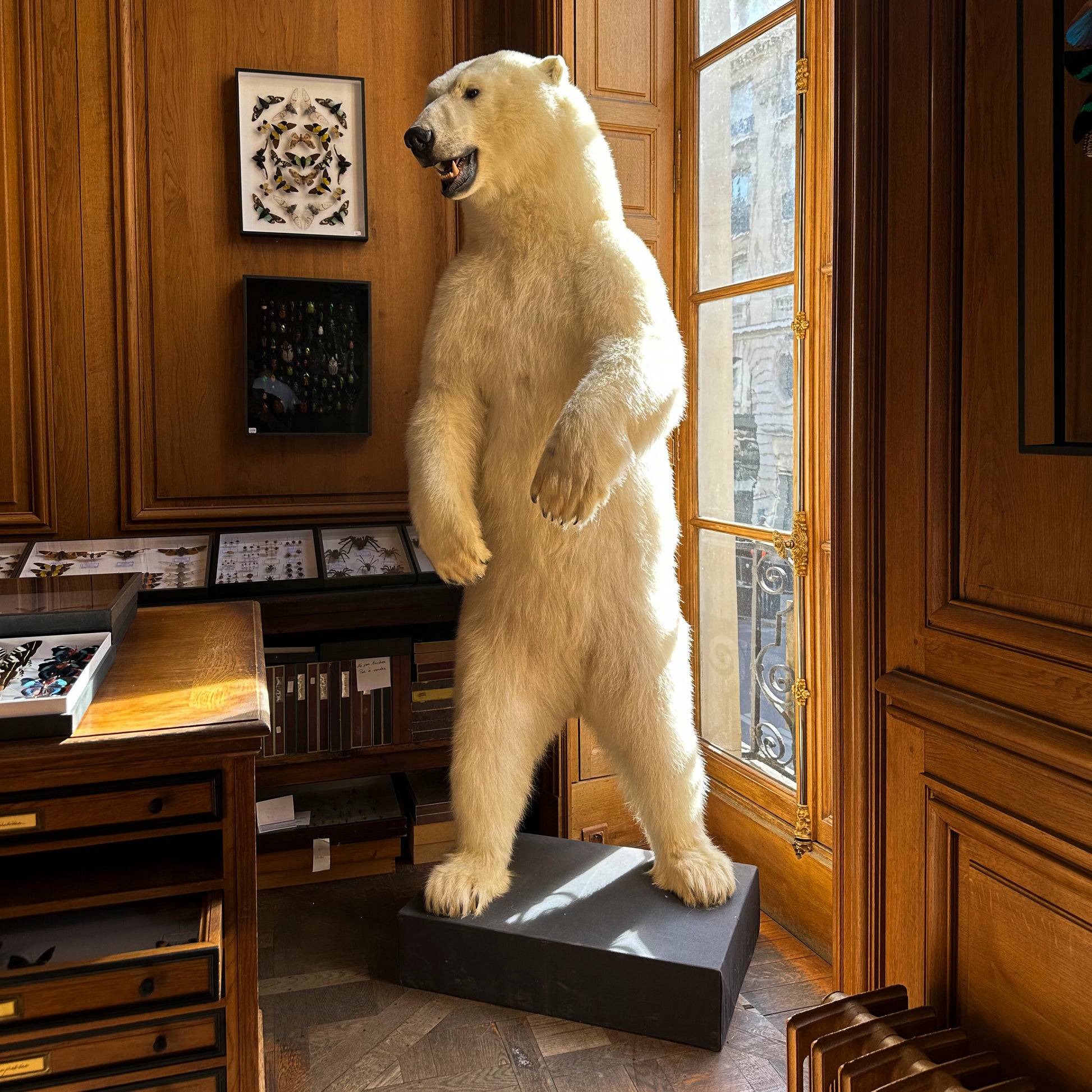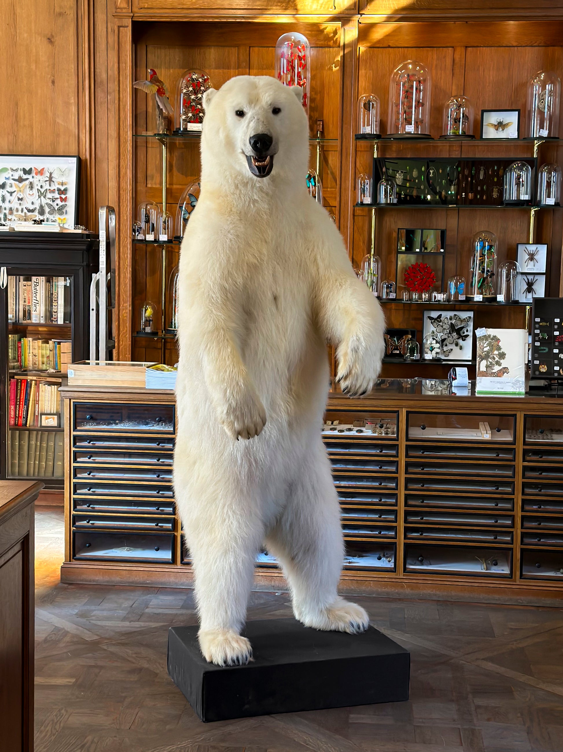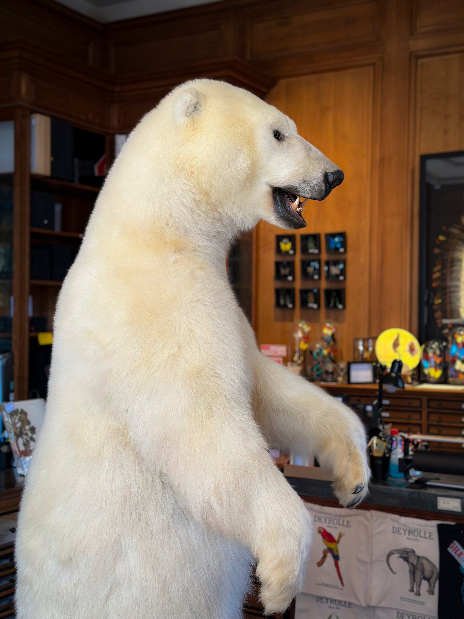 Sous son pelage translucide et sa peau noire, tout chez le Ursus maritimus est pensé pour survivre au froid extrême. Naturaliser un ours polaire, c’est rendre visible la densité d’un corps taillé pour le froid. La Maison Deyrolle a rarement la chance de compter des ours polaire parmi ses collections, ce qui ajoute une valeur historique à cette pièce.