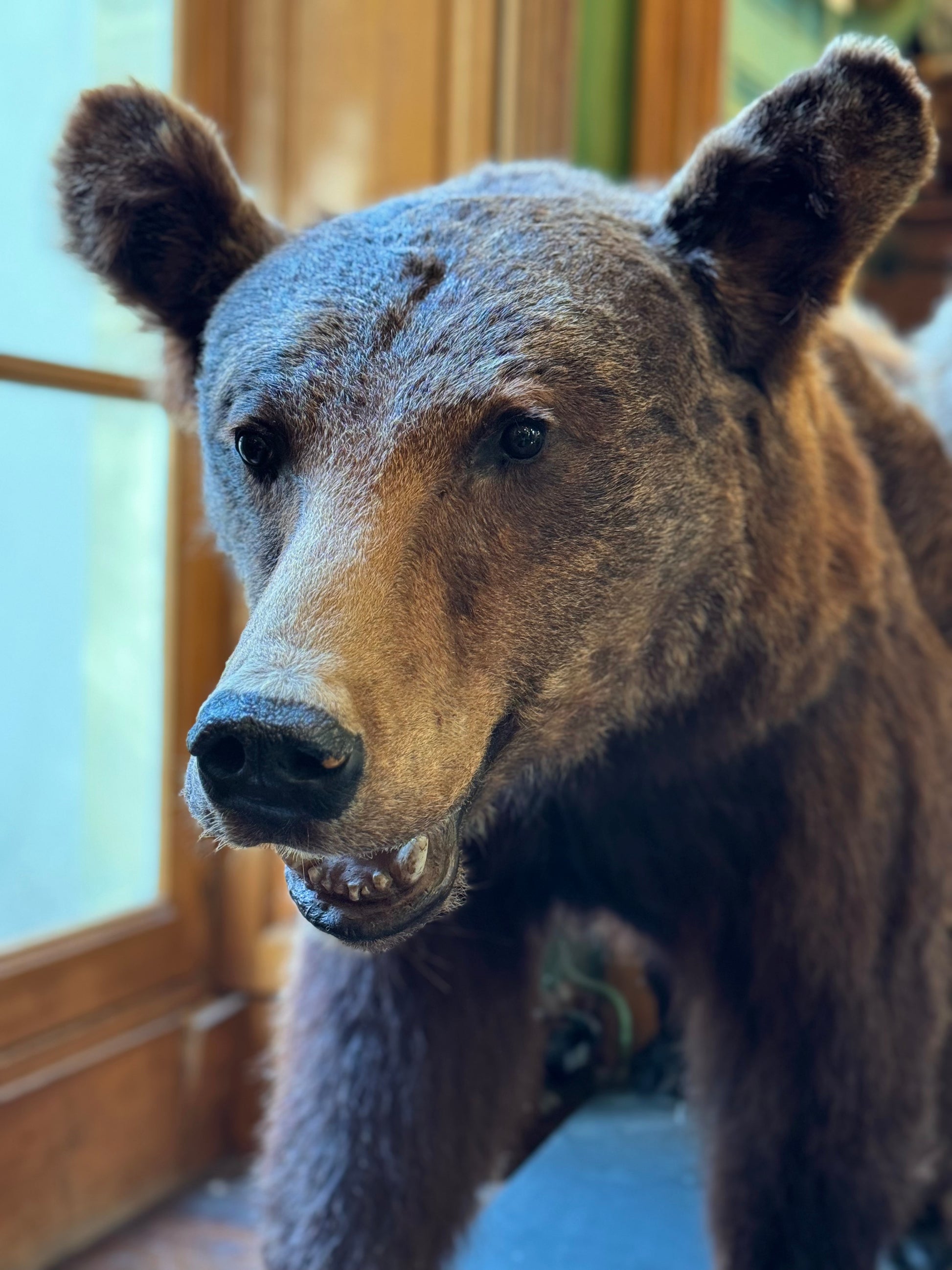 Scène tendre et puissante à la fois, cette ourse brune s'avance d’un pas sûr, protectrice et majestueuse, tandis que son ourson s’appuie sur elle, confiant.