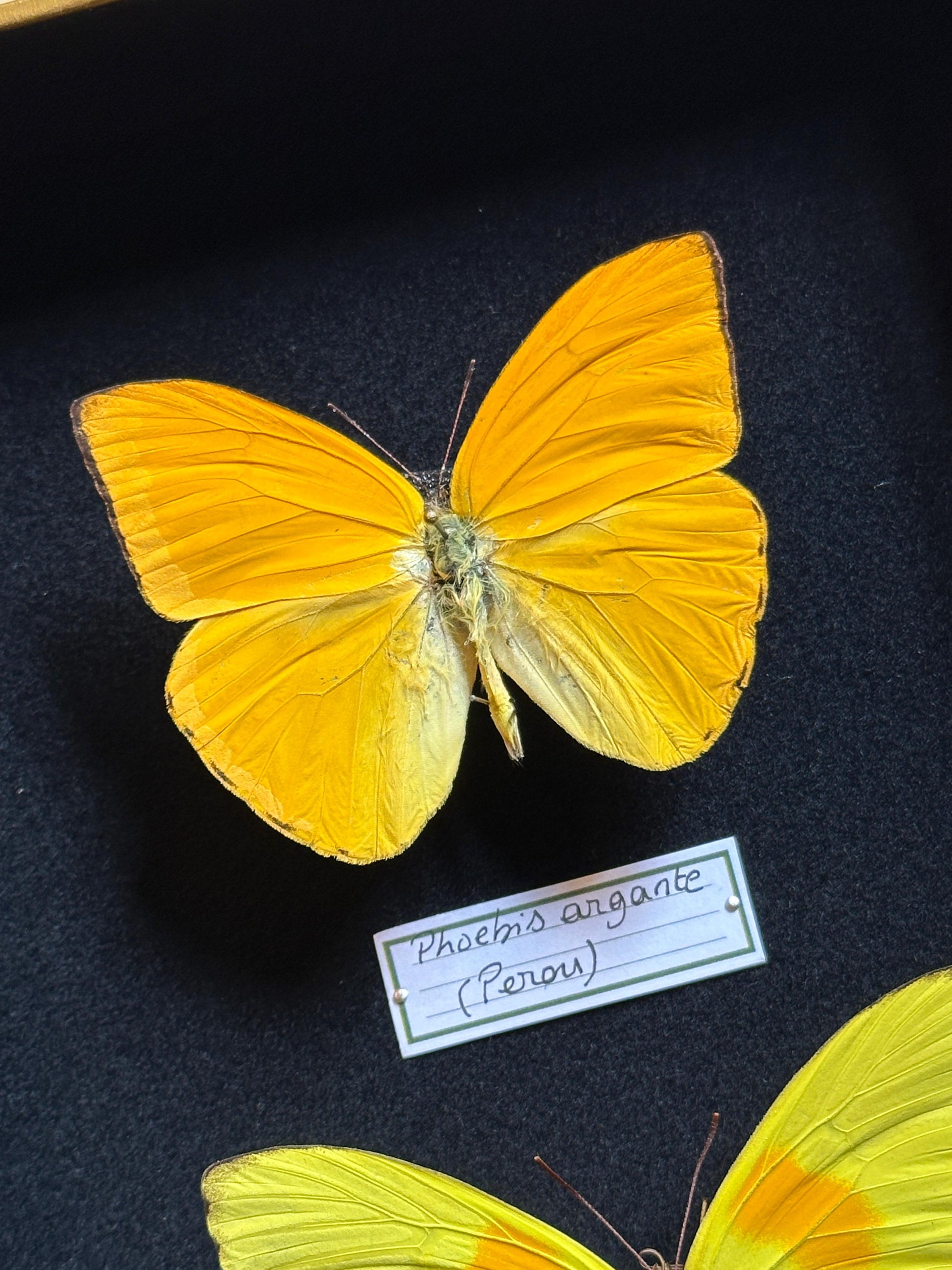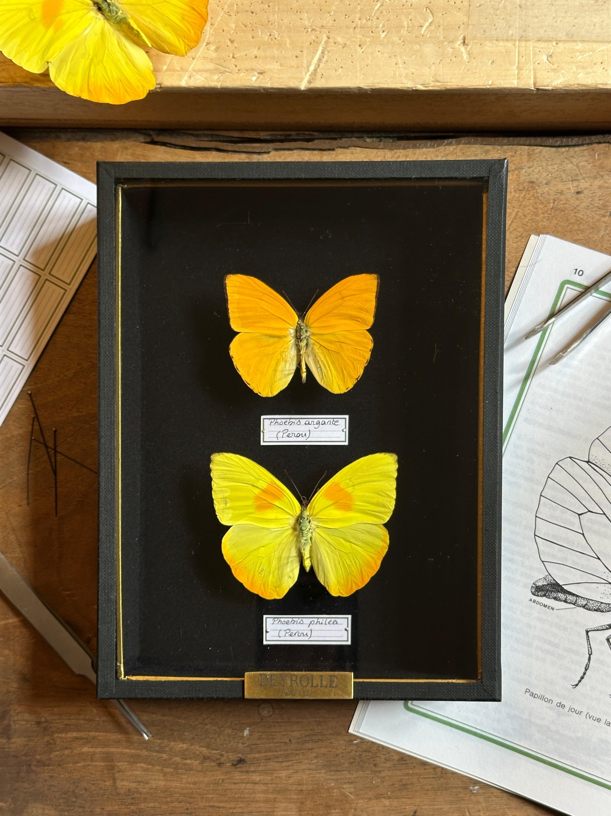 Présentés dans une boîte hermétique vitrée à accrocher, ils sont sublimés par un cadre noir sur fond noir. Chaque spécimen est soigneusement identifié par une étiquette calligraphiée, mentionnant son nom latin et son origine. Une plaque en laiton gravée du nom de Deyrolle certifie l’authenticité de cette pièce unique, issue de nos collections.
