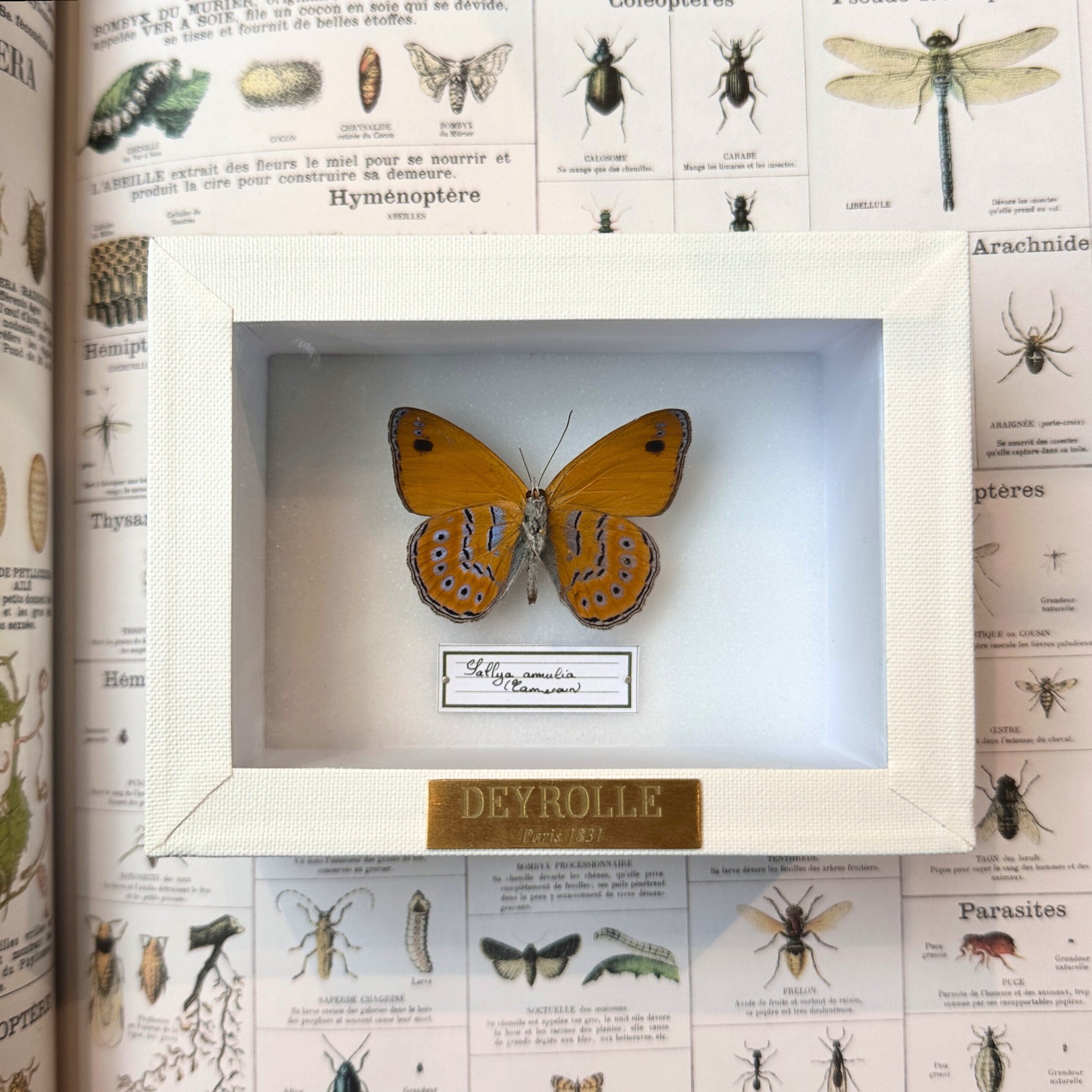 Éclat de cuivre et reflets d’azur, le Sallya amulia illumine les forêts du Cameroun. Disposé de sa face ventrale, ce papillon de la famille des Lycaenidae séduit par l’intensité de son orange flamboyant, rehaussé de motifs bleutés aux allures de bijoux émaillés.