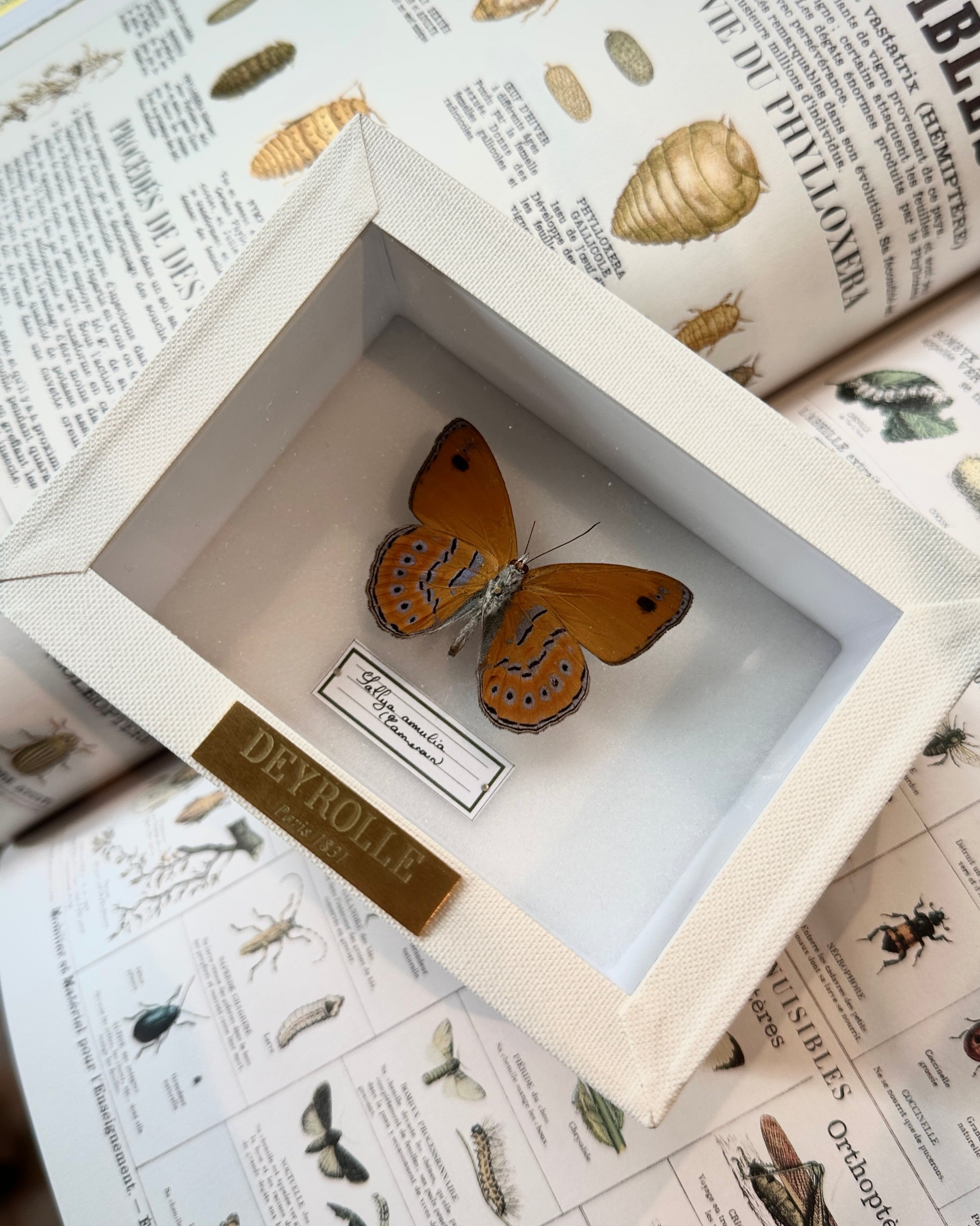 Présenté dans une boîte hermétique vitrée à accrocher, il est sublimé par un cadre noir sur fond blanc. Chaque spécimen est soigneusement identifié par une étiquette calligraphiée, mentionnant son nom latin et son origine. Une plaque en laiton gravée du nom de Deyrolle certifie l’authenticité de cette pièce unique, issue de nos collections.