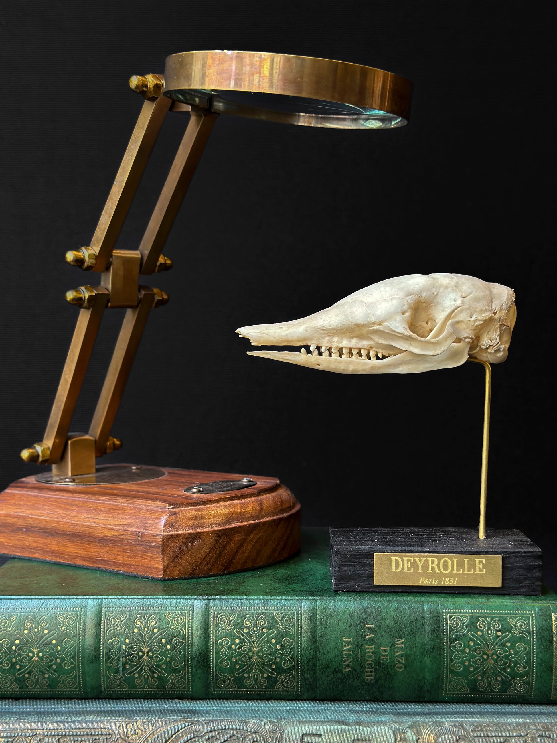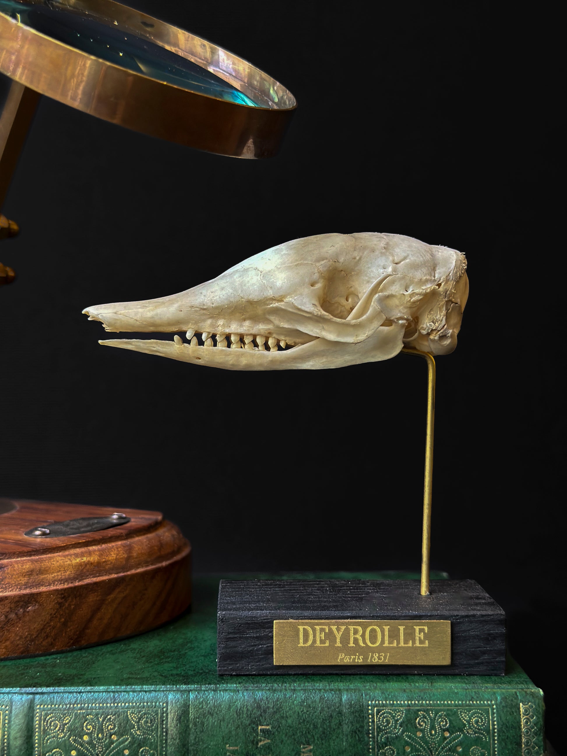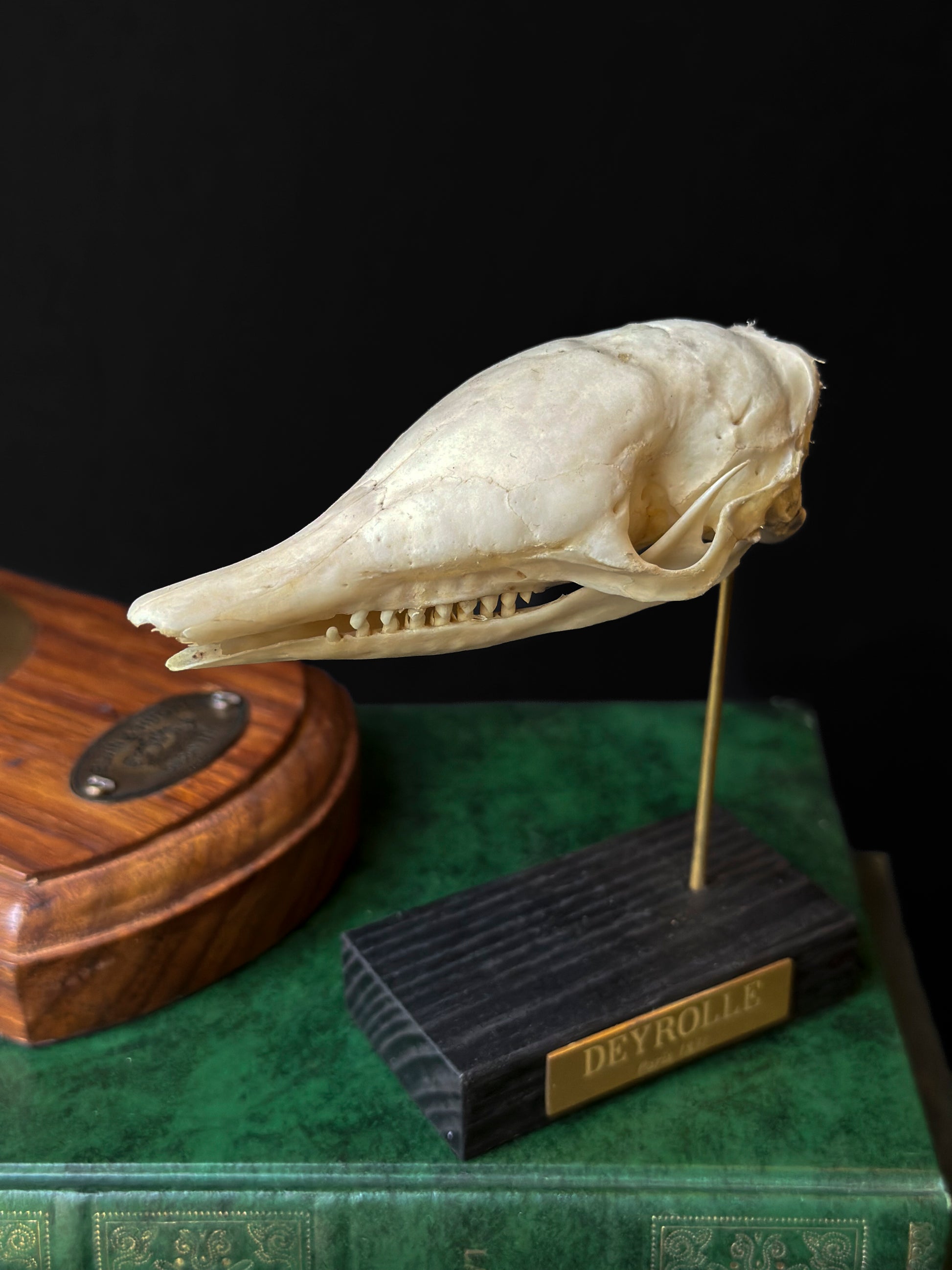 Ce crâne de tatou à neuf bandes (Dasypus novemcinctus), mammifère xénarthre emblématique des Amériques, se distingue par son rostre allongé et étroit, adapté à l’exploration des sols meubles, ainsi que par une dentition homodonte composée de petites dents cylindriques spécialisées dans un régime insectivore. La structure osseuse légère, l’arc zygomatique réduit et les larges fosses nasales témoignent d’une évolution tournée vers le fouissage et la recherche de proies souterraines, telles que fourmis, termites et autres invertébrés. Ce spécimen a été soigneusement monté sur socle dans nos ateliers afin d’en préserver l’intégrité anatomique et d’en offrir une présentation à la fois pédagogique et esthétique.