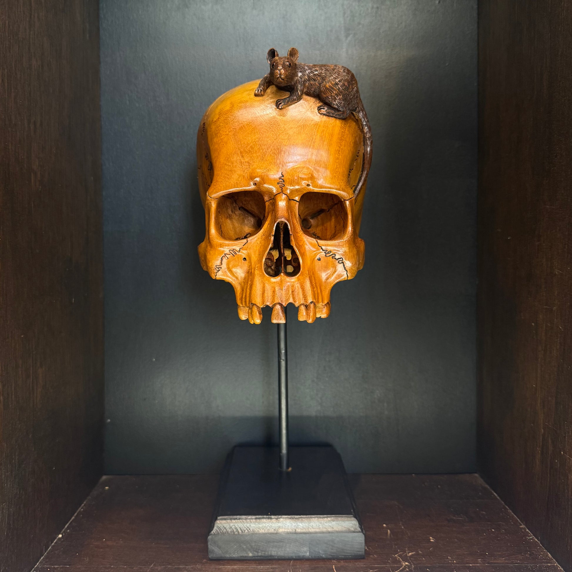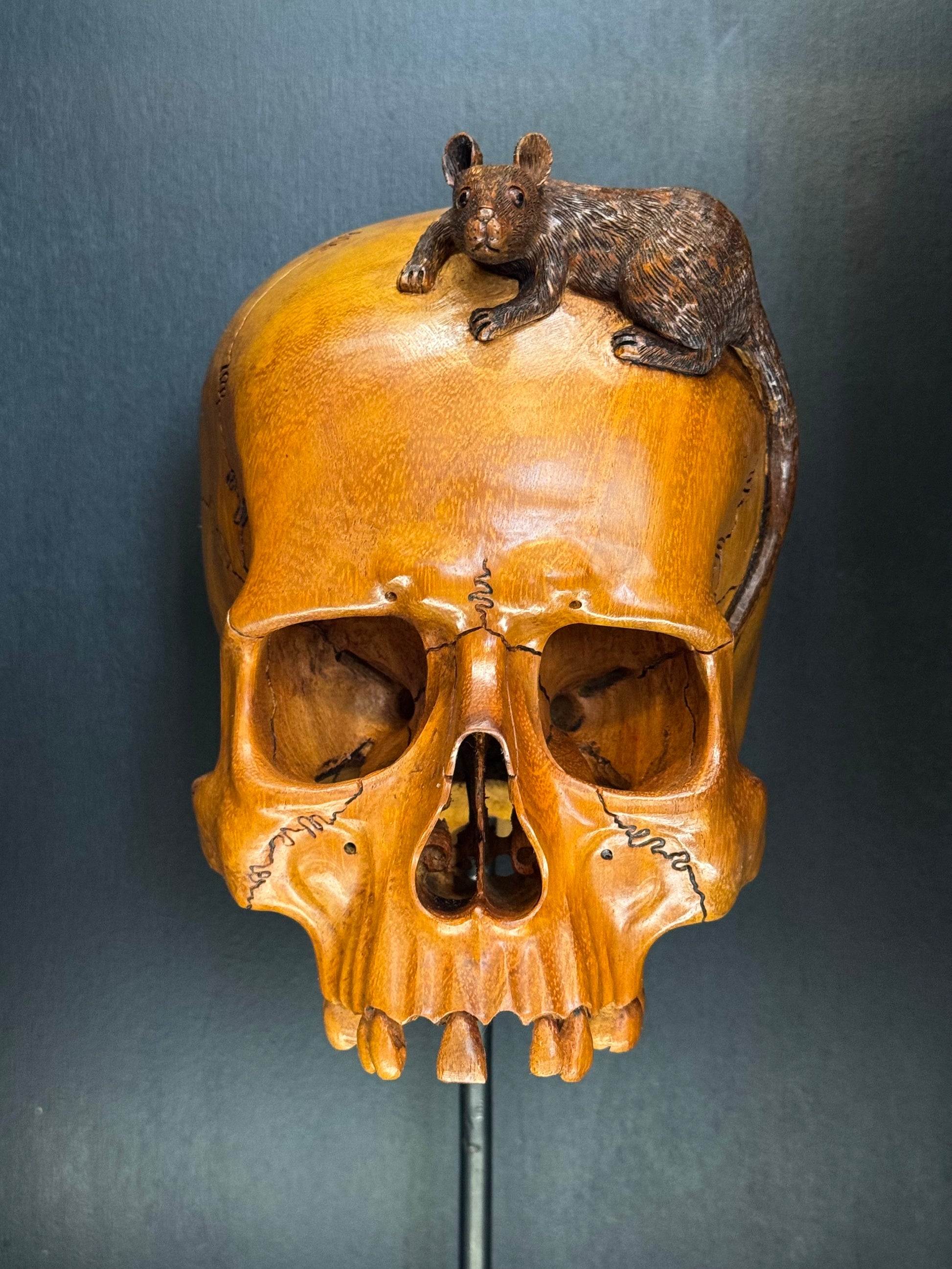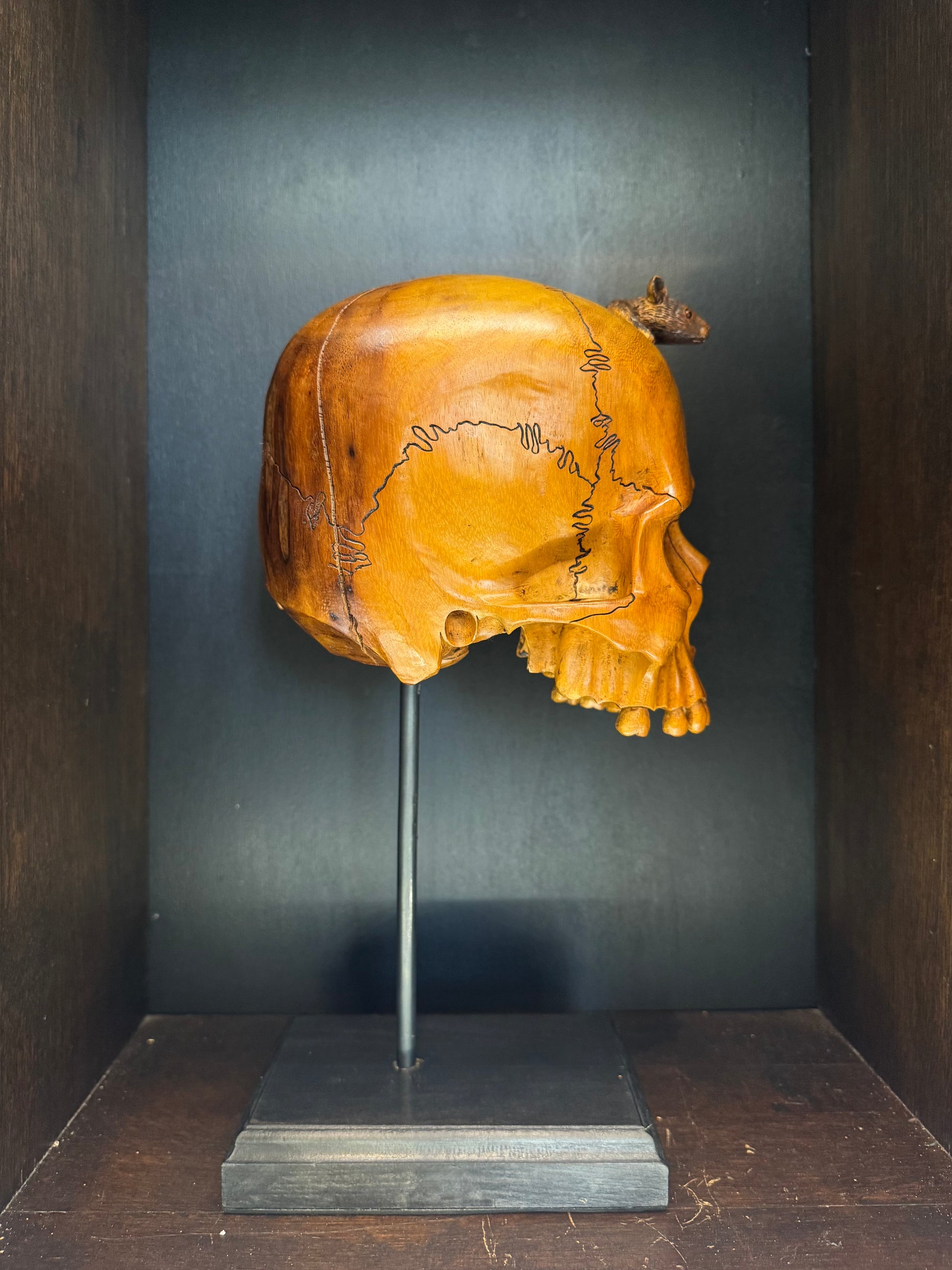 Finement taillée dans un bois aux reflets dorés, la pièce exhibe les sutures anatomiques du crâne humain, rehaussées de gravures nervurées. L’animal introduit une touche d’ironie et de mouvement dans cette composition où la mort dialogue avec la vie. Cette sculpture évoque les cabinets de curiosités du XVIIIᵉ siècle, où chaque objet invitait à contempler la fragilité de l’existence.